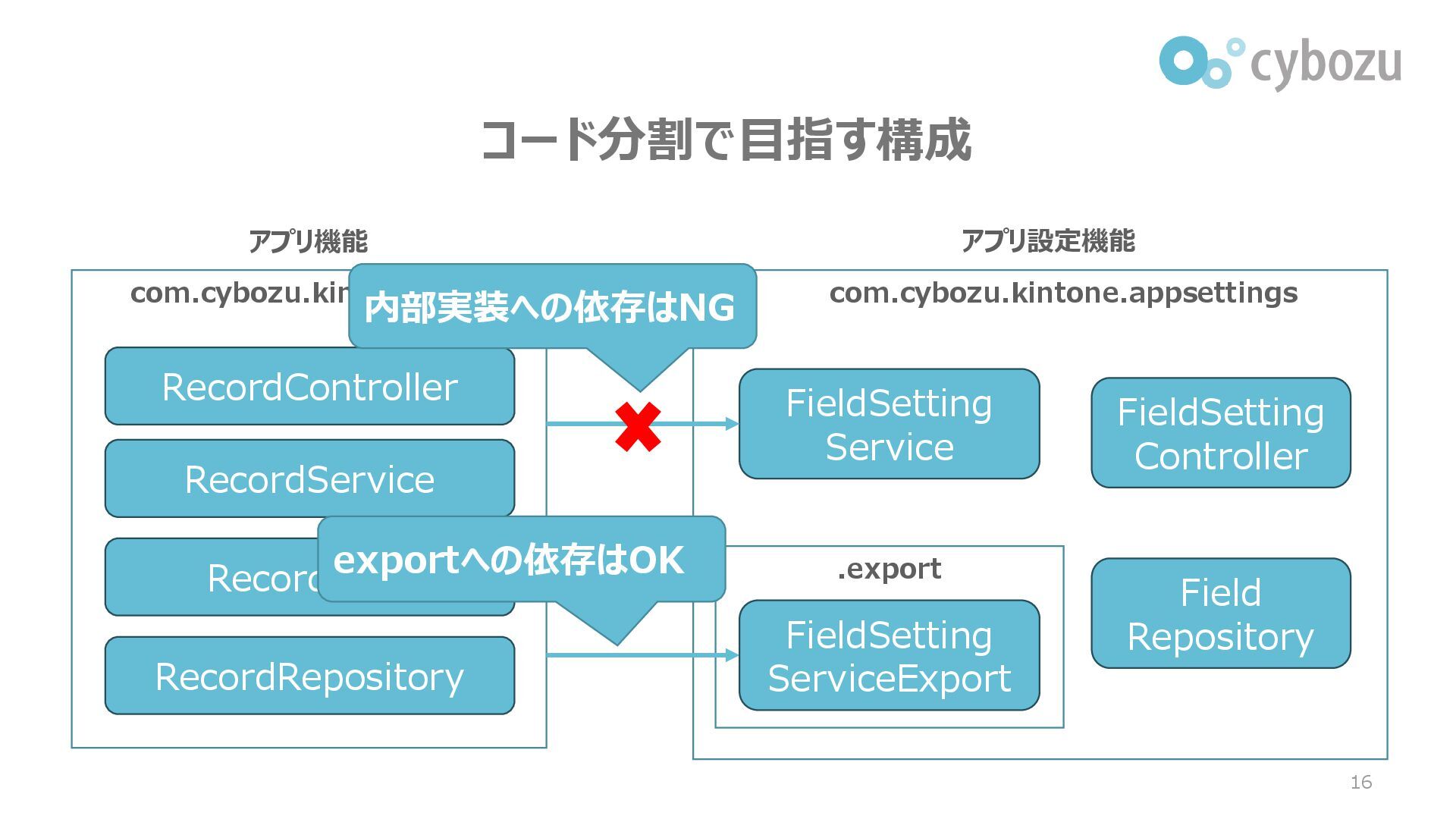 コード分割で目指す構成 15 com.cybozu.kintone.appsettings アプリ機能 アプリ設定機能 com.cybozu.kintone.app FieldSetting Controller FieldSetting Service