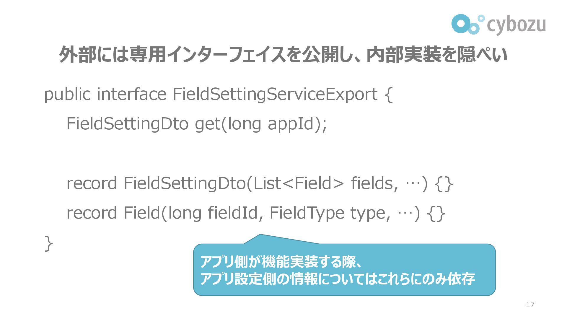 外部には専用インターフェイスを公開し、内部実装を隠ぺい public interface FieldSettingServiceExport { FieldSettingDto get(long appId); record FieldSettingDto(List<Field>