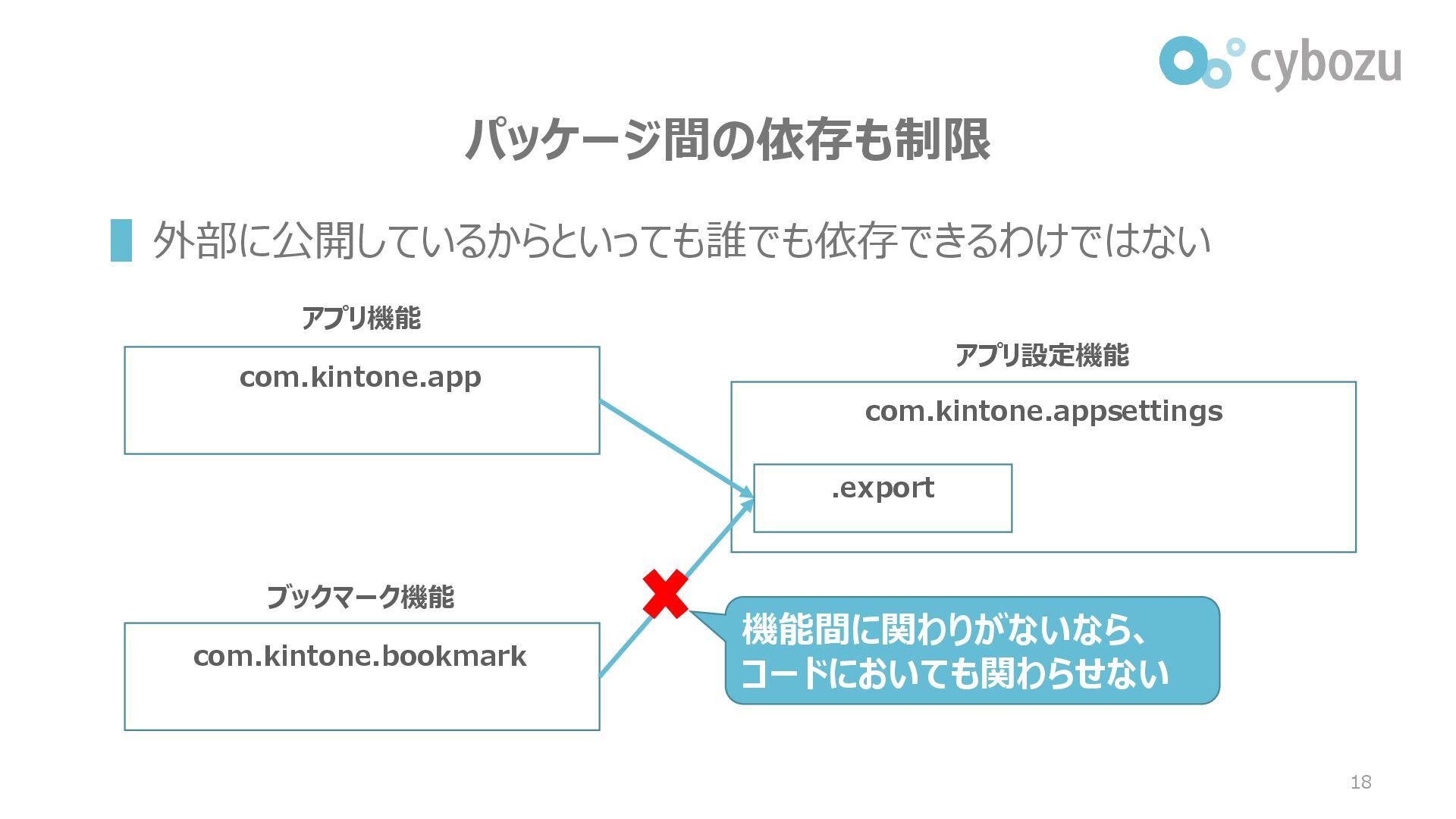 パッケージ間の依存も制限 ▌外部に公開しているからといっても誰でも依存できるわけではない 18 com.kintone.appsettings アプリ機能 アプリ設定機能 com.kintone.app ブックマーク機能 com.kintone.bookmark 機能間に関わりがないなら、