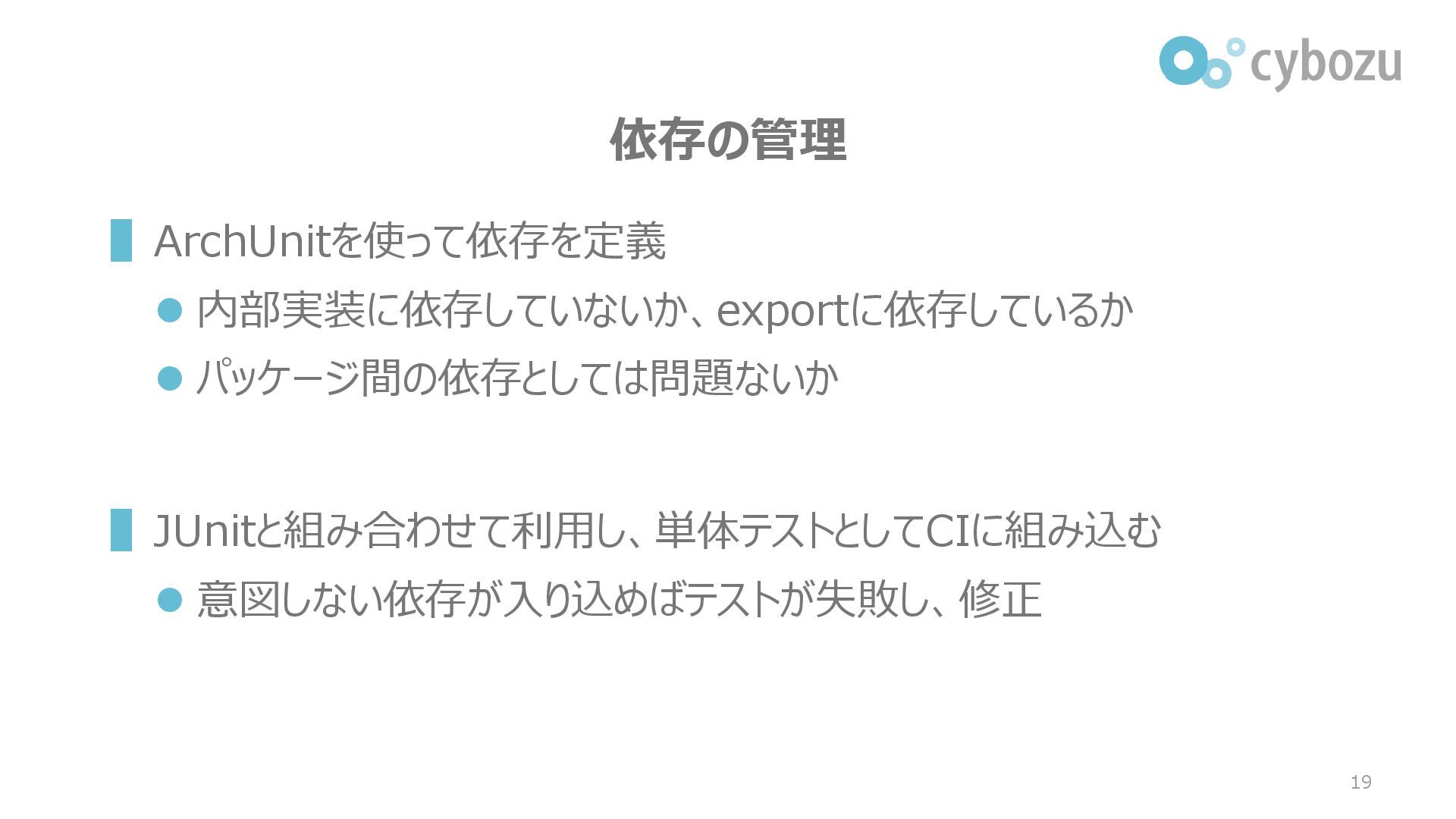 依存の管理 ▌ArchUnitを使って依存を定義 ⚫ 内部実装に依存していないか、exportに依存しているか ⚫ パッケージ間の依存としては問題ないか ▌JUnitと組み合わせて利用し、単体テストとしてCIに組み込む ⚫ 意図しない依存が入り込めばテストが失敗し、修正 19