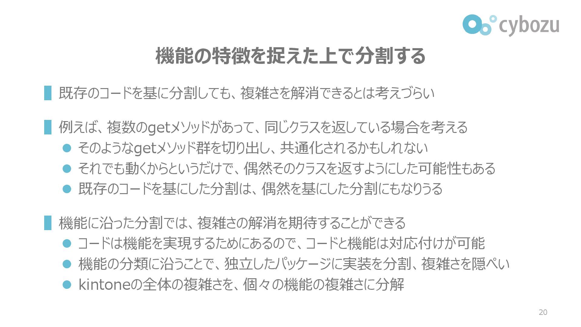 ⚫ コードは機能を実現するためにあるので、コードと機能は対応付けが可能 ⚫ 機能の分類に沿うことで、独立したパッケージに実装を分割、複雑さを隠ぺい ⚫ kintoneの全体の複雑さを、個々の機能の複雑さに分解 20