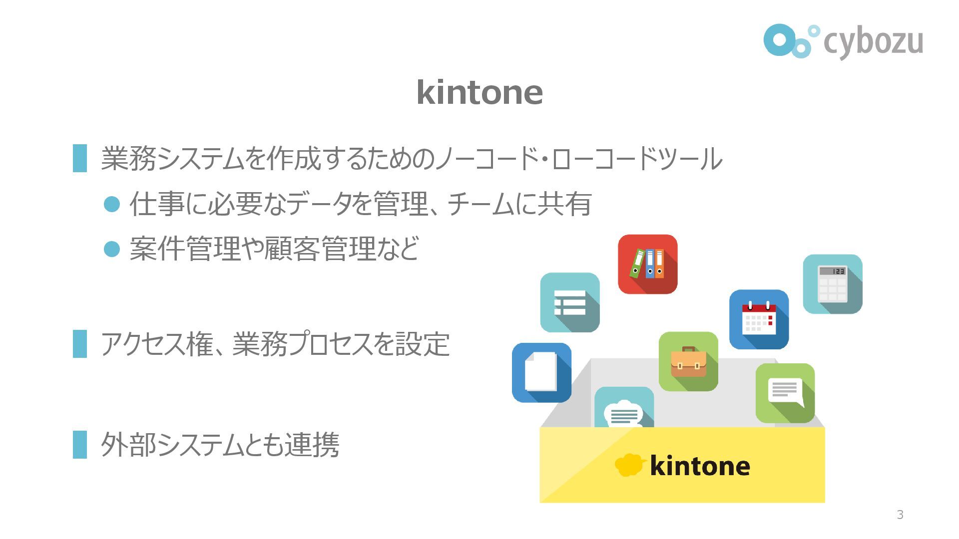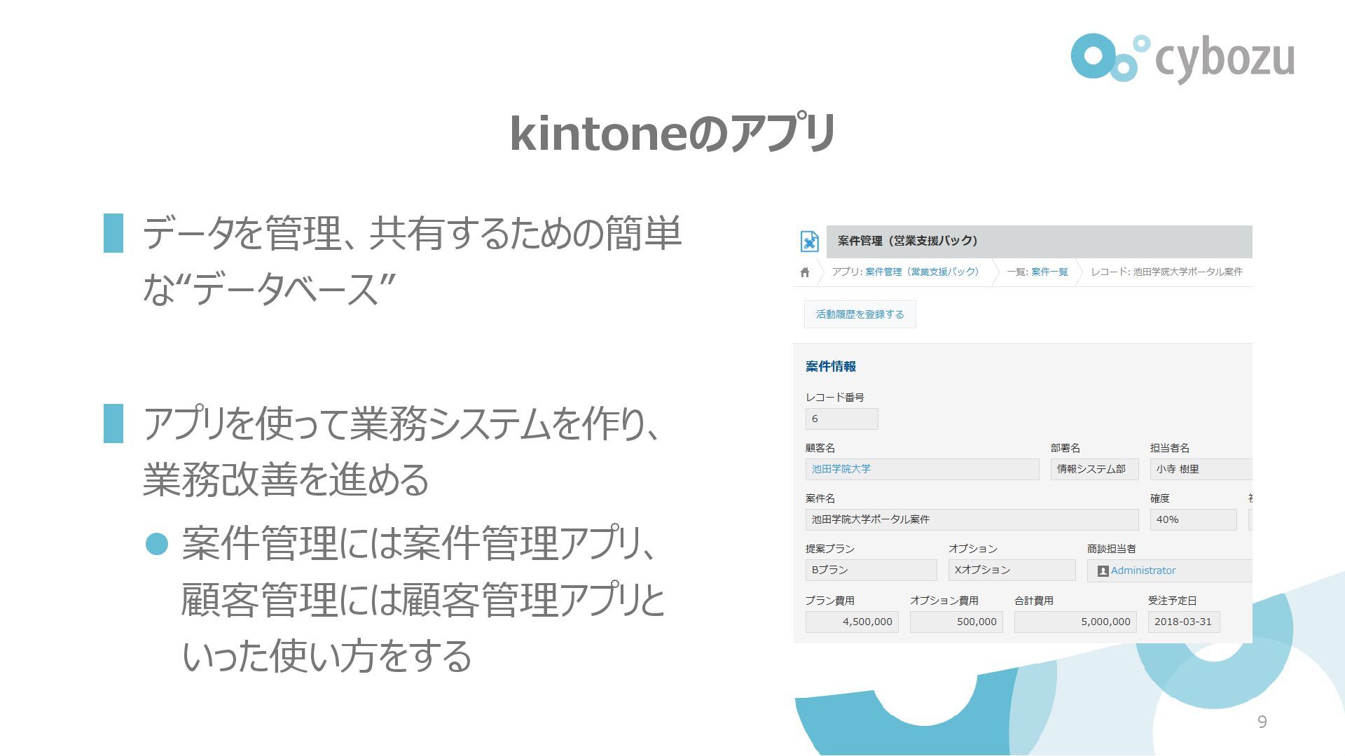 kintoneのアプリ ▌データを管理、共有するための簡単 な“データベース” ▌アプリを使って業務システムを作り、 業務改善を進める ⚫ 案件管理には案件管理アプリ、 顧客管理には顧客管理アプリと いった使い方をする 9