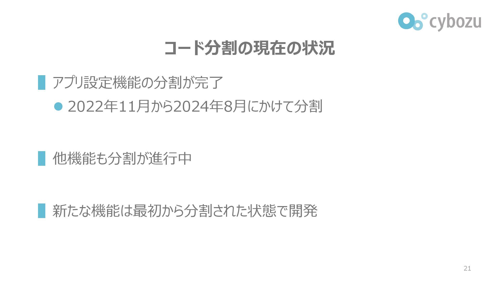 コード分割の現在の状況 ▌アプリ設定機能の分割が完了 ⚫ 2022年11月から2024年8月にかけて分割 ▌他機能も分割が進行中 ▌新たな機能は最初から分割された状態で開発 21
