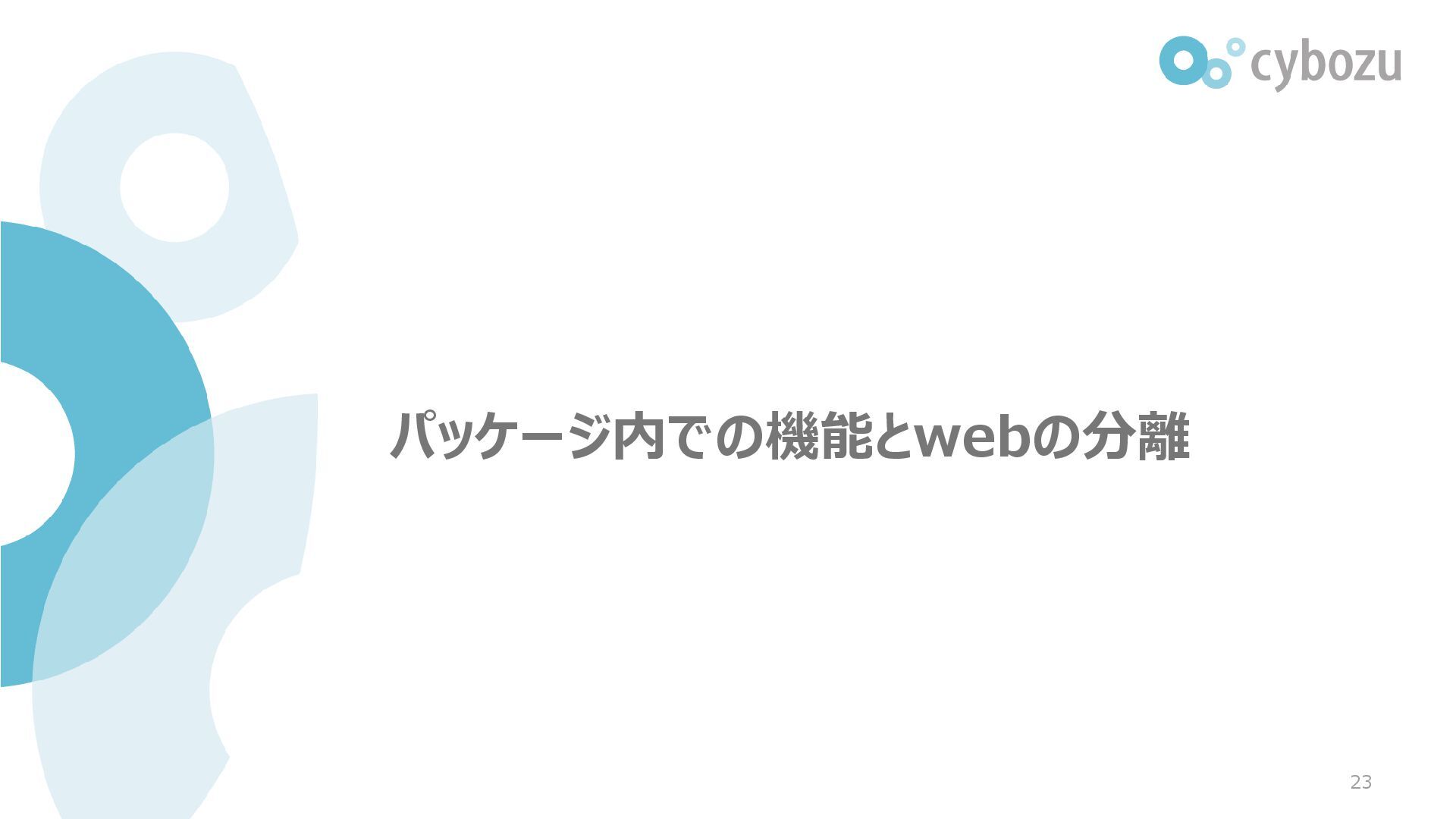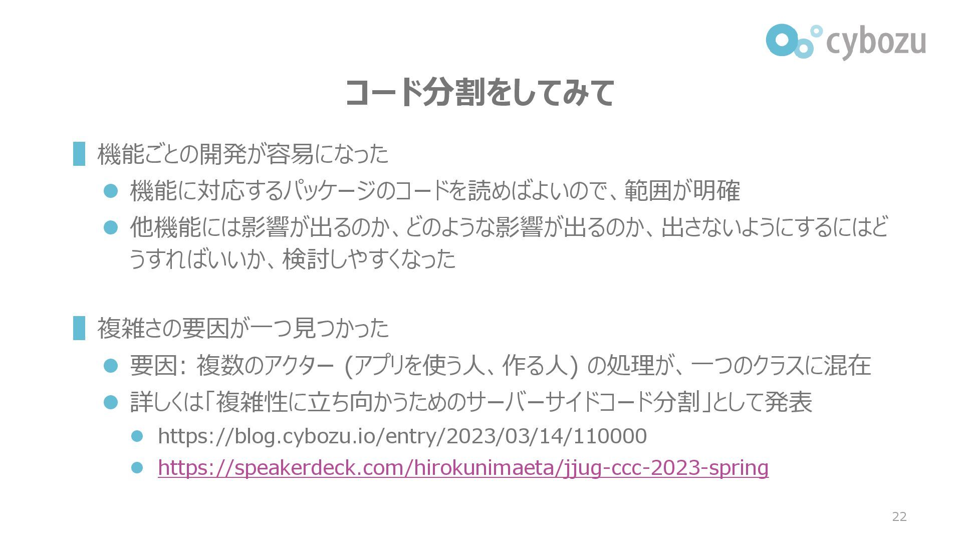 複数のアクター (アプリを使う人、作る人) の処理が、一つのクラスに混在 ⚫ 詳しくは「複雑性に立ち向かうためのサーバーサイドコード分割」として発表 ⚫ https://blog.cybozu.io/entry/2023/03/14/110000 ⚫ https://speakerdeck.com/hirokunimaeta/jjug-ccc-2023-spring 22