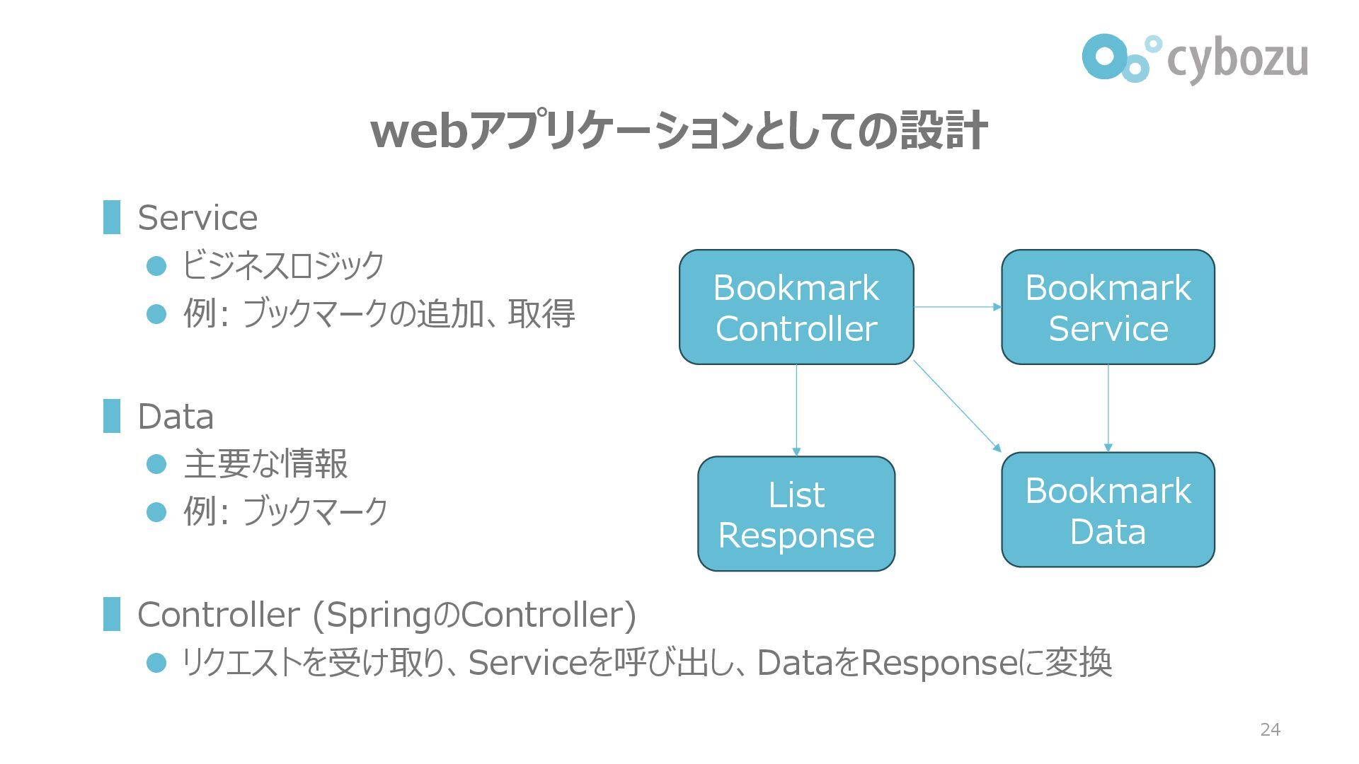⚫ 例: ブックマーク ▌Controller (SpringのController) ⚫ リクエストを受け取り、Serviceを呼び出し、DataをResponseに変換 24 Bookmark Service Bookmark Controller Bookmark Data List Response