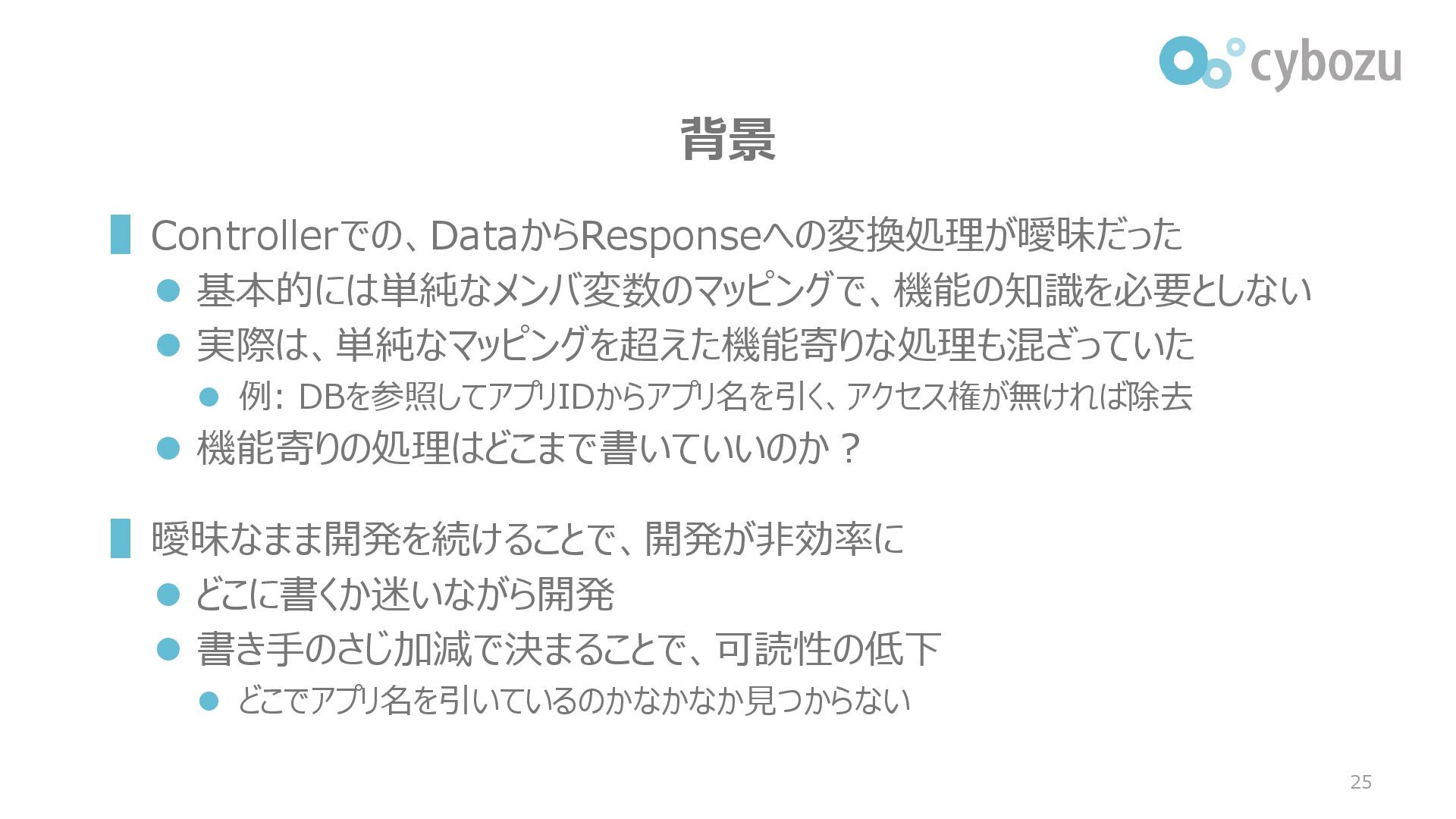 背景 ▌Controllerでの、DataからResponseへの変換処理が曖昧だった ⚫ 基本的には単純なメンバ変数のマッピングで、機能の知識を必要としない ⚫ 実際は、単純なマッピングを超えた機能寄りな処理も混ざっていた ⚫ 例: DBを参照してアプリIDからアプリ名を引く、アクセス権が無ければ除去 ⚫