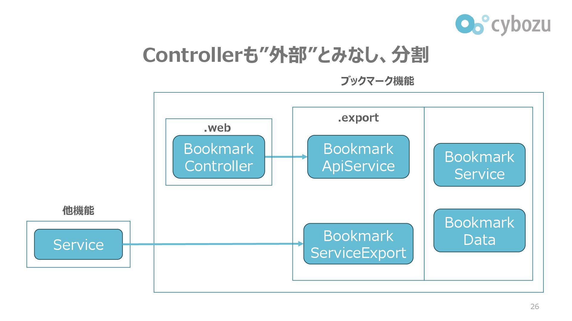 Controllerも”外部”とみなし、分割 26 ブックマーク機能 他機能 Service Bookmark ServiceExport .export Bookmark ApiService