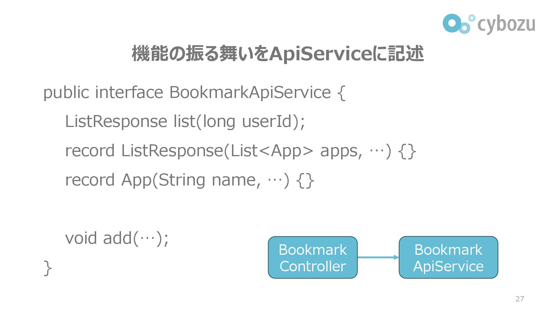 機能の振る舞いをApiServiceに記述 public interface BookmarkApiService { ListResponse list(long userId); record ListResponse(List<App>