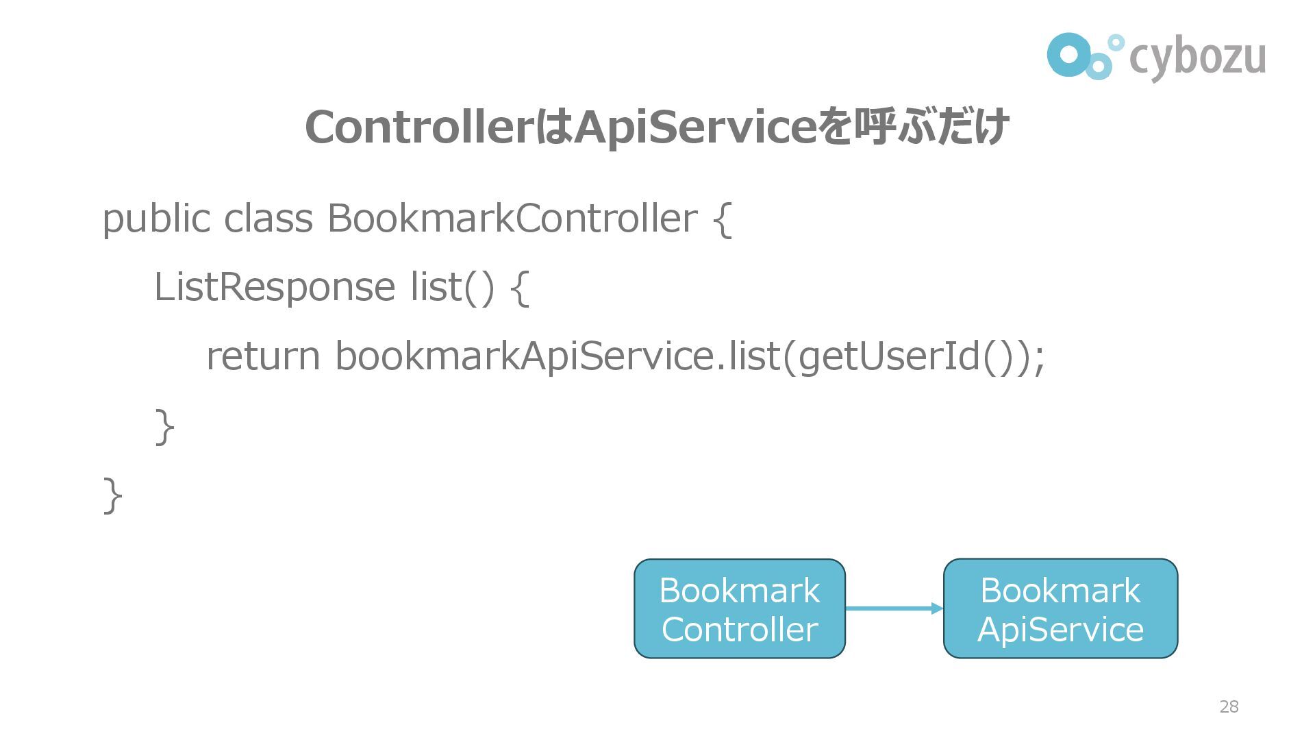 ControllerはApiServiceを呼ぶだけ public class BookmarkController { ListResponse list() { return bookmarkApiService.list(getUserId());