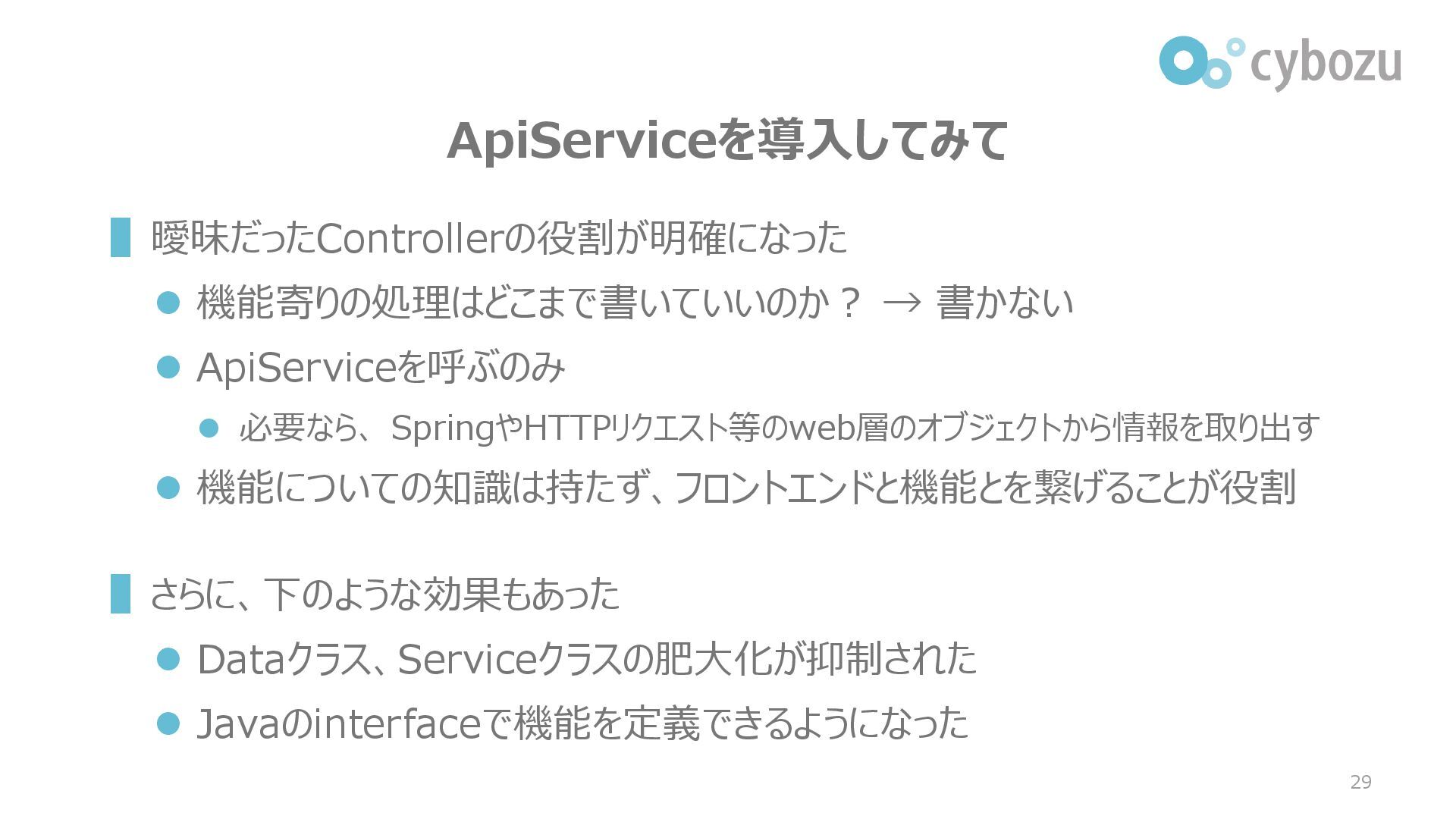 SpringやHTTPリクエスト等のweb層のオブジェクトから情報を取り出す ⚫ 機能についての知識は持たず、フロントエンドと機能とを繋げることが役割 ▌さらに、下のような効果もあった ⚫ Dataクラス、Serviceクラスの肥大化が抑制された ⚫ Javaのinterfaceで機能を定義できるようになった 29