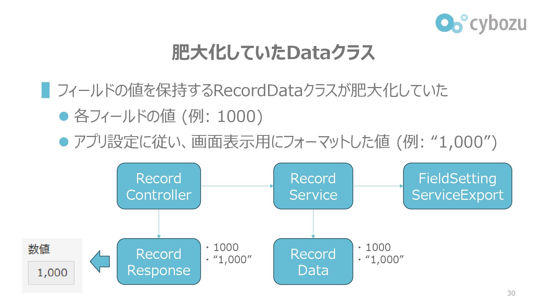 肥大化していたDataクラス ▌フィールドの値を保持するRecordDataクラスが肥大化していた ⚫ 各フィールドの値 (例: 1000) ⚫ アプリ設定に従い、画面表示用にフォーマットした値 (例: “1,000”)