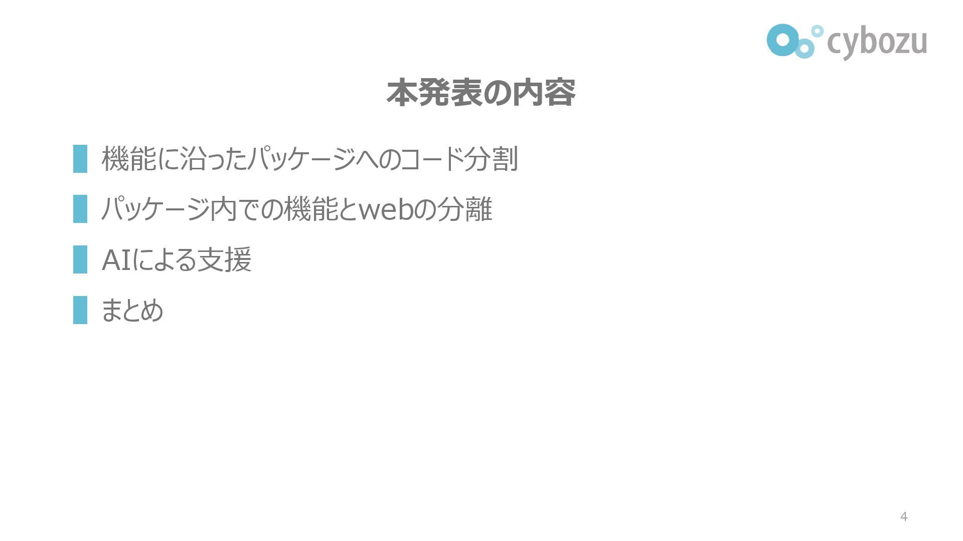 本発表の内容 ▌機能に沿ったパッケージへのコード分割 ▌パッケージ内での機能とwebの分離 ▌AIによる支援 ▌まとめ 4