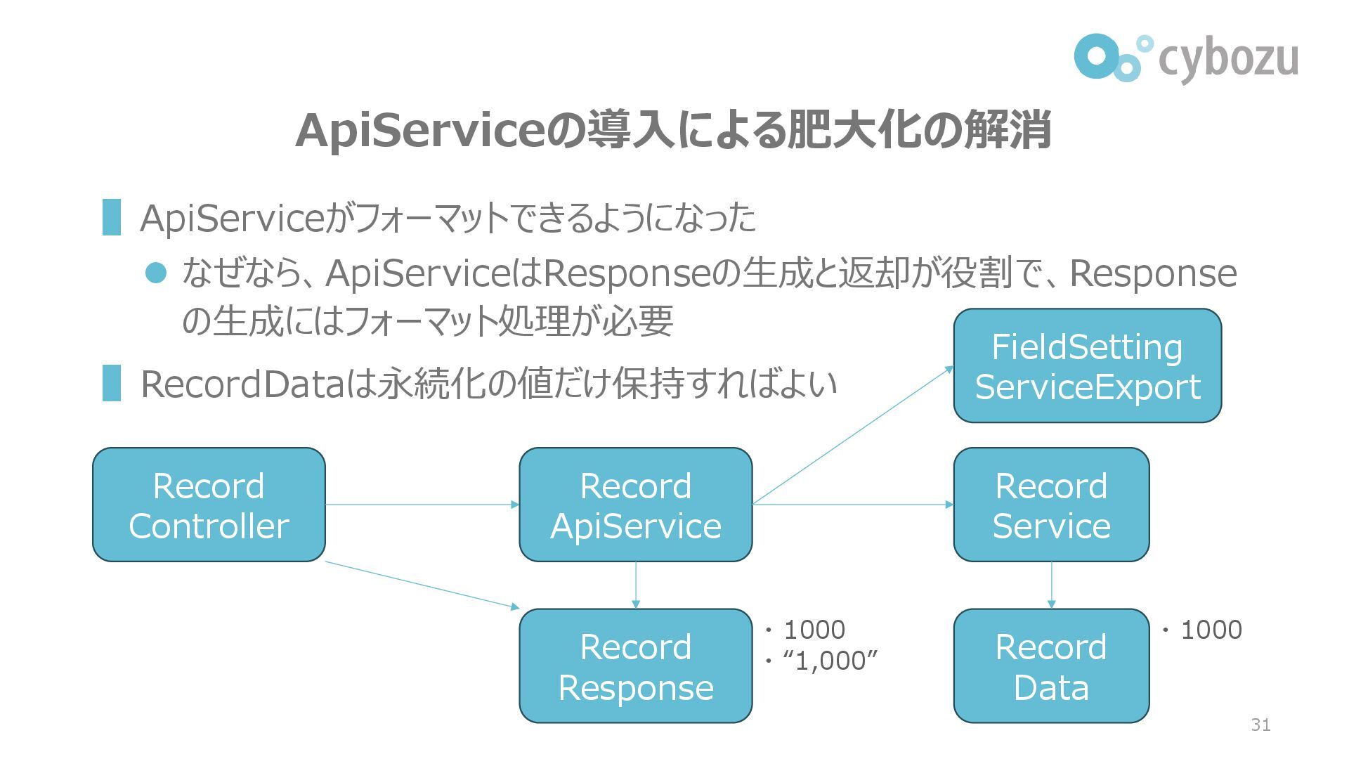30 Record Service Record Data Record Controller Record Response ・ 1000 ・ “1,000” ・ 1000 ・ “1,000” FieldSetting ServiceExport