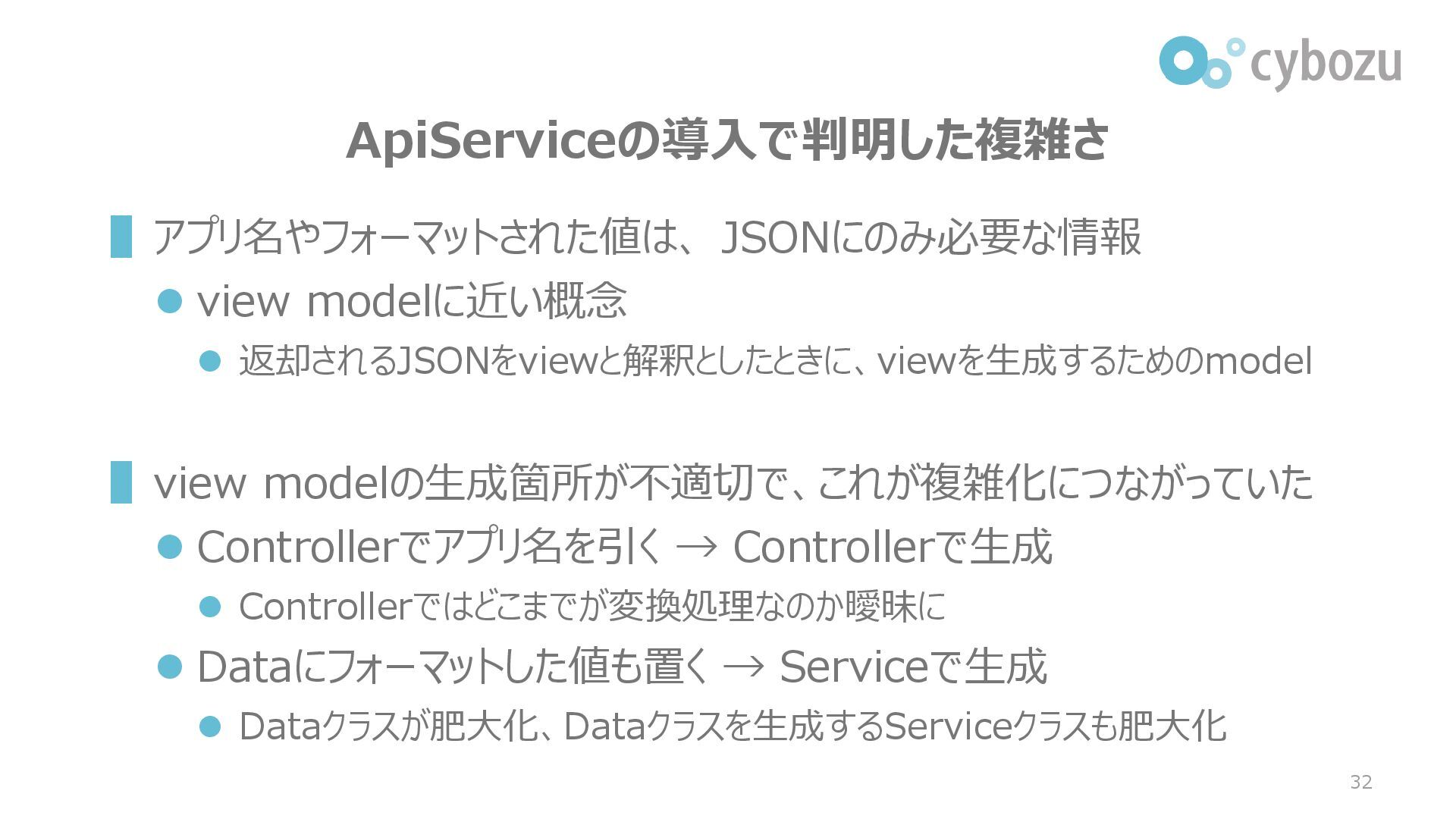 ApiServiceの導入による肥大化の解消 ▌ApiServiceがフォーマットできるようになった ⚫ なぜなら、ApiServiceはResponseの生成と返却が役割で、Response の生成にはフォーマット処理が必要 ▌RecordDataは永続化の値だけ保持すればよい 31 Record Service ・