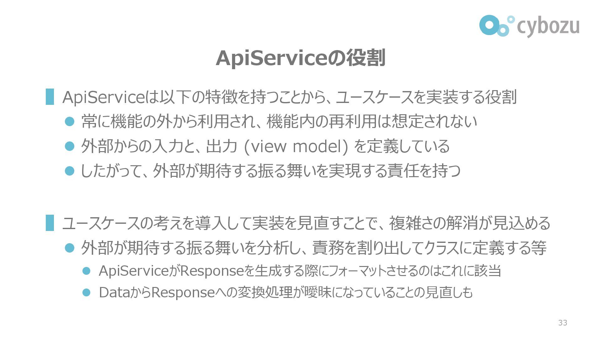 したがって、外部が期待する振る舞いを実現する責任を持つ ▌ユースケースの考えを導入して実装を見直すことで、複雑さの解消が見込める ⚫ 外部が期待する振る舞いを分析し、責務を割り出してクラスに定義する等 ⚫ ApiServiceがResponseを生成する際にフォーマットさせるのはこれに該当 ⚫ DataからResponseへの変換処理が曖昧になっていることの見直しも 33
