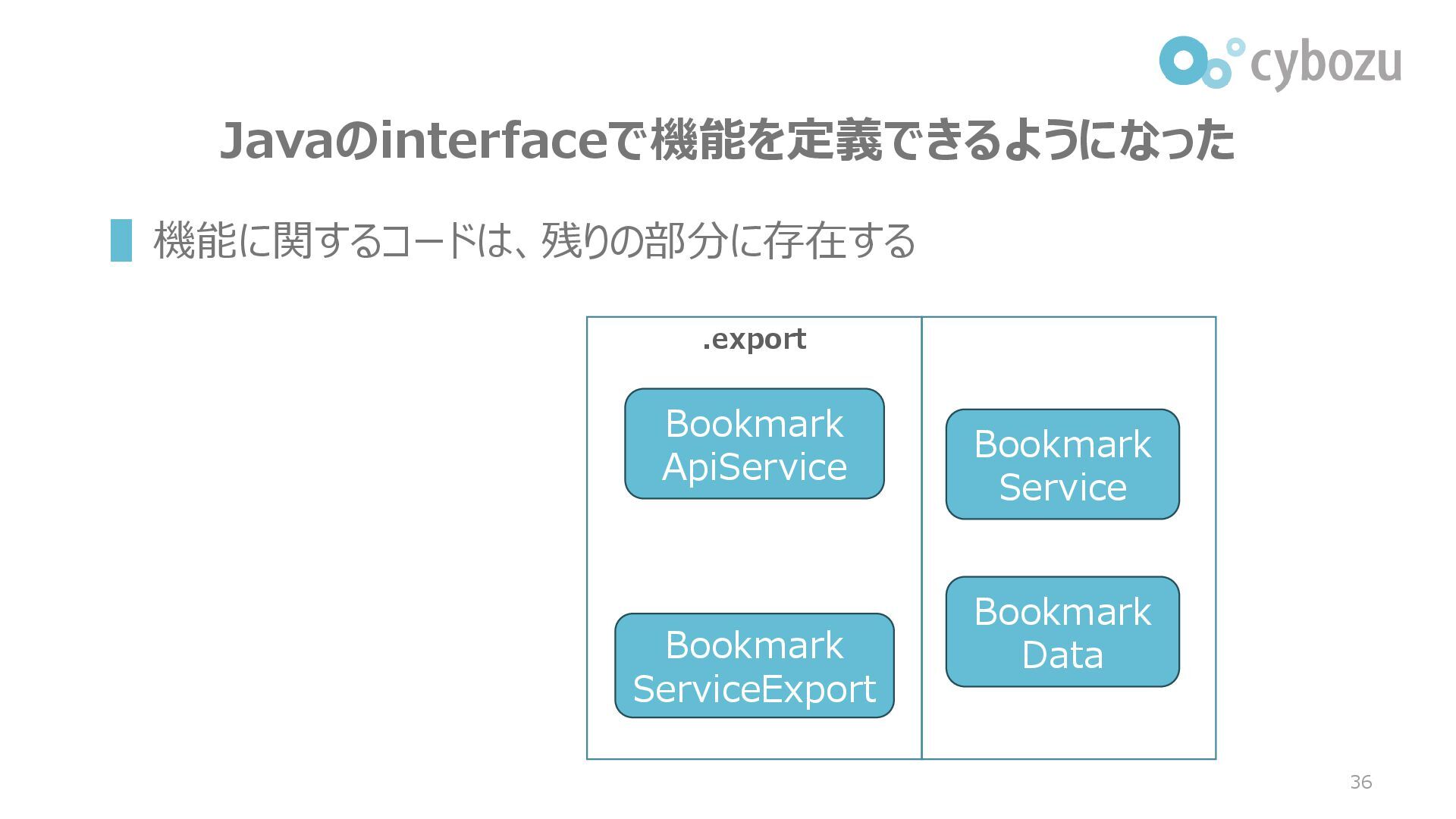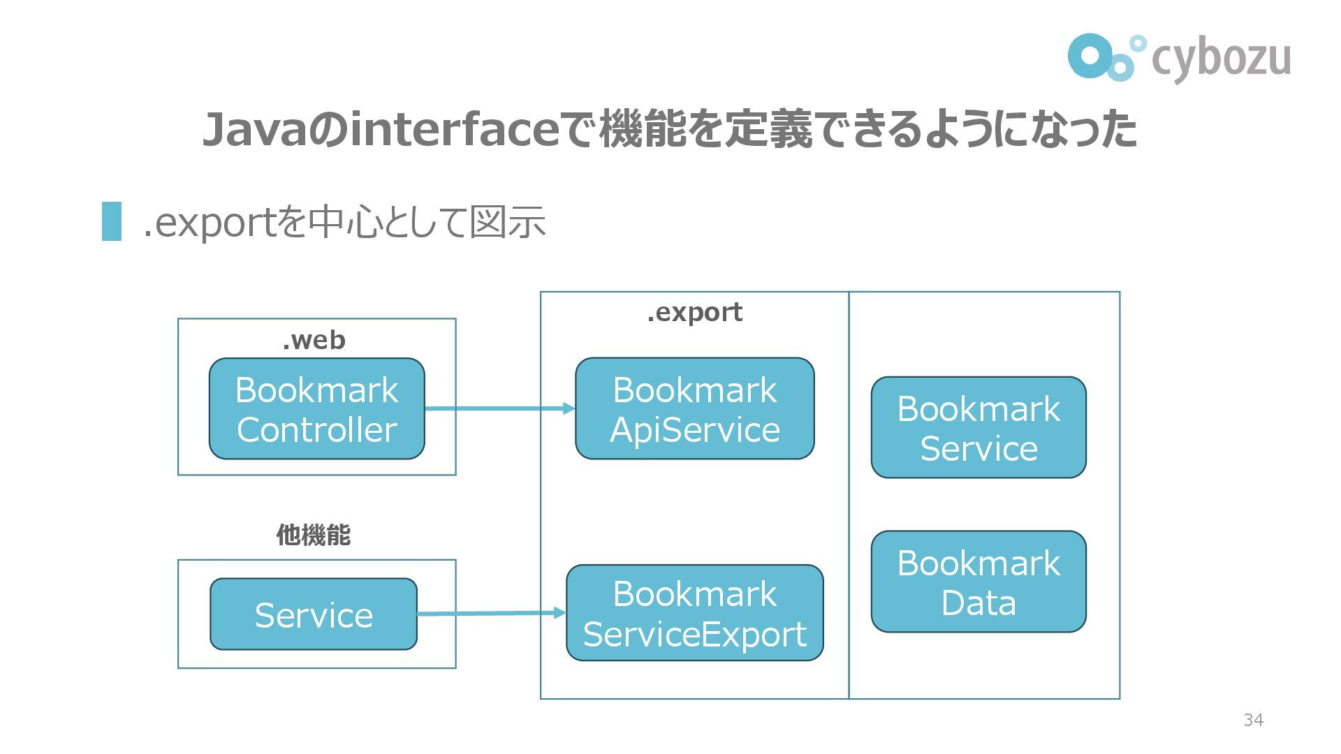 Javaのinterfaceで機能を定義できるようになった ▌.exportを中心として図示 34 他機能 Service Bookmark ServiceExport .export Bookmark ApiService