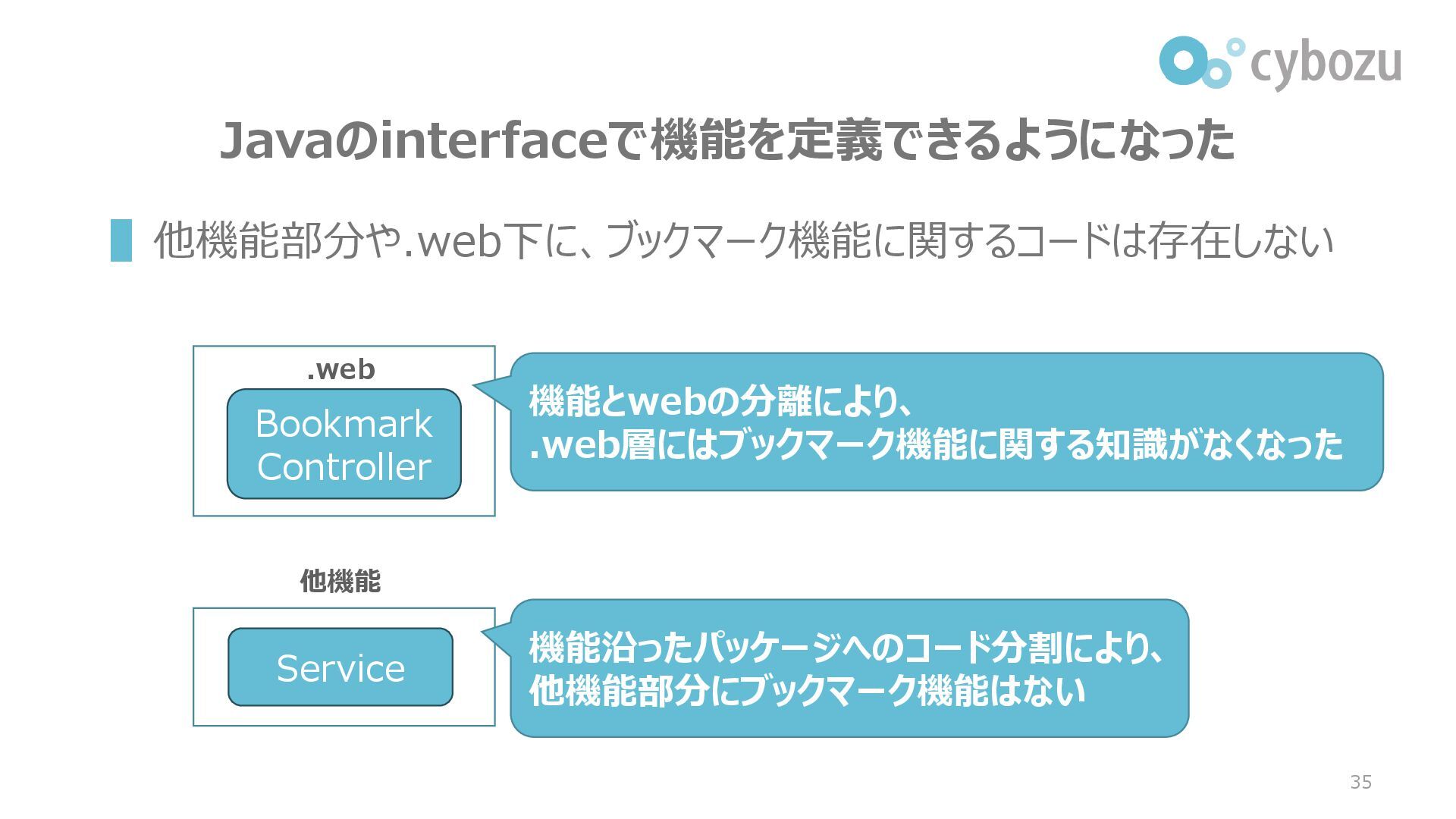 Javaのinterfaceで機能を定義できるようになった ▌他機能部分や.web下に、ブックマーク機能に関するコードは存在しない 35 他機能 Service .web Bookmark Controller 機能沿ったパッケージへのコード分割により、 他機能部分にブックマーク機能はない