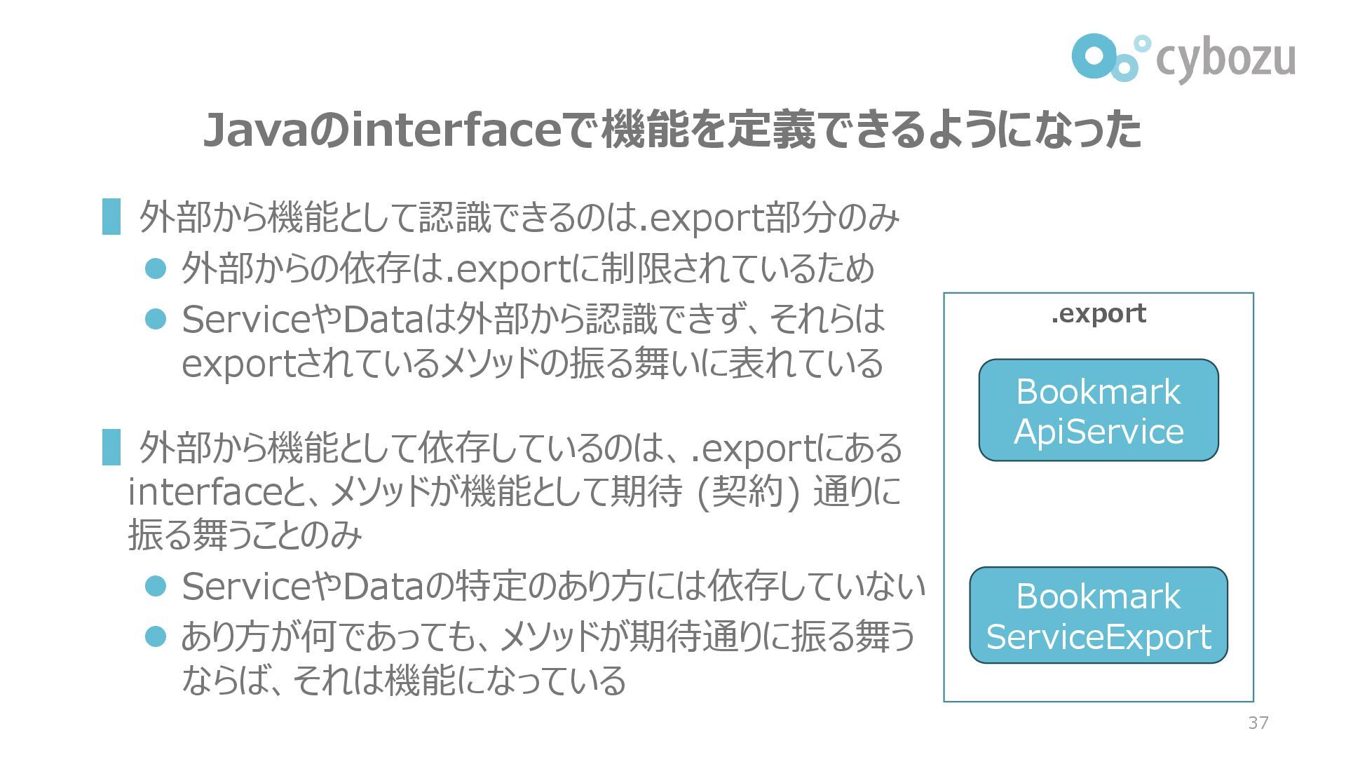 Javaのinterfaceで機能を定義できるようになった ▌機能に関するコードは、残りの部分に存在する 36 Bookmark ServiceExport .export Bookmark ApiService Bookmark Service