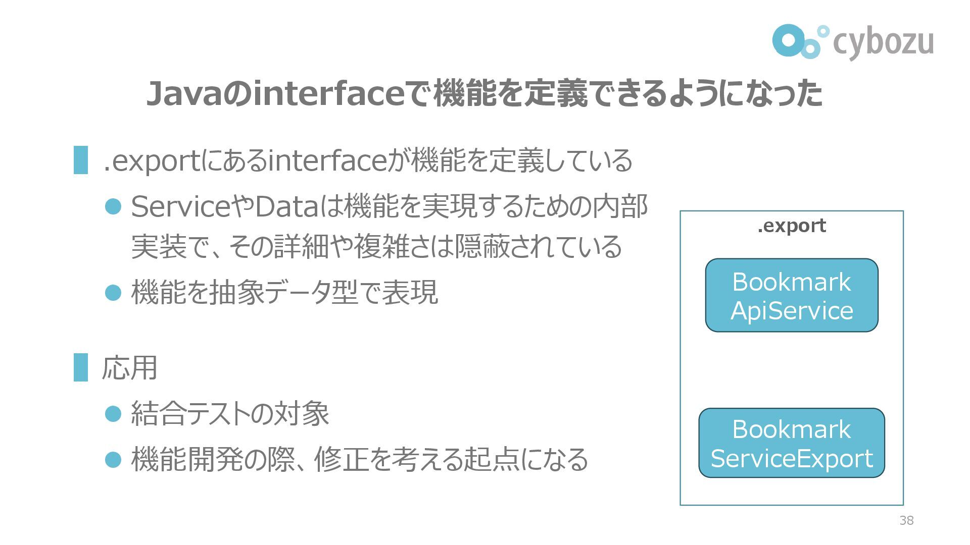 Javaのinterfaceで機能を定義できるようになった 37 ▌外部から機能として認識できるのは.export部分のみ ⚫ 外部からの依存は.exportに制限されているため ⚫ ServiceやDataは外部から認識できず、それらは exportされているメソッドの振る舞いに表れている ▌外部から機能として依存しているのは、.exportにある interfaceと、メソッドが機能として期待