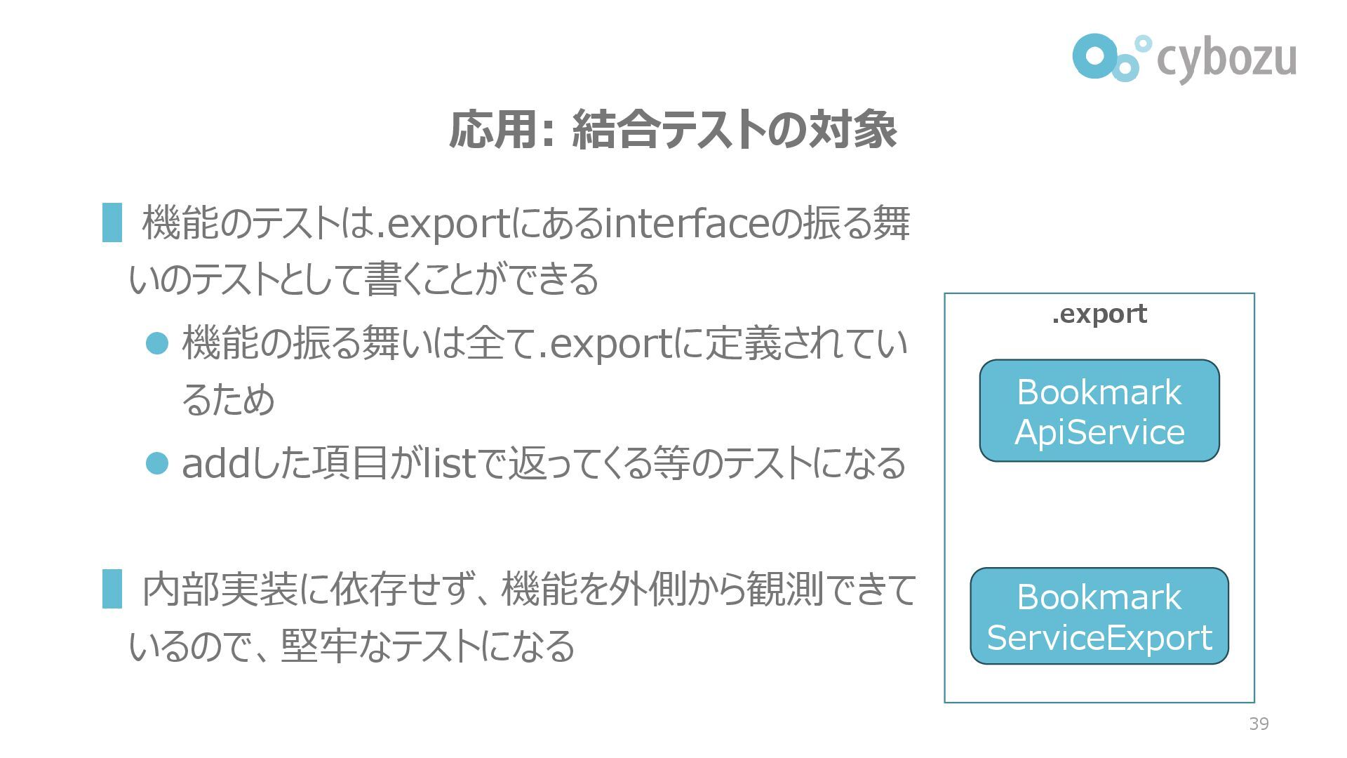 応用: 結合テストの対象 39 ▌機能のテストは.exportにあるinterfaceの振る舞 いのテストとして書くことができる ⚫ 機能の振る舞いは全て.exportに定義されてい るため ⚫ addした項目がlistで返ってくる等のテストになる