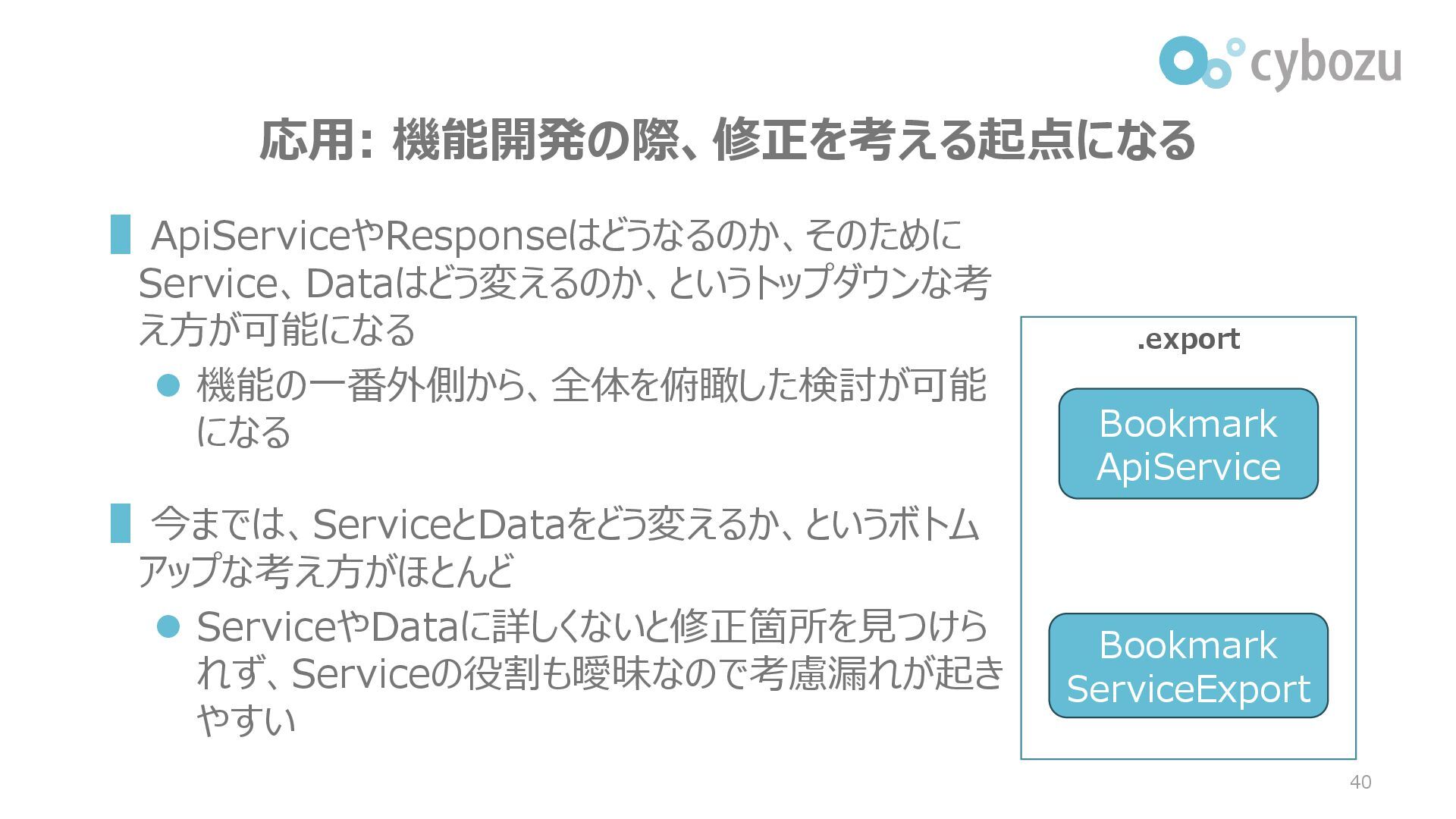 応用: 機能開発の際、修正を考える起点になる 40 Bookmark ServiceExport .export Bookmark ApiService ▌ApiServiceやResponseはどうなるのか、そのために Service、Dataはどう変えるのか、というトップダウンな考