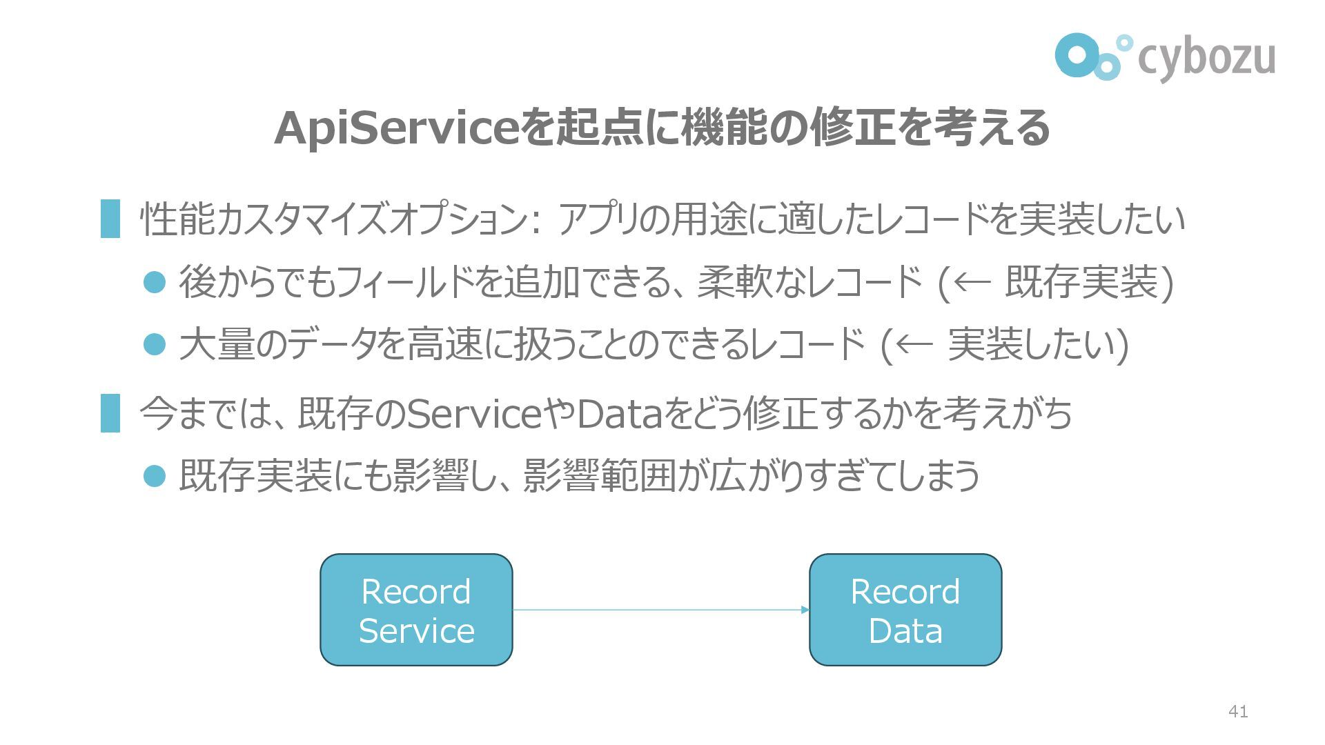 ApiServiceを起点に機能の修正を考える ▌性能カスタマイズオプション: アプリの用途に適したレコードを実装したい ⚫ 後からでもフィールドを追加できる、柔軟なレコード (← 既存実装) ⚫ 大量のデータを高速に扱うことのできるレコード (←