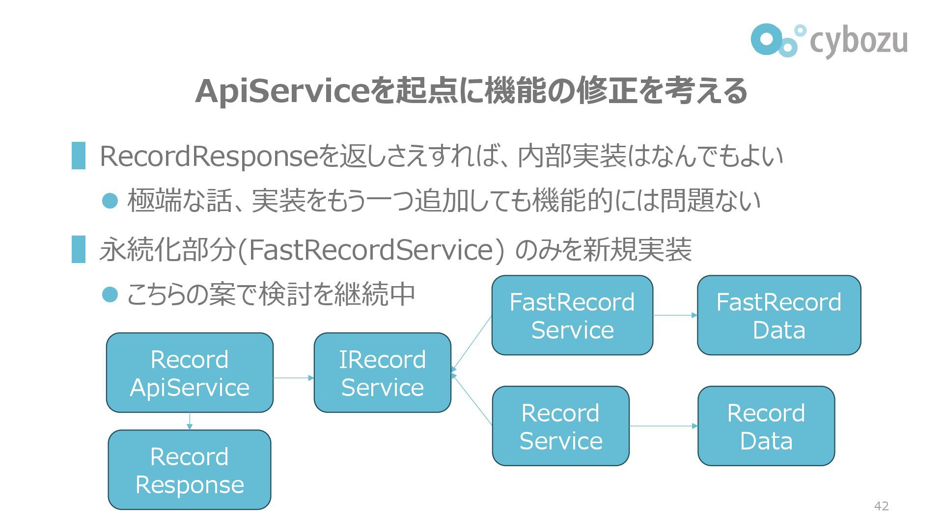 ApiServiceを起点に機能の修正を考える ▌RecordResponseを返しさえすれば、内部実装はなんでもよい ⚫ 極端な話、実装をもう一つ追加しても機能的には問題ない ▌永続化部分(FastRecordService) のみを新規実装 ⚫ こちらの案で検討を継続中 42 Record