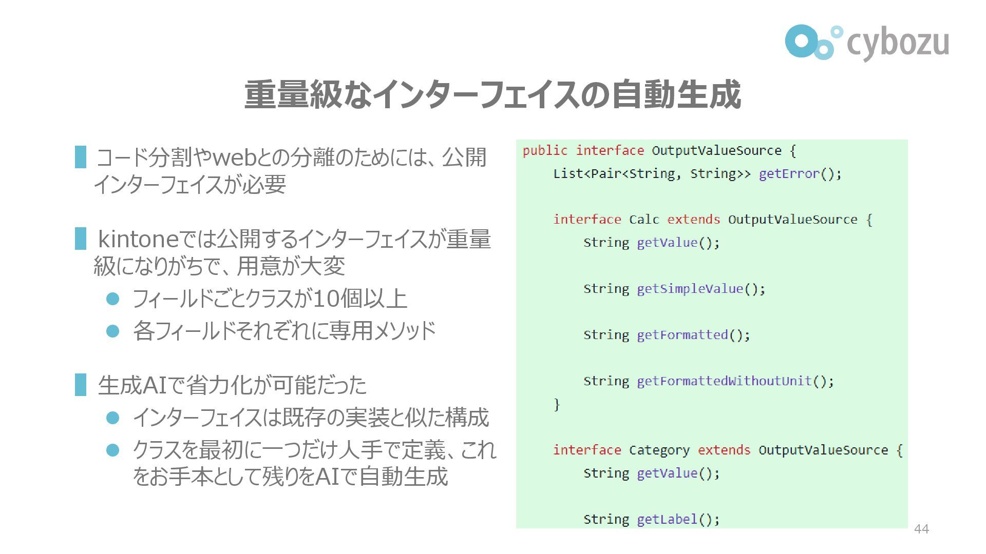 重量級なインターフェイスの自動生成 ▌コード分割やwebとの分離のためには、公開 インターフェイスが必要 ▌kintoneでは公開するインターフェイスが重量 級になりがちで、用意が大変 ⚫ フィールドごとクラスが10個以上 ⚫ 各フィールドそれぞれに専用メソッド ▌生成AIで省力化が可能だった