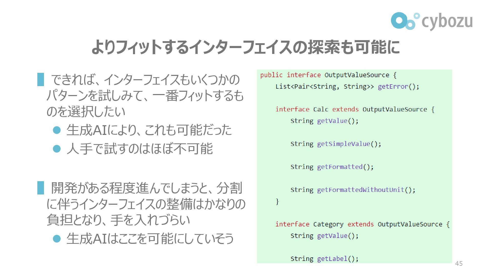 ⚫ インターフェイスは既存の実装と似た構成 ⚫ クラスを最初に一つだけ人手で定義、これ をお手本として残りをAIで自動生成 44