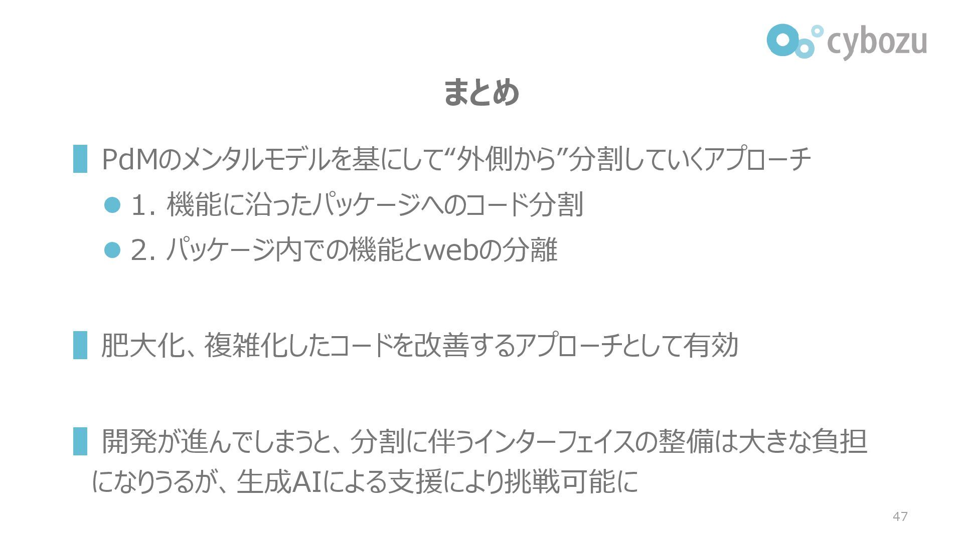 まとめ ▌PdMのメンタルモデルを基にして“外側から”分割していくアプローチ ⚫ 1. 機能に沿ったパッケージへのコード分割 ⚫ 2. パッケージ内での機能とwebの分離 ▌肥大化、複雑化したコードを改善するアプローチとして有効 ▌開発が進んでしまうと、分割に伴うインターフェイスの整備は大きな負担