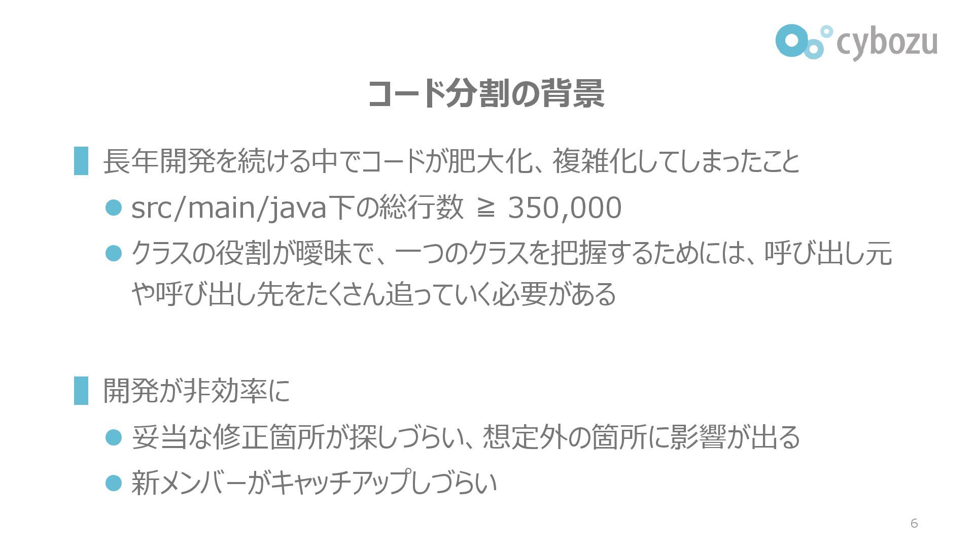 コード分割の背景 ▌長年開発を続ける中でコードが肥大化、複雑化してしまったこと ⚫ src/main/java下の総行数 ≧ 350,000 ⚫ クラスの役割が曖昧で、一つのクラスを把握するためには、呼び出し元 や呼び出し先をたくさん追っていく必要がある ▌開発が非効率に