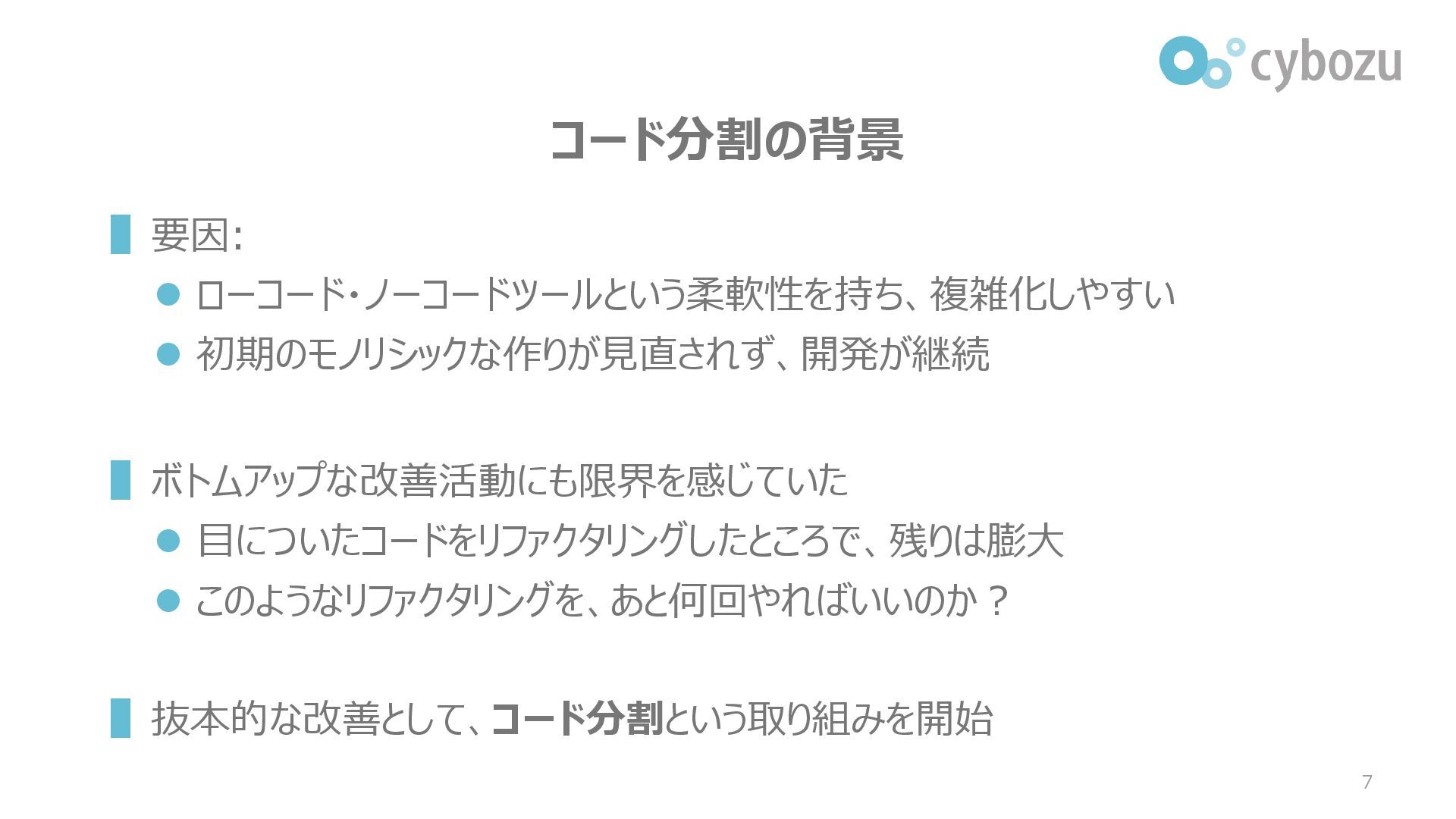 コード分割の背景 ▌要因: ⚫ ローコード・ノーコードツールという柔軟性を持ち、複雑化しやすい ⚫ 初期のモノリシックな作りが見直されず、開発が継続 ▌ボトムアップな改善活動にも限界を感じていた ⚫ 目についたコードをリファクタリングしたところで、残りは膨大 ⚫