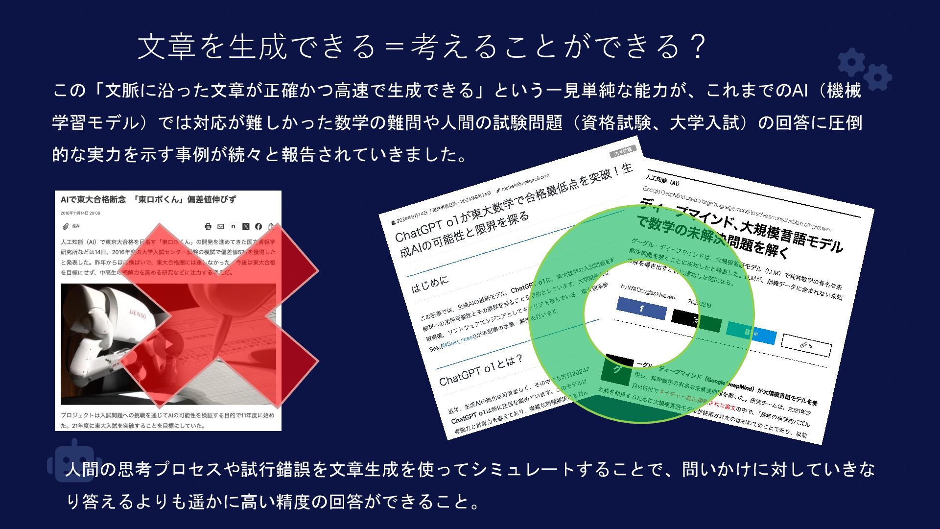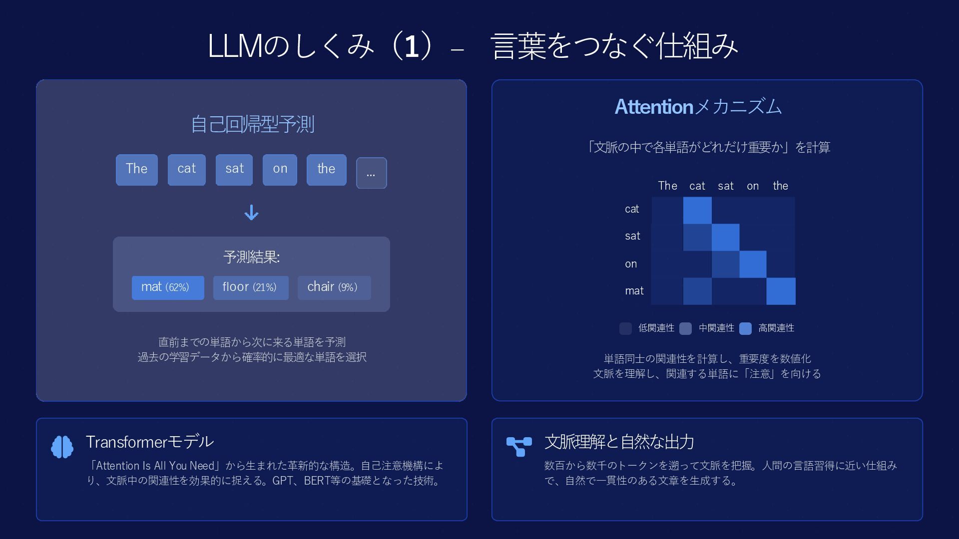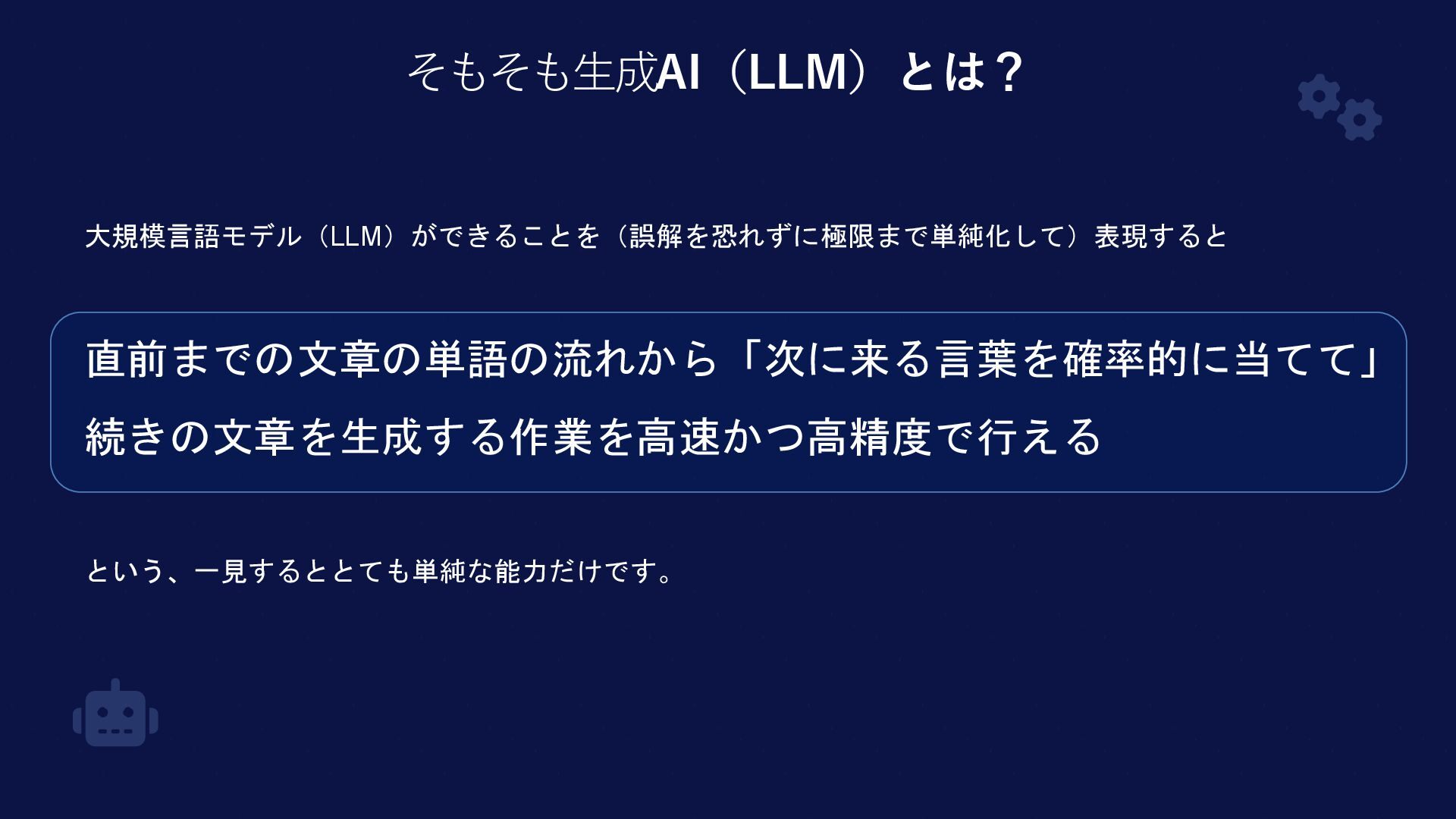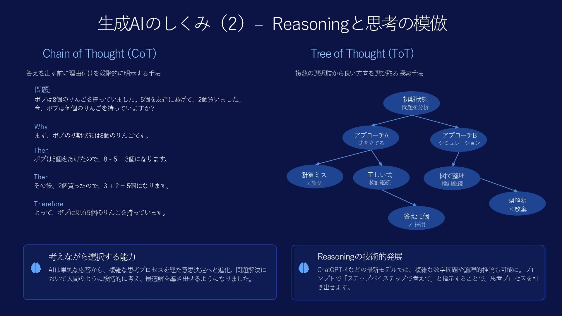 of Thought (ToT) 答えを出す前に理由付けを段階的に明⽰する⼿法 複数の選択肢から良い⽅向を選び取る探索⼿法 考えながら選択する能⼒ AIは単純な応答から、複雑な思考プロセスを経た意思決定へと進化。問題解決に おいて⼈間のように段階的に考え、最適解を導き出せるようになりました。 Why まず、ボブの初期状態は8個のりんごです。 Then ボブは5個をあげたので、8 - 5 = 3個になります。 Then その後、2個買ったので、3 + 2 = 5個になります。 Therefore よって、ボブは現在5個のりんごを持っています。 Reasoningの技術的発展 ChatGPT-4などの最新モデルでは、複雑な数学問題や論理的推論も可能に。プロ ンプトで「ステップバイステップで考えて」と指⽰することで、思考プロセスを引 き出せます。 初期状態 問題を分析 アプローチB シミュレーション 計算ミス ×放棄 正しい式 検討継続 図で整理 検討継続 答え: 5個 ✓ 採⽤ 誤解釈 ×放棄 アプローチA 式を⽴てる
