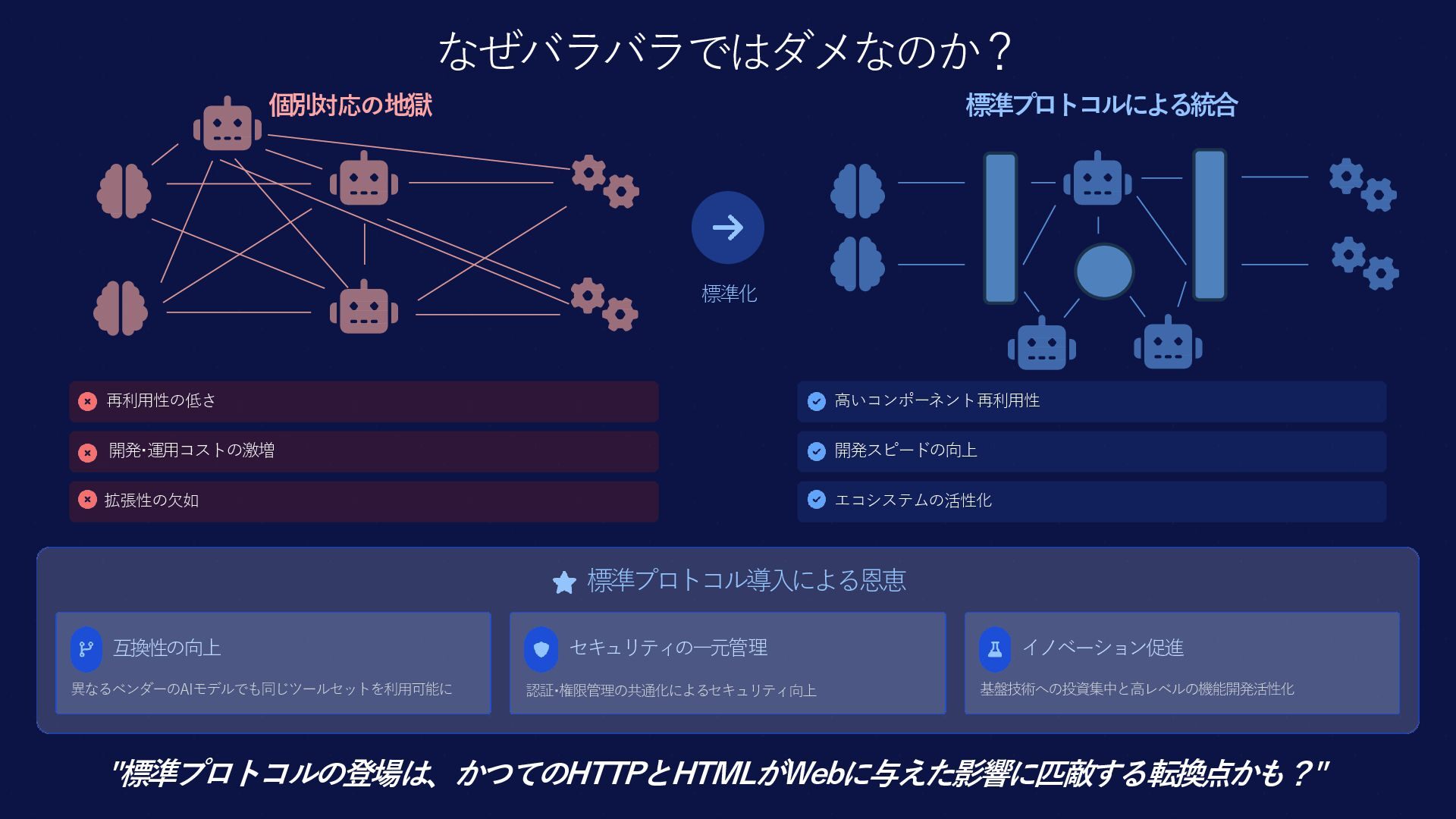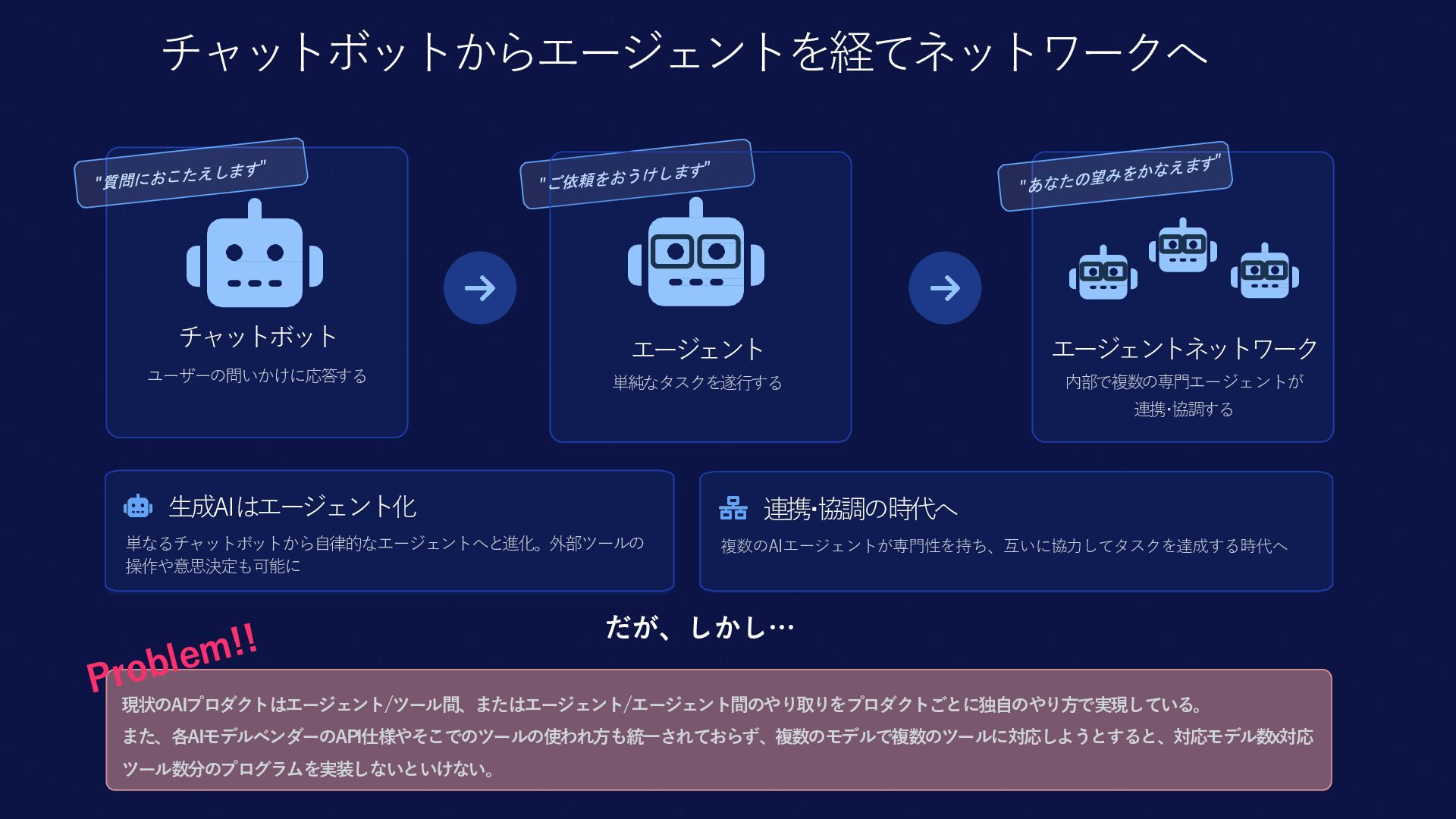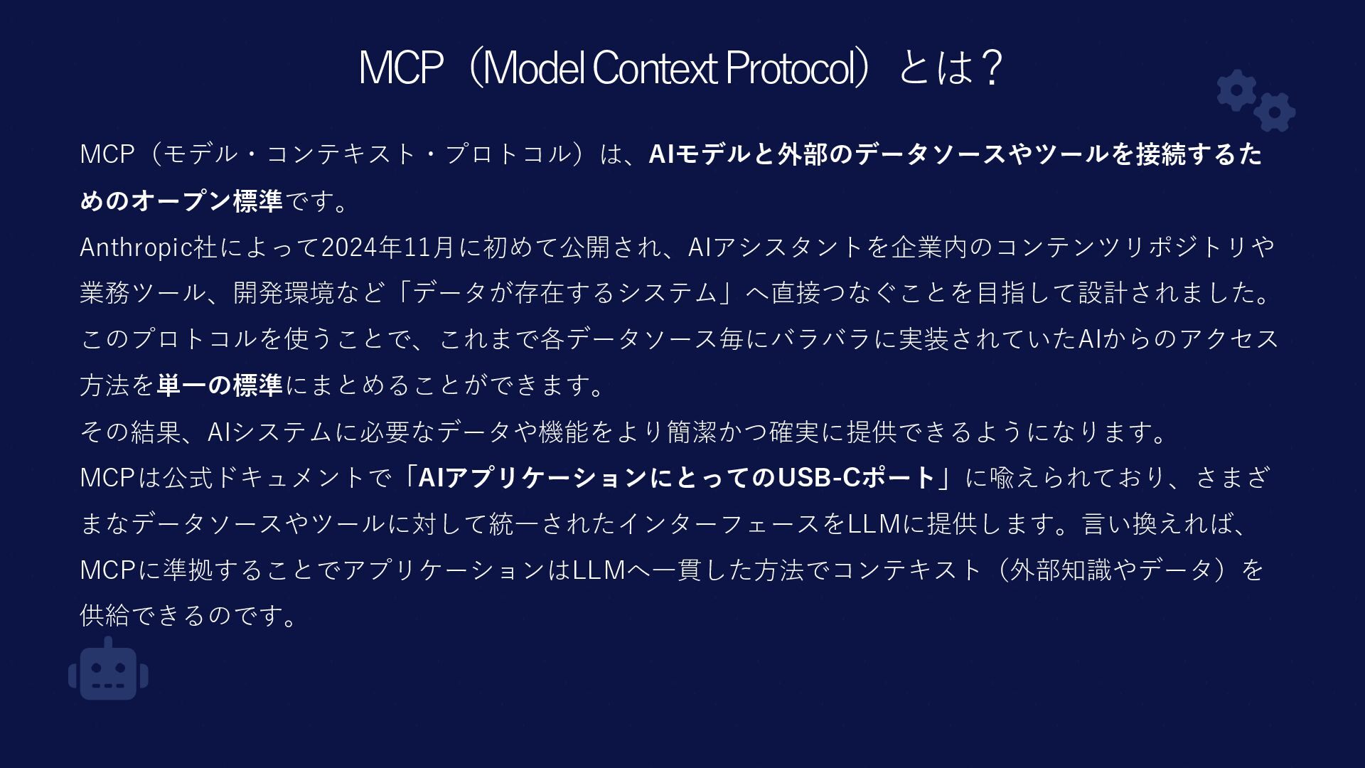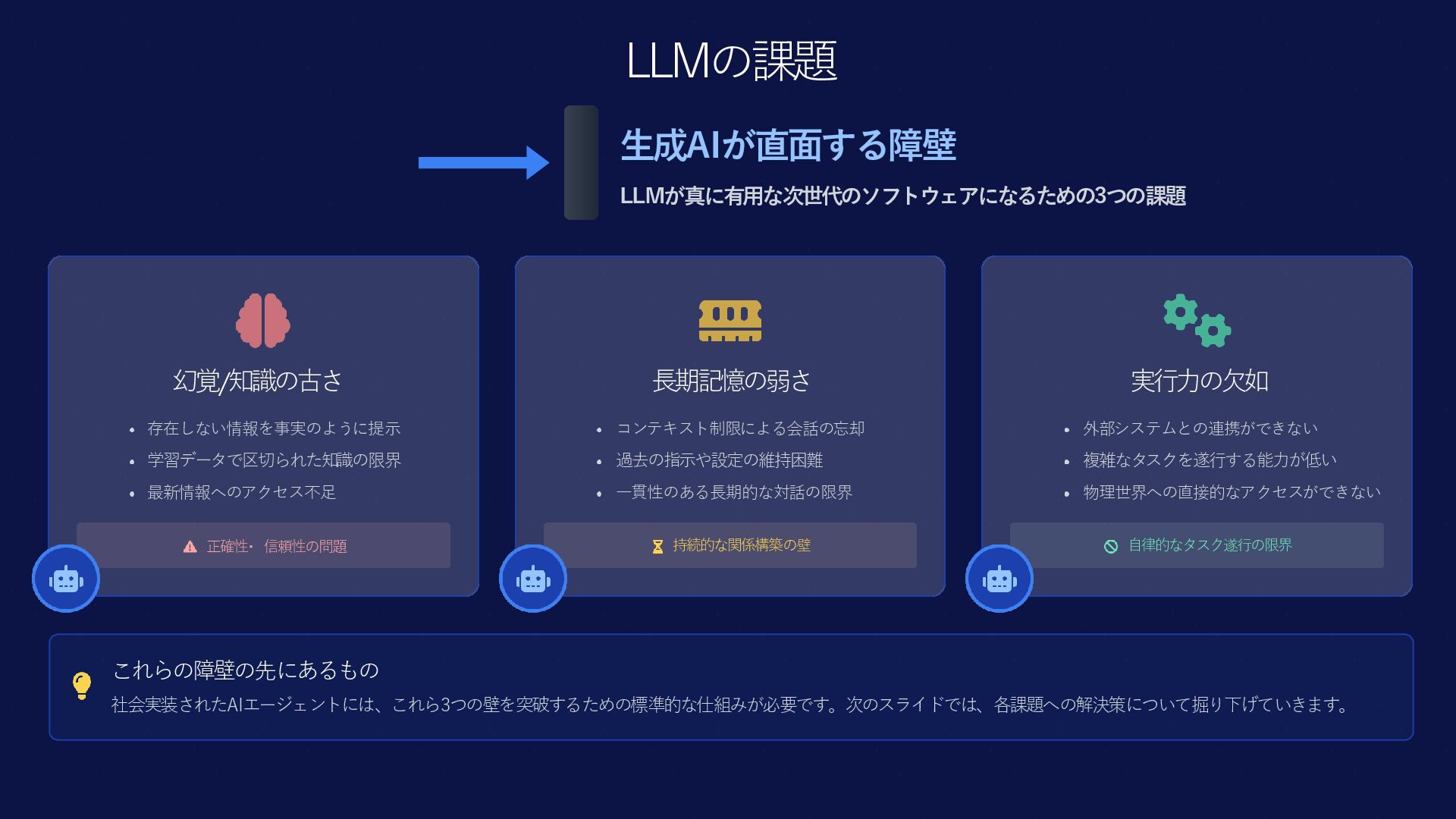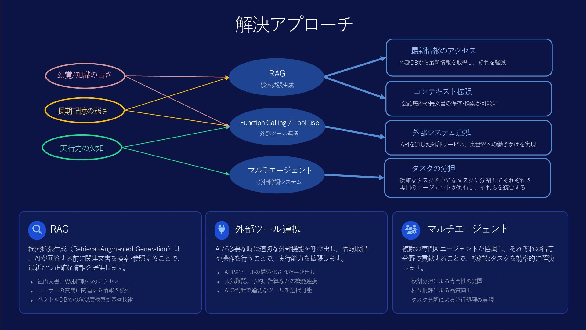 of Thought (ToT) 答えを出す前に理由付けを段階的に明⽰する⼿法 複数の選択肢から良い⽅向を選び取る探索⼿法 考えながら選択する能⼒ AIは単純な応答から、複雑な思考プロセスを経た意思決定へと進化。問題解決に おいて⼈間のように段階的に考え、最適解を導き出せるようになりました。 Why まず、ボブの初期状態は8個のりんごです。 Then ボブは5個をあげたので、8 - 5 = 3個になります。 Then その後、2個買ったので、3 + 2 = 5個になります。 Therefore よって、ボブは現在5個のりんごを持っています。 Reasoningの技術的発展 ChatGPT-4などの最新モデルでは、複雑な数学問題や論理的推論も可能に。プロ ンプトで「ステップバイステップで考えて」と指⽰することで、思考プロセスを引 き出せます。 初期状態 問題を分析 アプローチB シミュレーション 計算ミス ×放棄 正しい式 検討継続 図で整理 検討継続 答え: 5個 ✓ 採⽤ 誤解釈 ×放棄 アプローチA 式を⽴てる