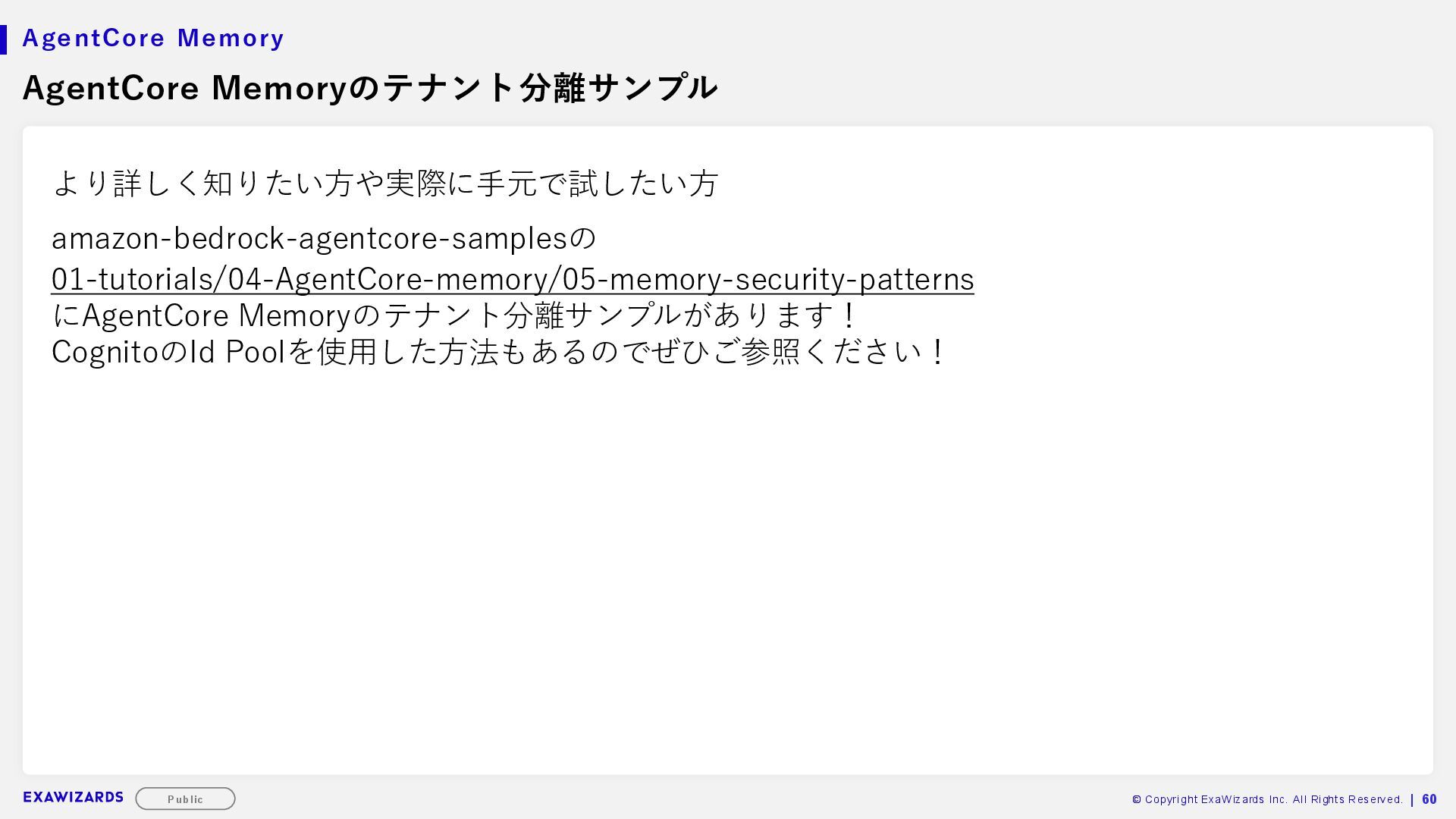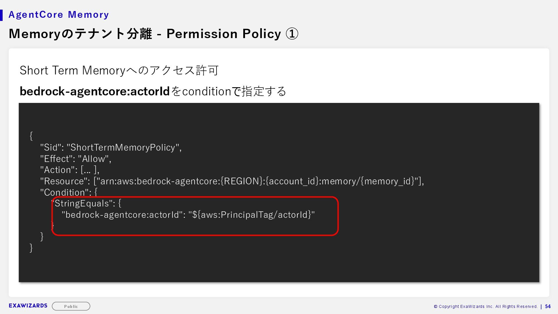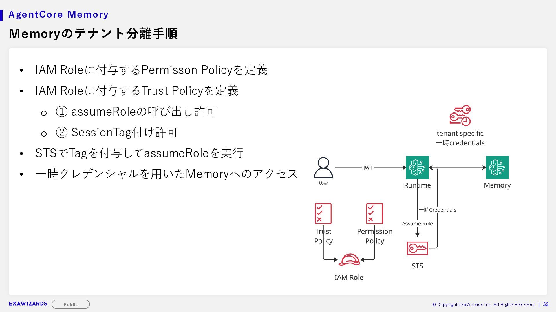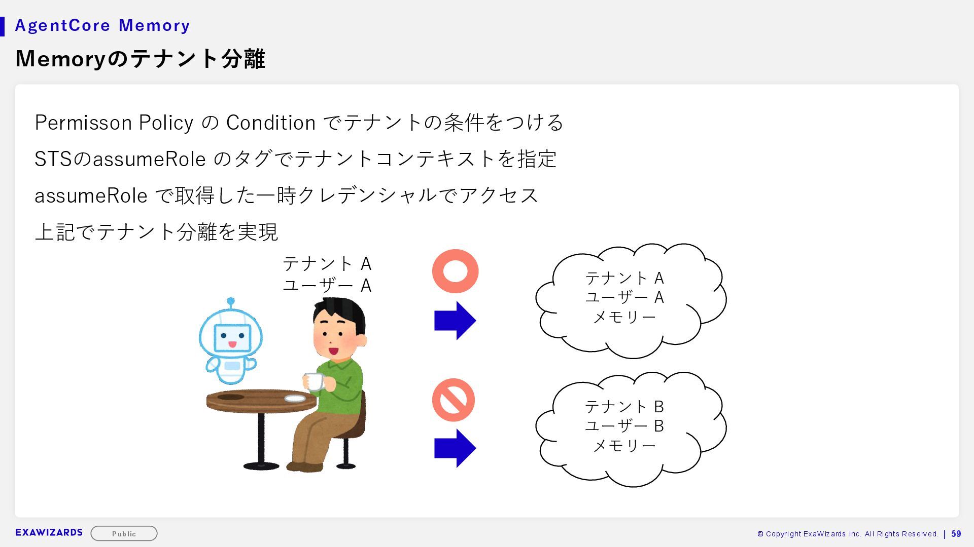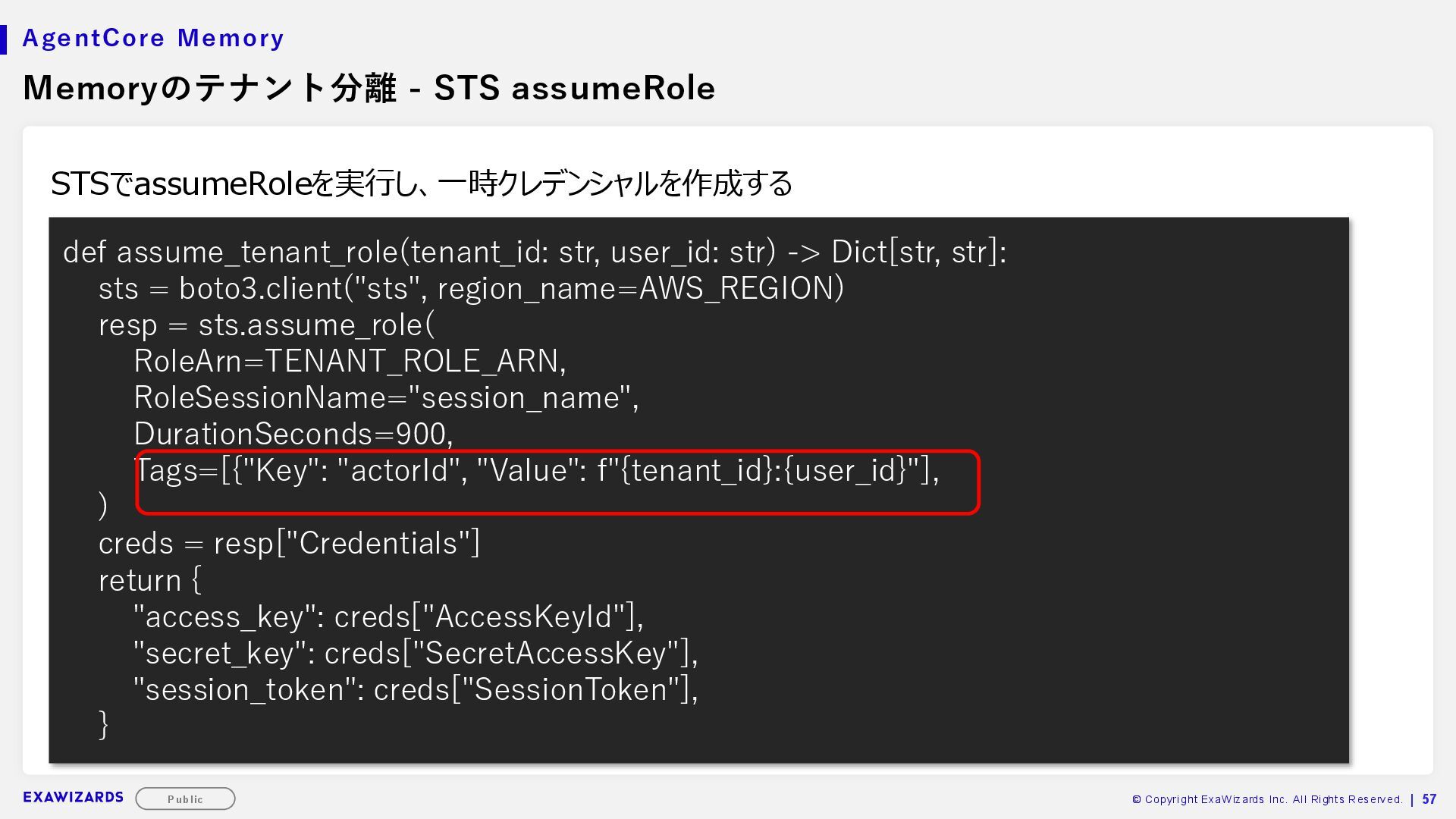 s R es erv ed. AgentCore Memory Memoryのテナント分離 - STS assumeRole Pub lic STSでassumeRoleを実行し、一時クレデンシャルを作成する def assume_tenant_role(tenant_id: str, user_id: str) -> Dict[str, str]: sts = boto3.client("sts", region_name=AWS_REGION) resp = sts.assume_role( RoleArn=TENANT_ROLE_ARN, RoleSessionName="session_name", DurationSeconds=900, Tags=[{"Key": "actorId", "Value": f"{tenant_id}:{user_id}"], ) creds = resp["Credentials"] return { "access_key": creds["AccessKeyId"], "secret_key": creds["SecretAccessKey"], "session_token": creds["SessionToken"], }