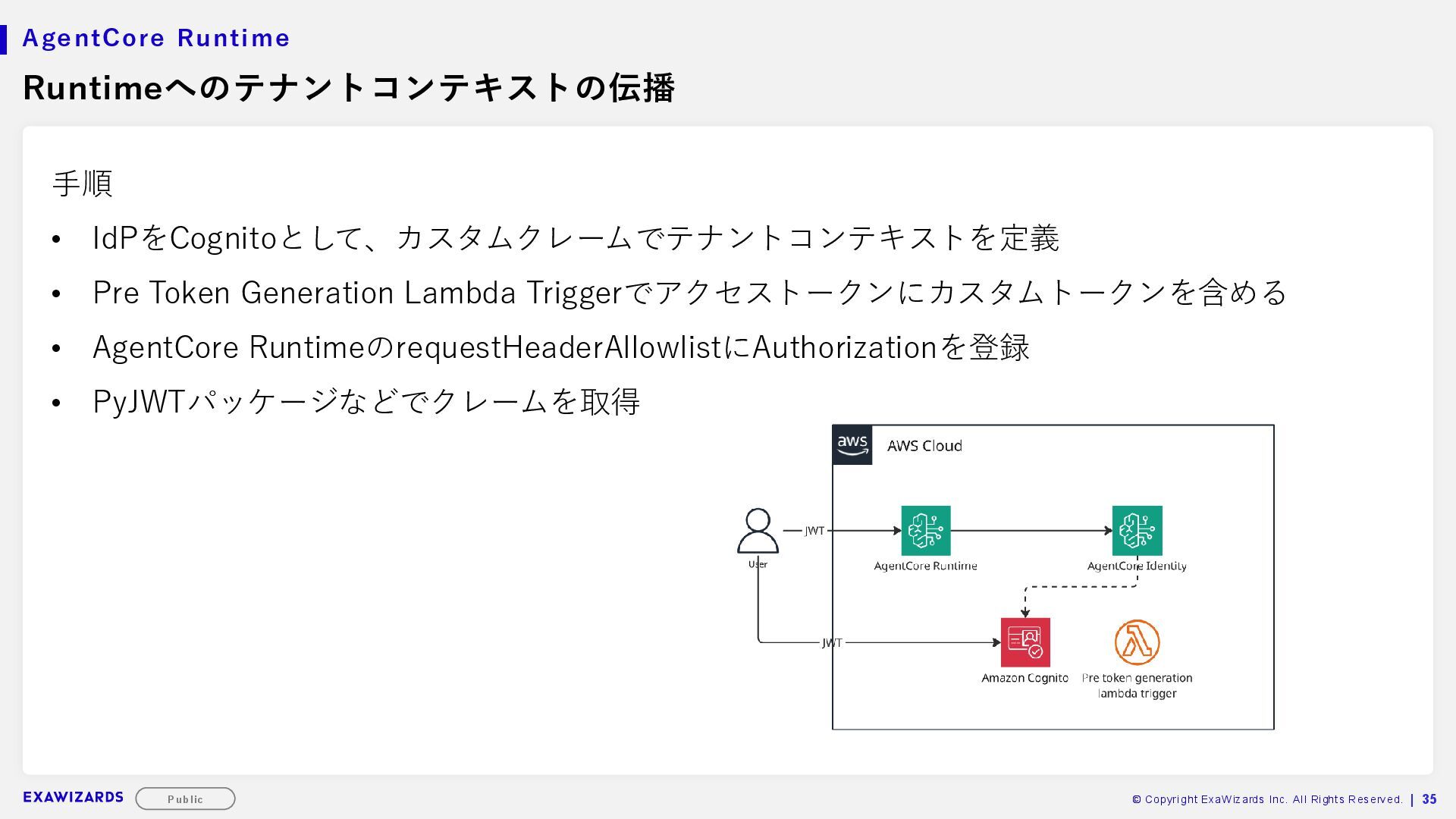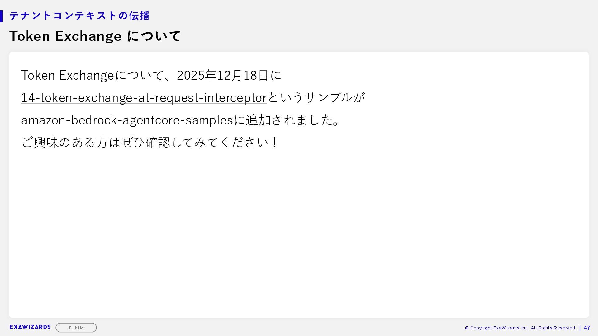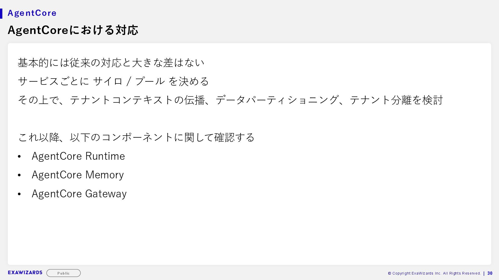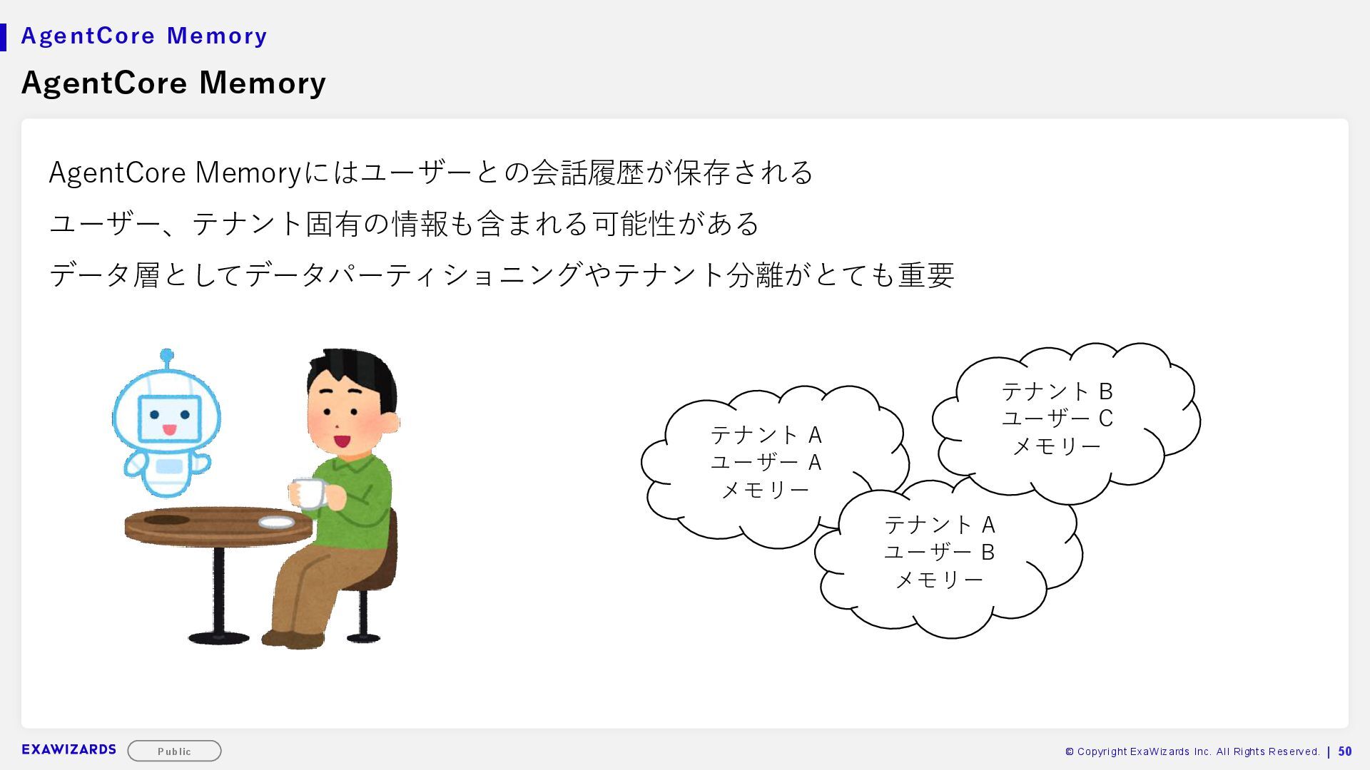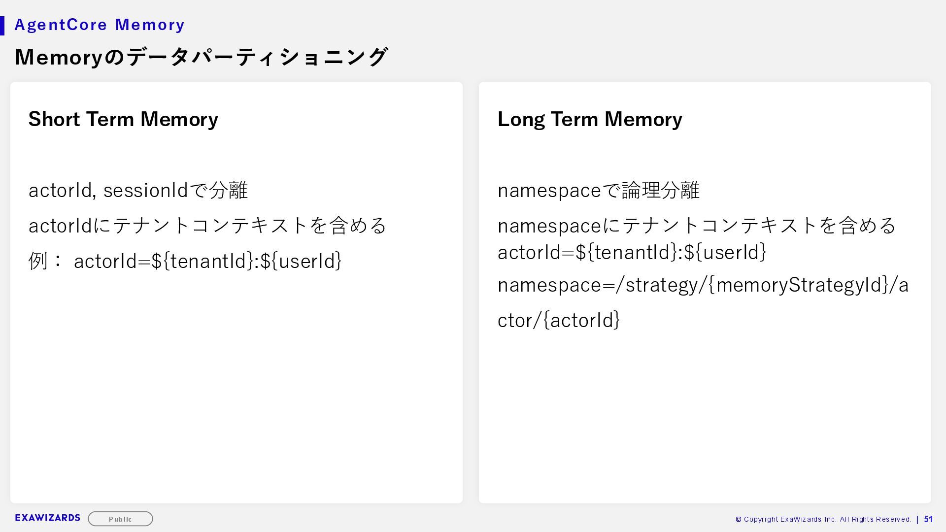 s R es erv ed. AgentCore Memory Memoryのテナント分離 - STS assumeRole Pub lic STSでassumeRoleを実行し、一時クレデンシャルを作成する def assume_tenant_role(tenant_id: str, user_id: str) -> Dict[str, str]: sts = boto3.client("sts", region_name=AWS_REGION) resp = sts.assume_role( RoleArn=TENANT_ROLE_ARN, RoleSessionName="session_name", DurationSeconds=900, Tags=[{"Key": "actorId", "Value": f"{tenant_id}:{user_id}"], ) creds = resp["Credentials"] return { "access_key": creds["AccessKeyId"], "secret_key": creds["SecretAccessKey"], "session_token": creds["SessionToken"], }