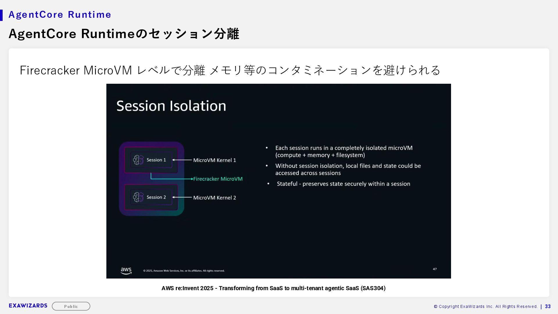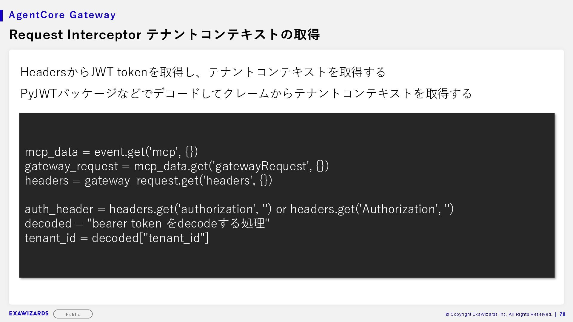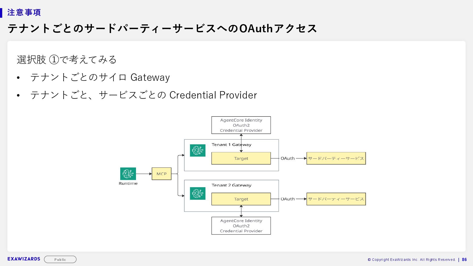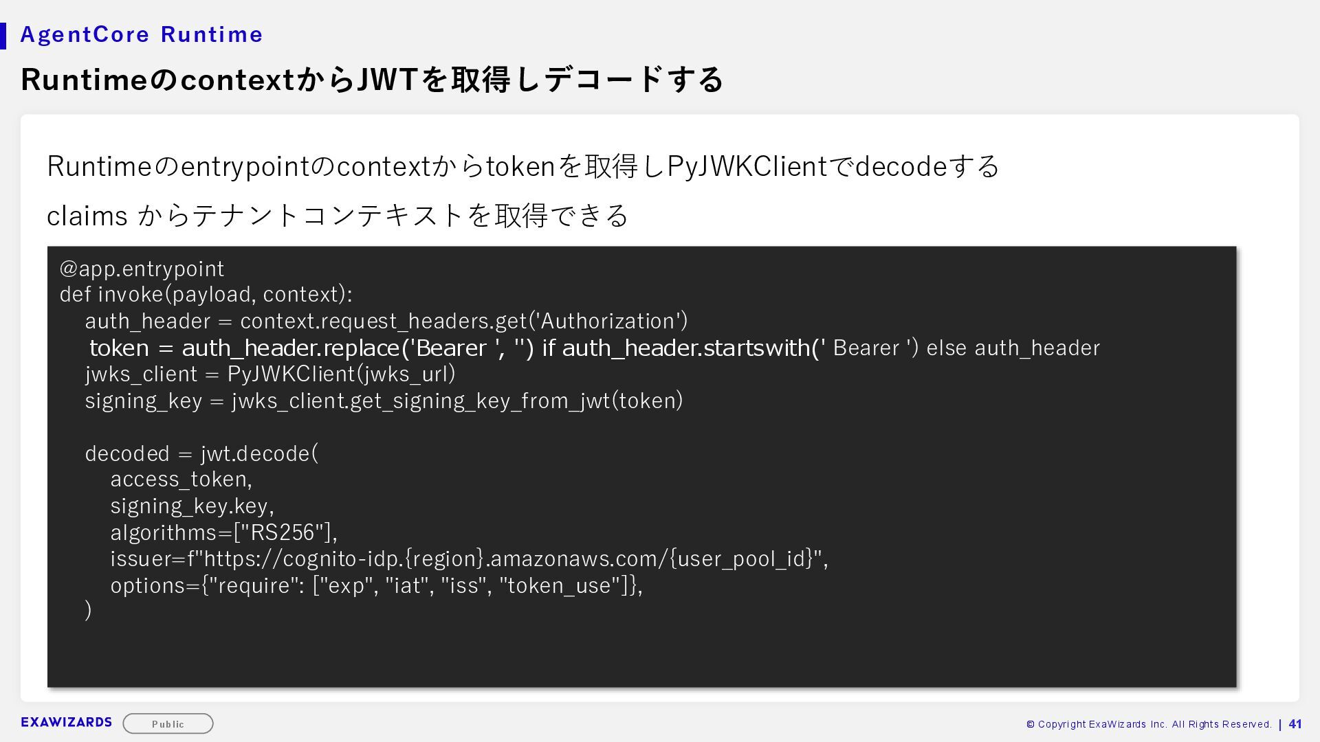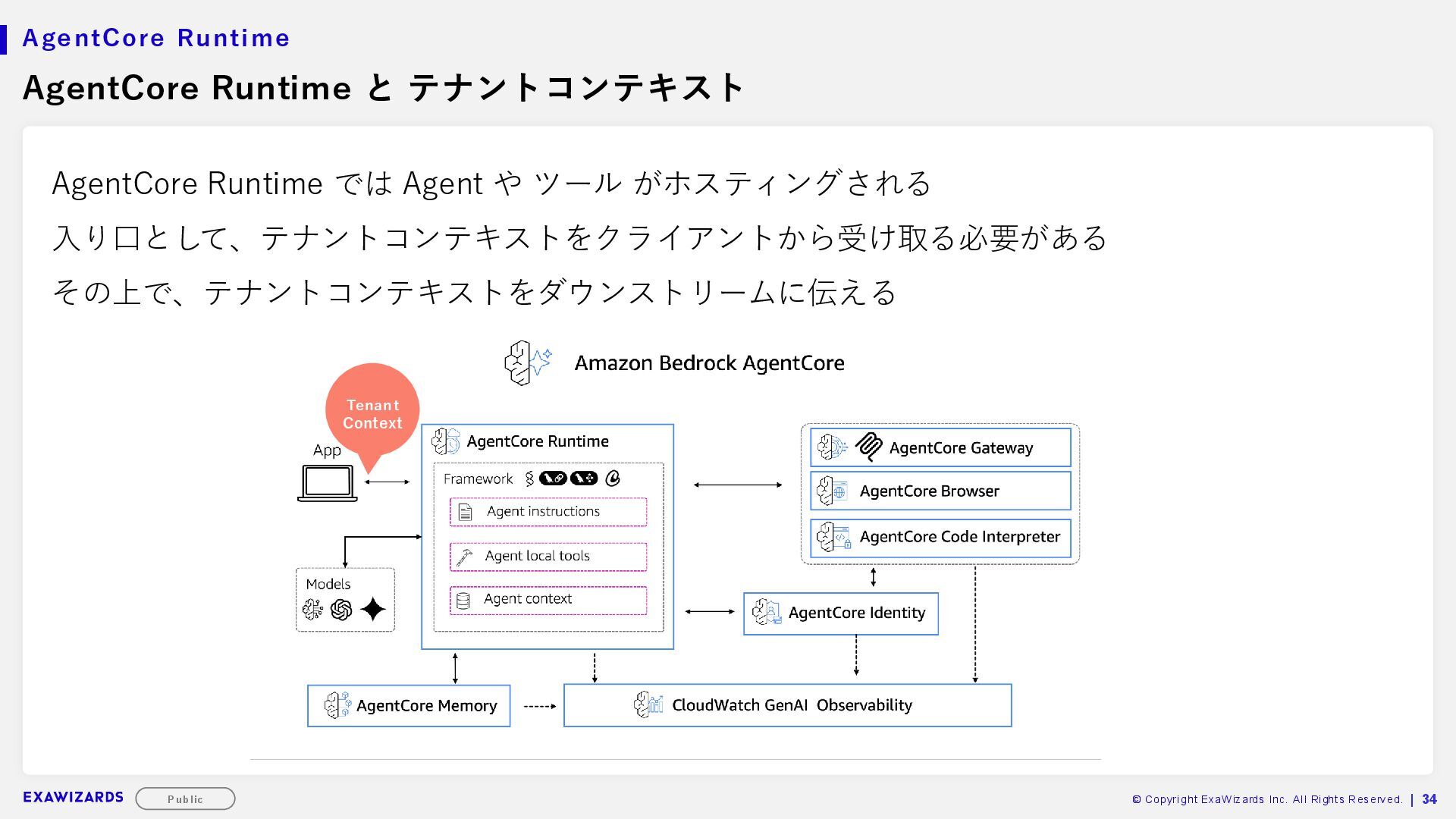 s R es erv ed. AgentCore Memory Memoryのテナント分離 - STS assumeRole Pub lic STSでassumeRoleを実行し、一時クレデンシャルを作成する def assume_tenant_role(tenant_id: str, user_id: str) -> Dict[str, str]: sts = boto3.client("sts", region_name=AWS_REGION) resp = sts.assume_role( RoleArn=TENANT_ROLE_ARN, RoleSessionName="session_name", DurationSeconds=900, Tags=[{"Key": "actorId", "Value": f"{tenant_id}:{user_id}"], ) creds = resp["Credentials"] return { "access_key": creds["AccessKeyId"], "secret_key": creds["SecretAccessKey"], "session_token": creds["SessionToken"], }
