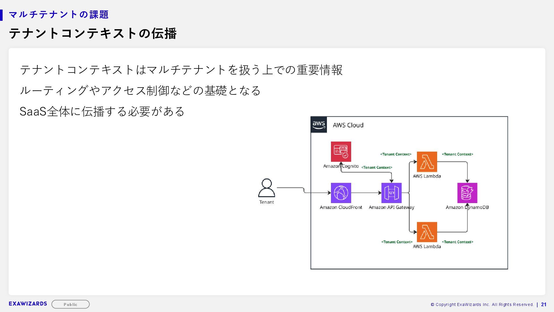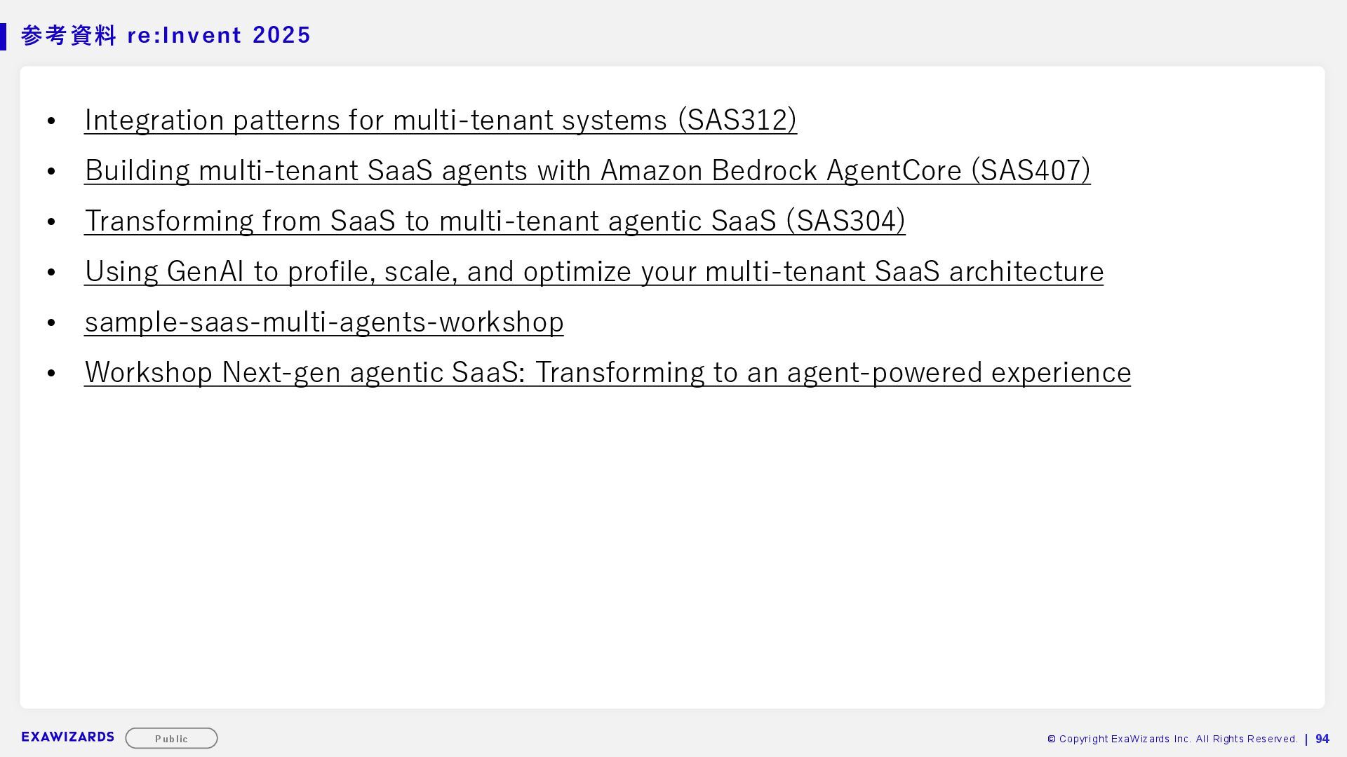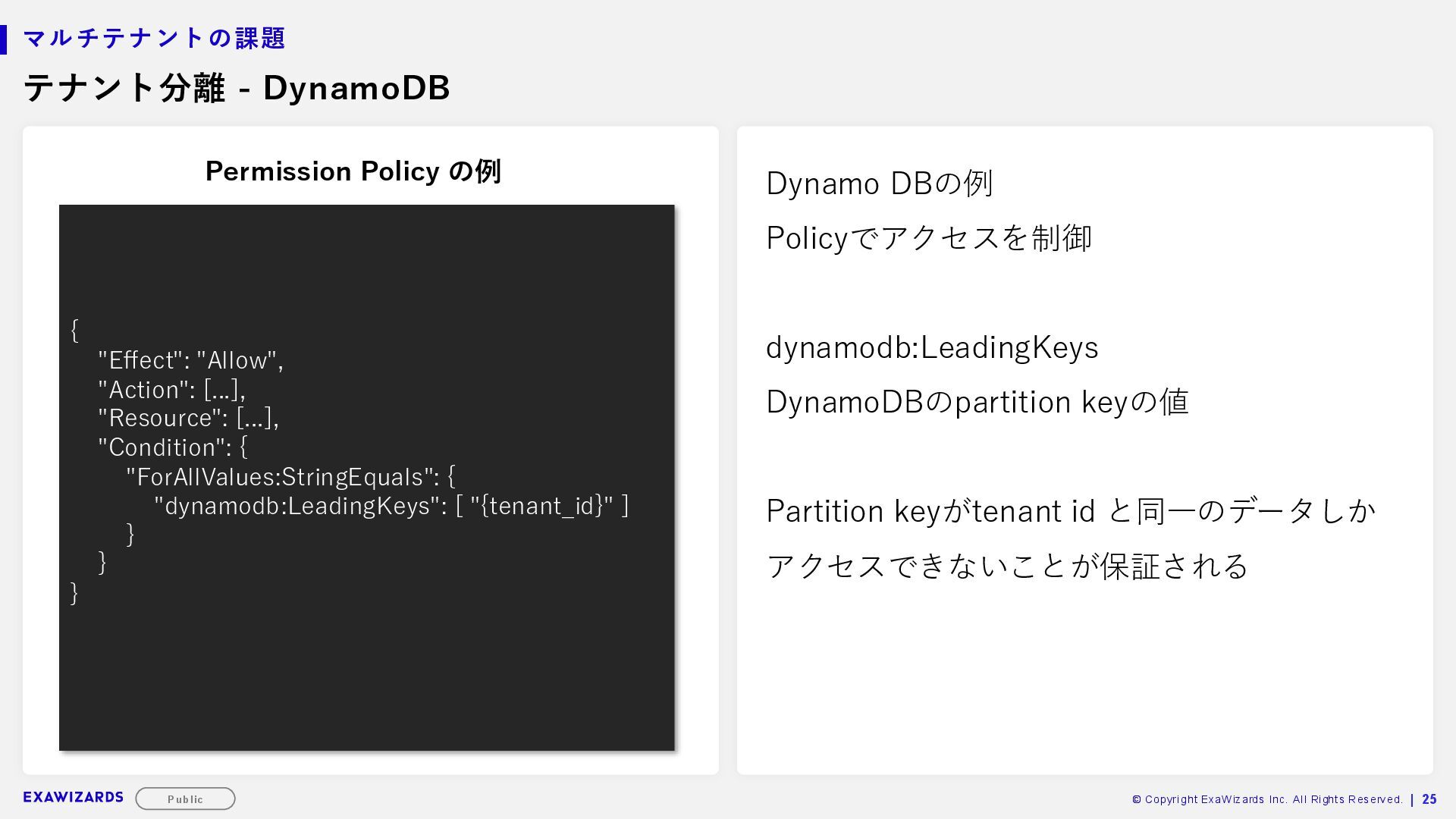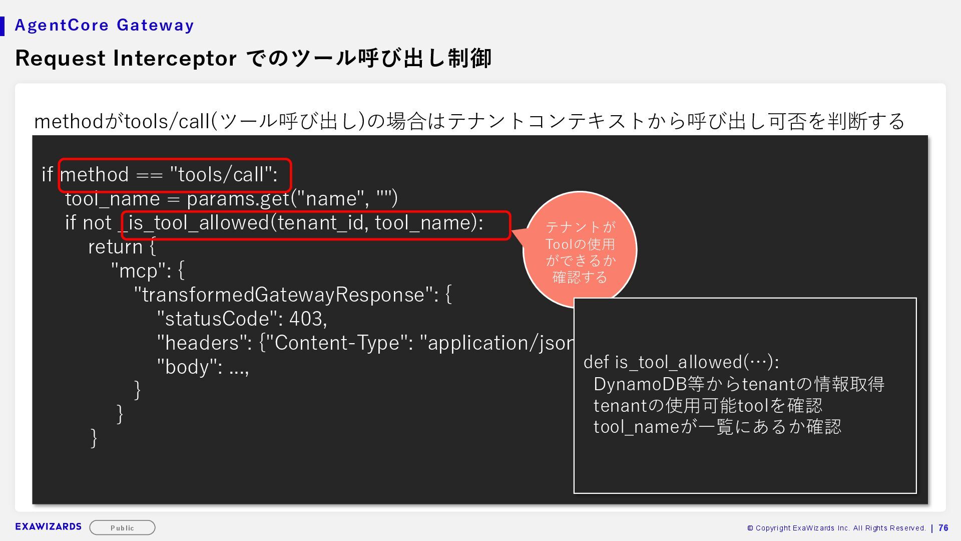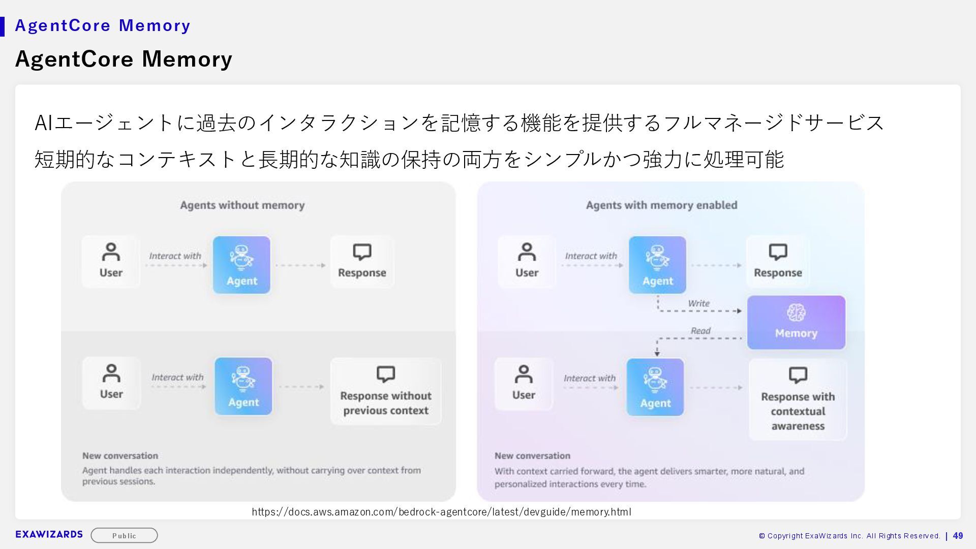 s R es erv ed. AgentCore Memory Memoryのテナント分離 - STS assumeRole Pub lic STSでassumeRoleを実行し、一時クレデンシャルを作成する def assume_tenant_role(tenant_id: str, user_id: str) -> Dict[str, str]: sts = boto3.client("sts", region_name=AWS_REGION) resp = sts.assume_role( RoleArn=TENANT_ROLE_ARN, RoleSessionName="session_name", DurationSeconds=900, Tags=[{"Key": "actorId", "Value": f"{tenant_id}:{user_id}"], ) creds = resp["Credentials"] return { "access_key": creds["AccessKeyId"], "secret_key": creds["SecretAccessKey"], "session_token": creds["SessionToken"], }