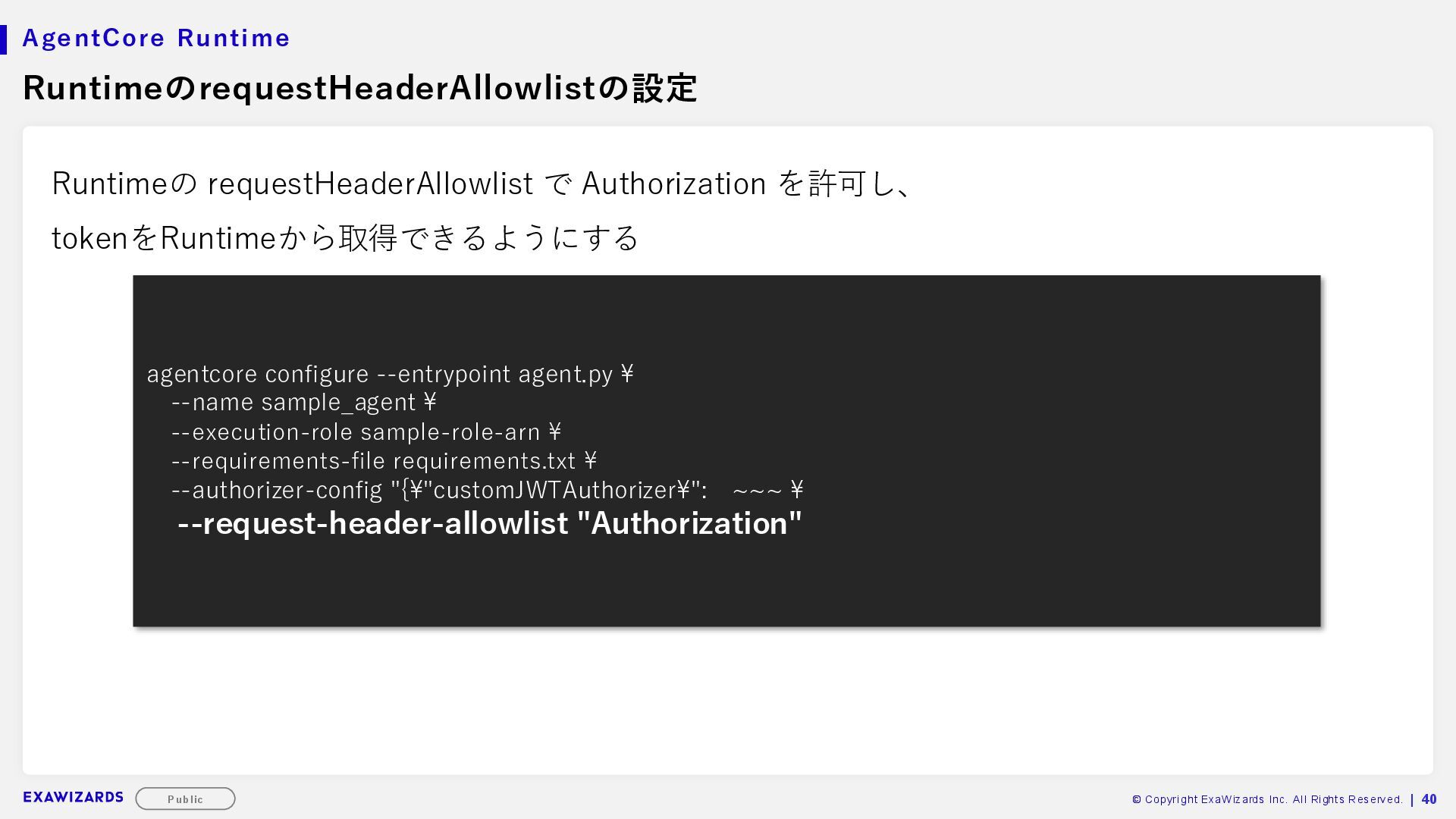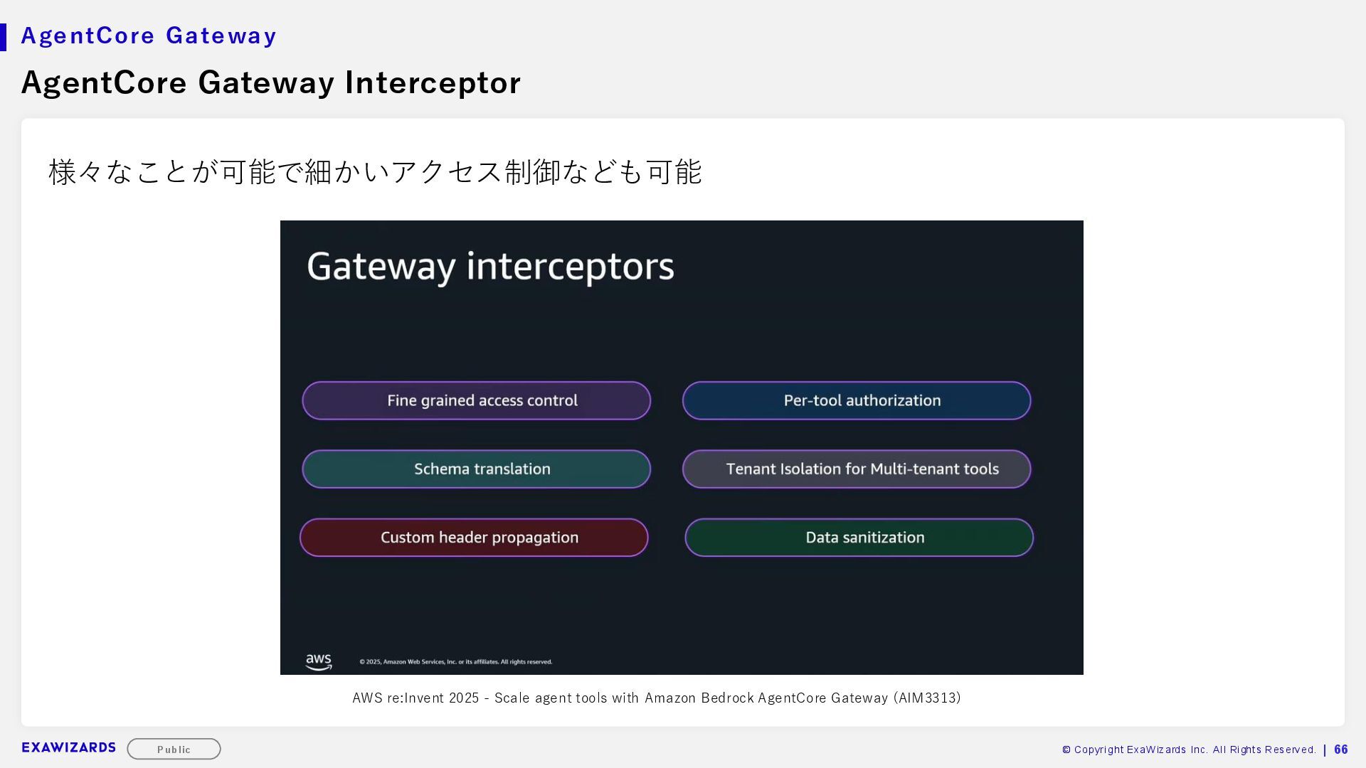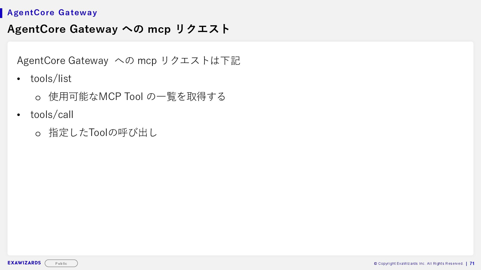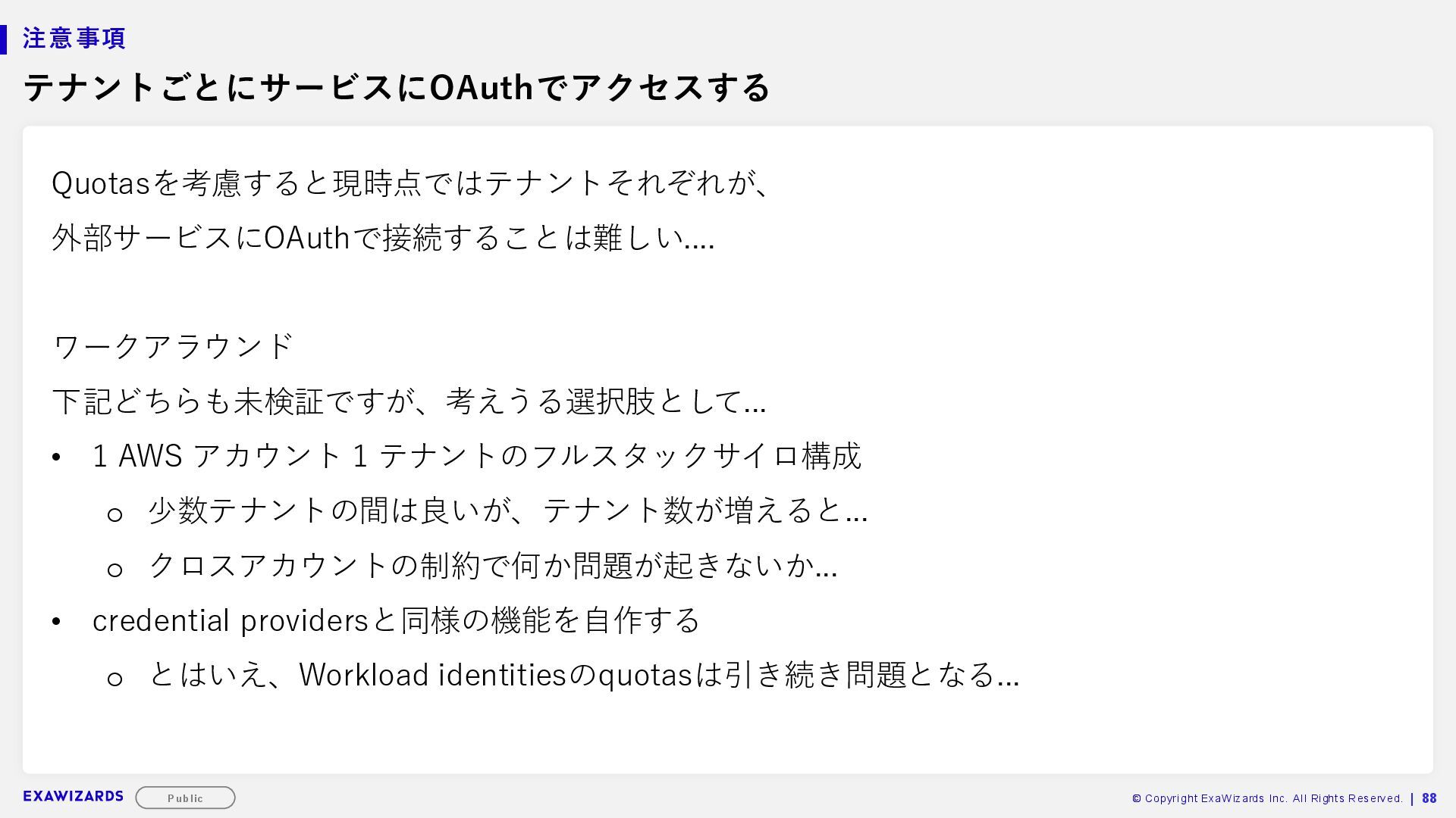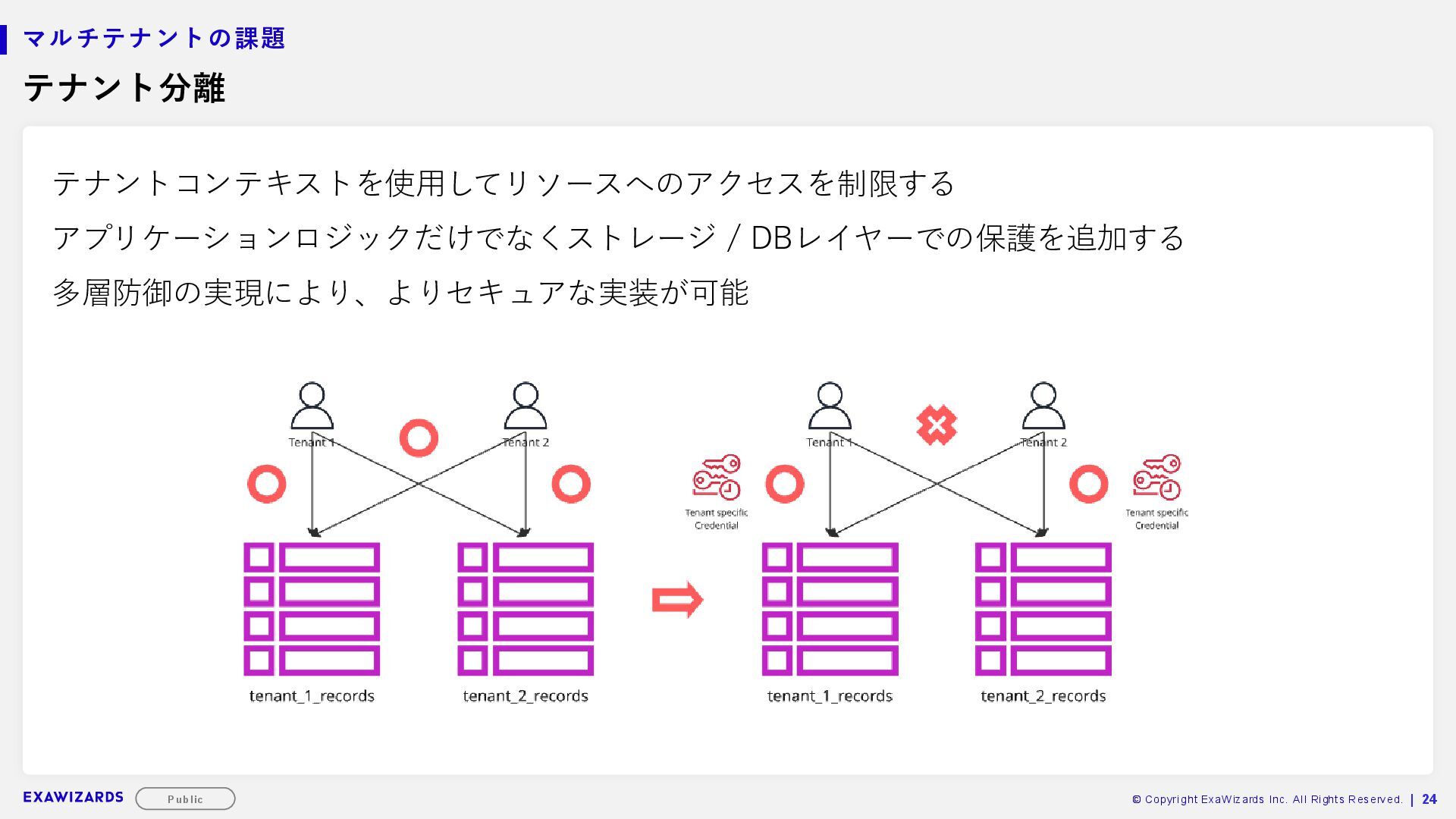 s R es erv ed. AgentCore Memory Memoryのテナント分離 - STS assumeRole Pub lic STSでassumeRoleを実行し、一時クレデンシャルを作成する def assume_tenant_role(tenant_id: str, user_id: str) -> Dict[str, str]: sts = boto3.client("sts", region_name=AWS_REGION) resp = sts.assume_role( RoleArn=TENANT_ROLE_ARN, RoleSessionName="session_name", DurationSeconds=900, Tags=[{"Key": "actorId", "Value": f"{tenant_id}:{user_id}"], ) creds = resp["Credentials"] return { "access_key": creds["AccessKeyId"], "secret_key": creds["SecretAccessKey"], "session_token": creds["SessionToken"], }