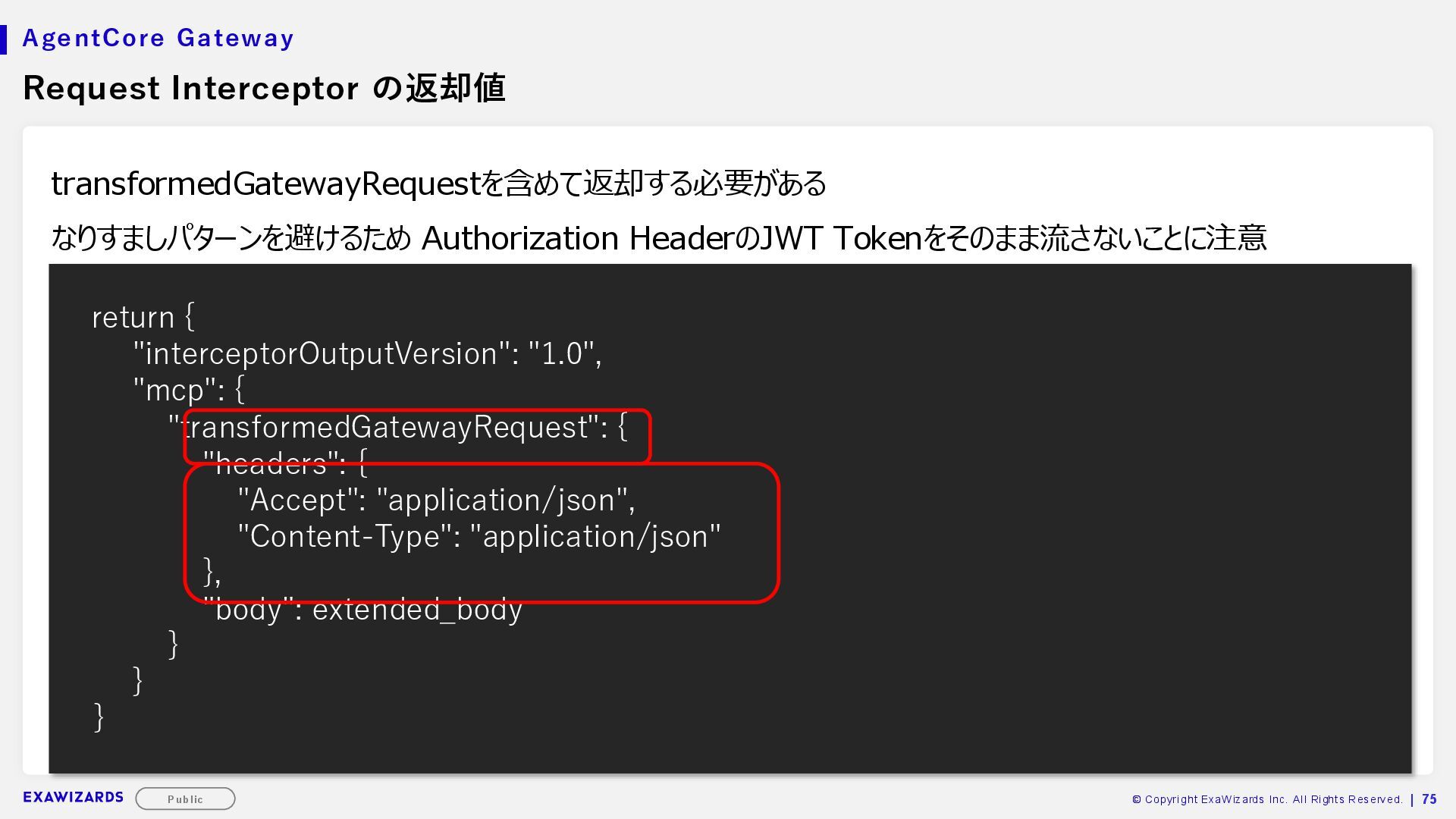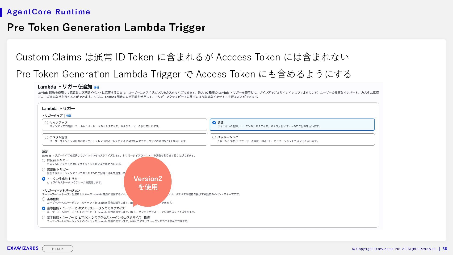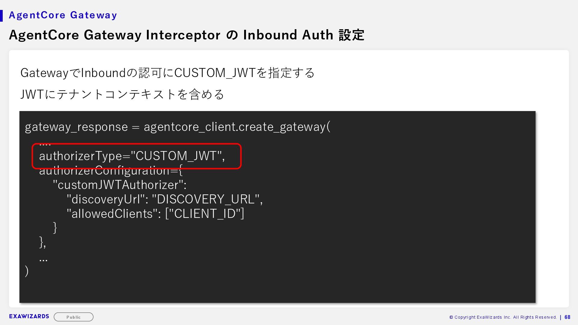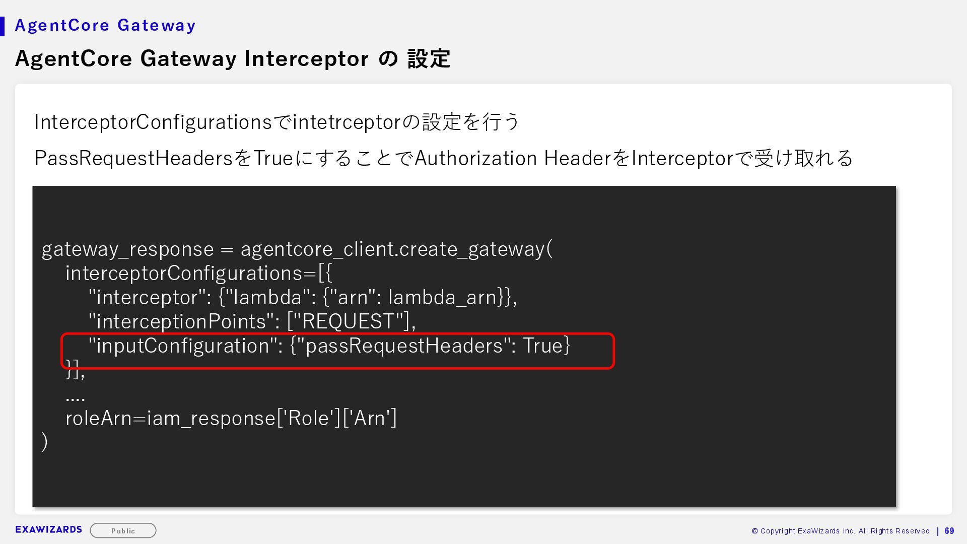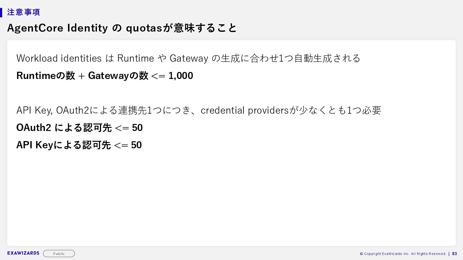 s R es erv ed. AgentCore Memory Memoryのテナント分離 - STS assumeRole Pub lic STSでassumeRoleを実行し、一時クレデンシャルを作成する def assume_tenant_role(tenant_id: str, user_id: str) -> Dict[str, str]: sts = boto3.client("sts", region_name=AWS_REGION) resp = sts.assume_role( RoleArn=TENANT_ROLE_ARN, RoleSessionName="session_name", DurationSeconds=900, Tags=[{"Key": "actorId", "Value": f"{tenant_id}:{user_id}"], ) creds = resp["Credentials"] return { "access_key": creds["AccessKeyId"], "secret_key": creds["SecretAccessKey"], "session_token": creds["SessionToken"], }