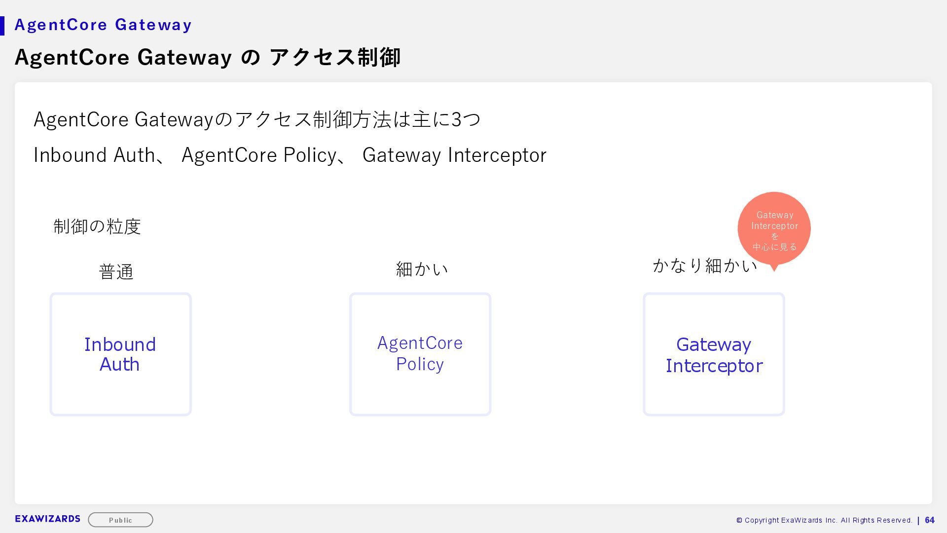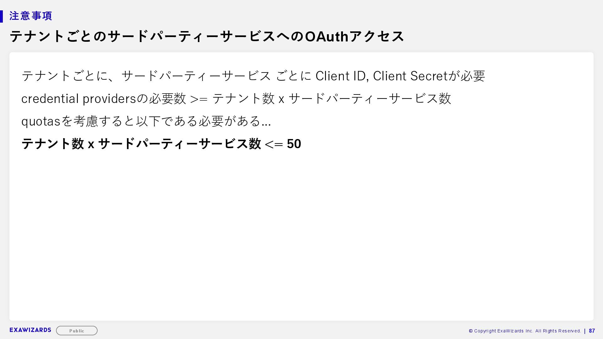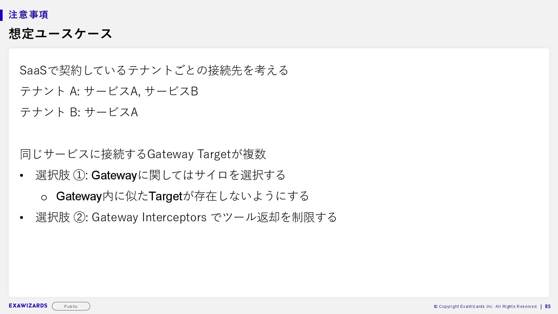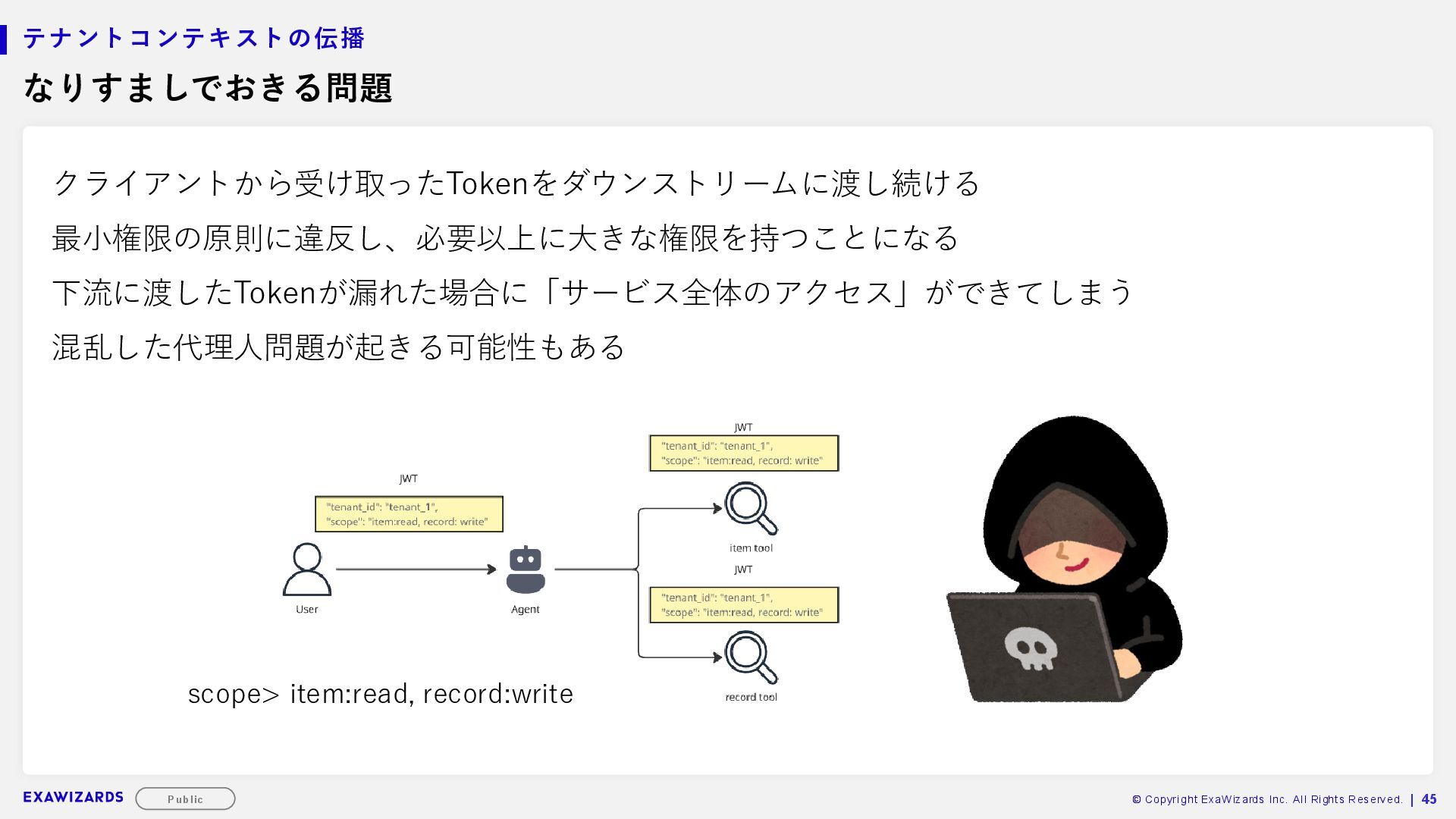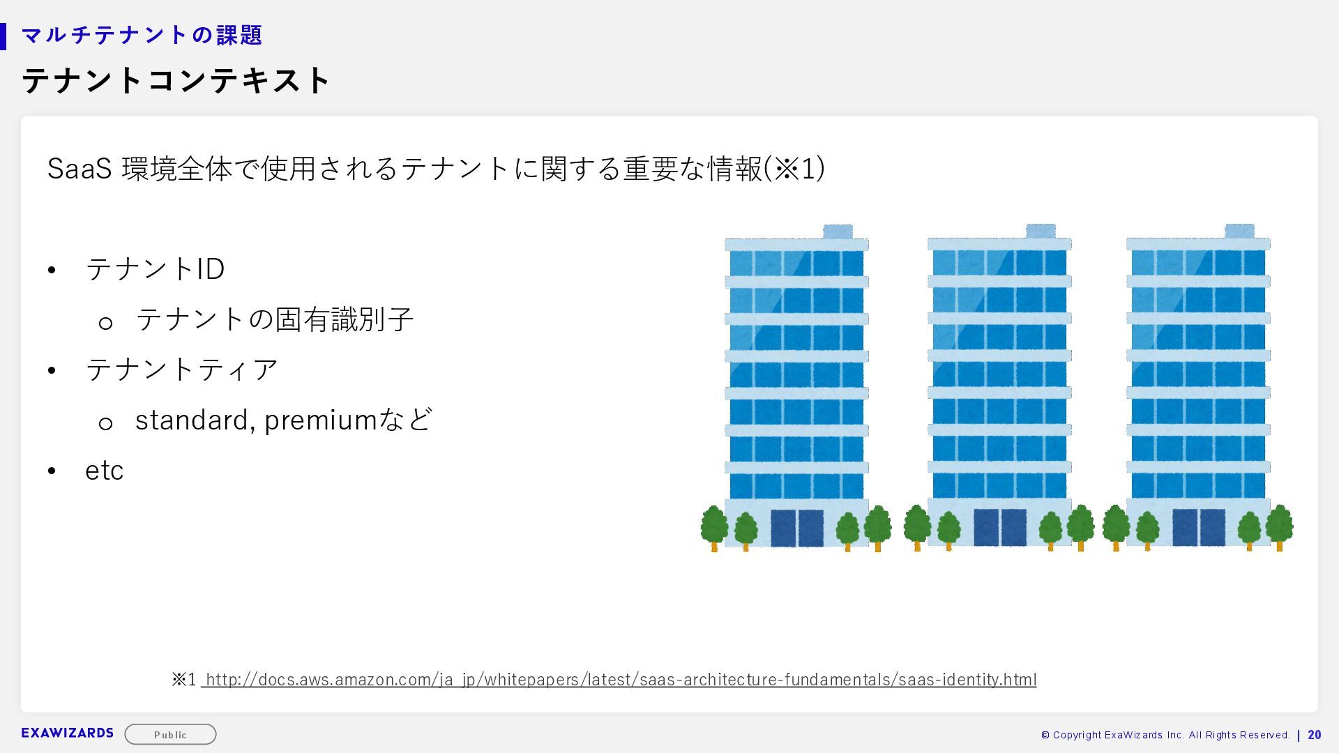 s R es erv ed. AgentCore Memory Memoryのテナント分離 - STS assumeRole Pub lic STSでassumeRoleを実行し、一時クレデンシャルを作成する def assume_tenant_role(tenant_id: str, user_id: str) -> Dict[str, str]: sts = boto3.client("sts", region_name=AWS_REGION) resp = sts.assume_role( RoleArn=TENANT_ROLE_ARN, RoleSessionName="session_name", DurationSeconds=900, Tags=[{"Key": "actorId", "Value": f"{tenant_id}:{user_id}"], ) creds = resp["Credentials"] return { "access_key": creds["AccessKeyId"], "secret_key": creds["SecretAccessKey"], "session_token": creds["SessionToken"], }
