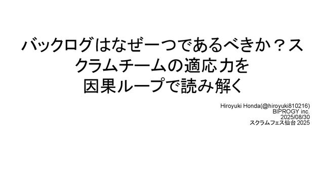 バックログはなぜ一つであるべきか?ス クラムチームの適応力を 因果ループで読み解く Hiroyuki Honda(@hiroyuki810216) BIPROGY inc. 2025/08/30 スクラムフェス仙台 2025