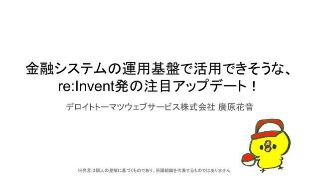 Fin-JAWS re:Capイベントで発表させていただいた「金融システムの運用基盤で活用できそうな、re:Invent発の注目アップデート!」の資料になります。 re:Inventで発表されたアップデートの中から、個人的に注目した運用やセキュリティ系のものをピックアップしました!