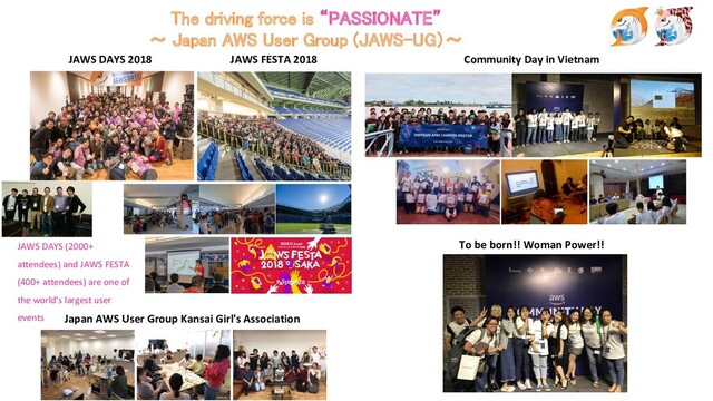 (JAWS-UG)〜 JAWS DAYS 2018 JAWS FESTA 2018 Community Day in Vietnam Japan AWS User Group Kansai Girl's Association To be born!! Woman Power!! JAWS DAYS (2000+ attendees) and JAWS FESTA (400+ attendees) are one of the world's largest user events