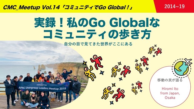 2014年 韓国UGと共催の AWSミートアップ@韓国 に参加/登壇 2016年 2018年 AWS Samurai 2017 Special Thanks受賞 JAWS DAYS2018実⾏委員⻑ タイUG・韓国UGとAWSミートアップ @タイに参加/登壇 Community Day Vietnam&APACリー ダーズミートアップ @ベトナムに参加/登壇 JAWS FESTA2018 運営 re:Invent2018 ユーザーグループリー ダーズミートアップ @ラスベガスで⽇本代表スピーカー 2019年 AWS Asian Women Association (AAWA)発⾜ AAWA第⼀回イベント @シンガポールで開催/実⾏委員⻑ Community Day Melbourne&APAC リーダーズミートアップ @メルボルンに参加/登壇 re:Invent2019 Community Leader Diversity Grant 受賞 @ラスベガスで何かする ͲΜͳ͜ͱ͖ͯͨ͠ʁ d"84ฤd ࢲͱ"84ͱίϛϡχςΟ