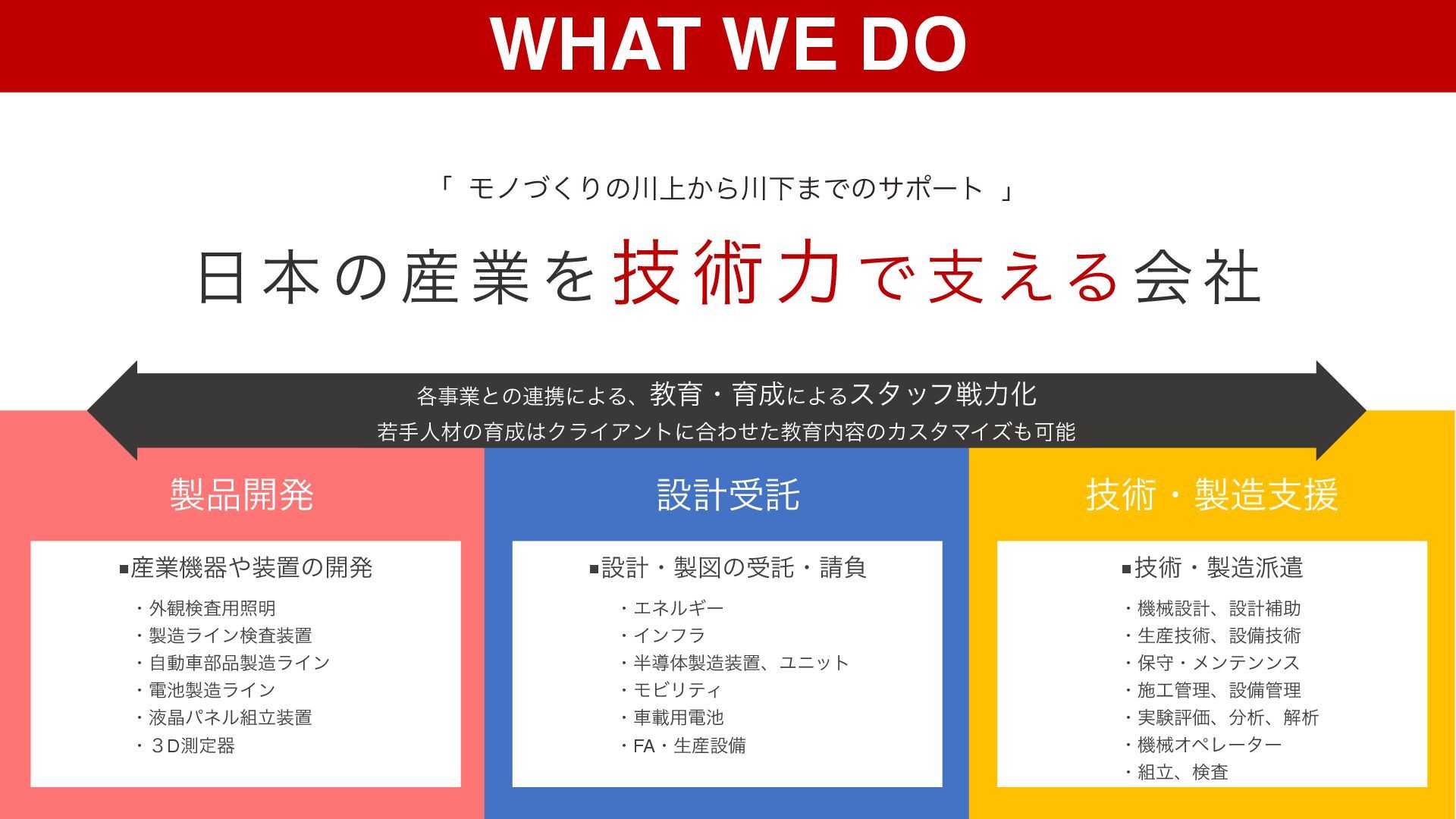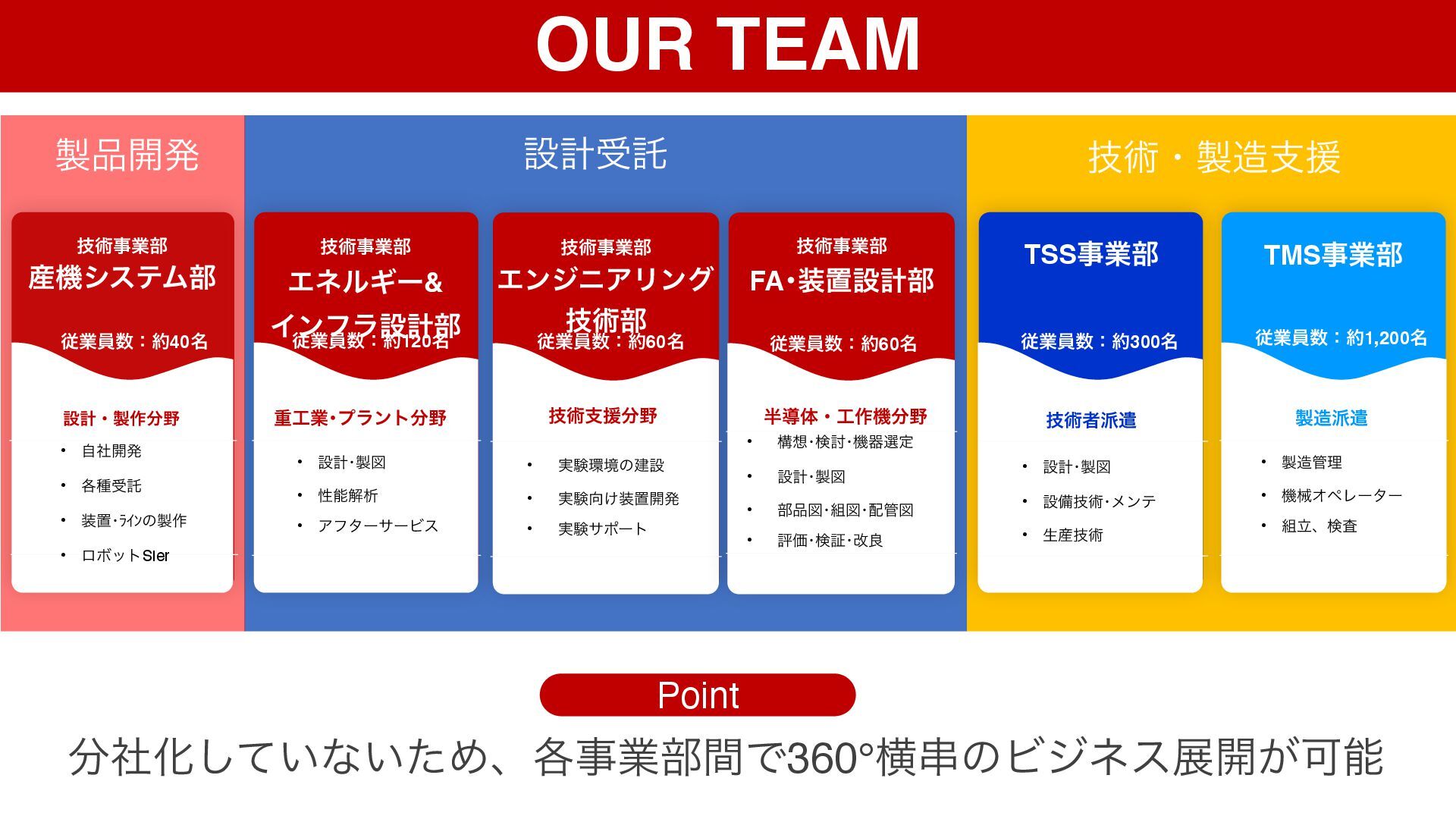 ஔŋŽŘƃͷ࡞ • ϩϘοτSIer ैۀһɿ40໊ ٕज़ऀݣ • ઃܭŋਤ • ઃඋٕज़ŋϝϯς • ੜ࢈ٕज़ TSSࣄۀ෦ ैۀһɿ300໊ ॏۀŋϓϥϯτ ٕज़ࣄۀ෦ ΤωϧΪʔ& Πϯϑϥઃܭ෦ • ઃܭŋਤ • ੑೳղੳ • ΞϑλʔαʔϏε ैۀһɿ120໊ ݣ TMSࣄۀ෦ • ཧ • ػցΦϖϨʔλʔ • ཱɺݕࠪ ैۀһɿ1,200໊ ࣾԽ͍ͯ͠ͳ͍ͨΊɺ֤ࣄۀ෦ؒͰ360°ԣ۲ͷϏδωεల։͕Մೳ Point ٕज़ࢧԉ ٕज़ࣄۀ෦ ΤϯδχΞϦϯά ٕज़෦ • ࣮ݧڥͷݐઃ • ࣮ݧ͚ஔ։ൃ • ࣮ݧαϙʔτ ैۀһɿ60໊ ಋମɾ࡞ػ ٕज़ࣄۀ෦ FAŋஔઃܭ෦ • ߏŋݕ౼ŋػثબఆ • ઃܭŋਤ • ෦ਤŋਤŋਤ • ධՁŋݕূŋվྑ ैۀһɿ60໊ ઃܭडୗ ։ൃ ٕज़ɾࢧԉ