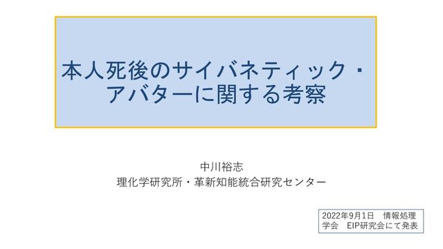 Dead Social http://deadsocial.org/ Pre- recorded Social Lives On https://twitter.com/_liveson?lang=en Algorithm Twitter Eterni.me eterni.me Algorithm n/a Futuris.tk Futuris.tk Pre- recorded Social Deathswitc h http://www.deathswitch.com/ Pre- recorded Email Great Goodbye http://www.greatgoodbye.com/ Pre- recorded Email AssetLock http://www.assetlock.net/ Pre- recorded Email Afternote http://www.afternote.com/ Pre- recorded Email Bcelebrate d http://www.bcelebrated.com/ Pre- recorded Email/Web Boxego http://www.boxego.com/ Pre- recorded Web Ghostmem o www.ghostmemo.com Pre- recorded Social GoneNotGo ne www.gonenotgone.com Pre- recorded Social Last Words 2 Love www.lastwords2love.com Pre- recorded Social MyWonder fulLife www.mywonderfullife.com Pre- recorded n/a MyGoodby eMessage www.mygoodbyemessage.com Pre- recorded n/a Postumo postumo.info Pre- recorded n/a Remember -Me www.remember-me.co Pre- recorded n/a SafeBeyon d www.safebeyond.com/ Pre- recorded n/a SayGoodb ye.Online saygoodbye.online/ Pre- recorded n/a Wishes Keeper www.wisheskeeper.com Pre- recorded n/a Xarona www.xarona.com Pre- recorded n/a If I Die https://twitter.com/ifidie Pre- recorded Social Virtual Eternity VirtualEternity.com Algorithm n/a Project Elysium - Algorithm n/a Loggacy www.loggacy.com Pre- recorded n/a Meminto meminto.com Pre- recorded n/a Leg8cy www.leg8cy.com Pre- recorded Social LifeNaut lifenaut.com Back-up n/a LifePosts www.lifeposts.com Pre- recorded n/a Öhman & Luciano Floridi(2017)に掲載されている死後の 個人データに関するサービスの約60個のリストの一部 死後の個人データを対象 にしたの公開利用の ビジネスが既に多数存在 背景