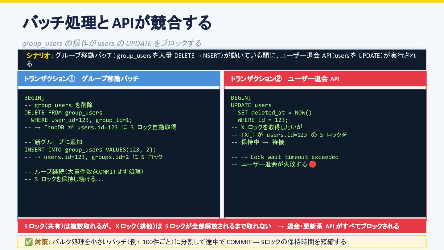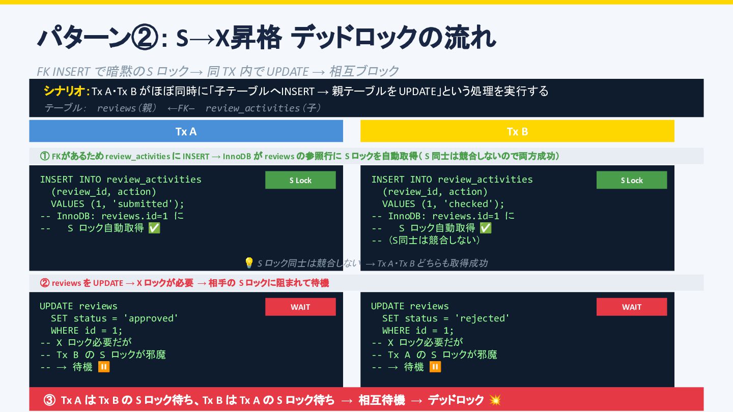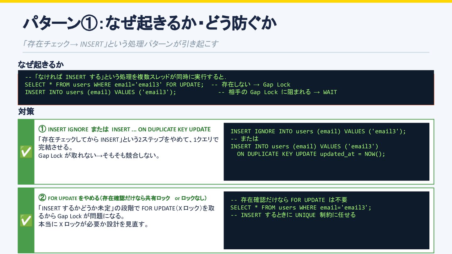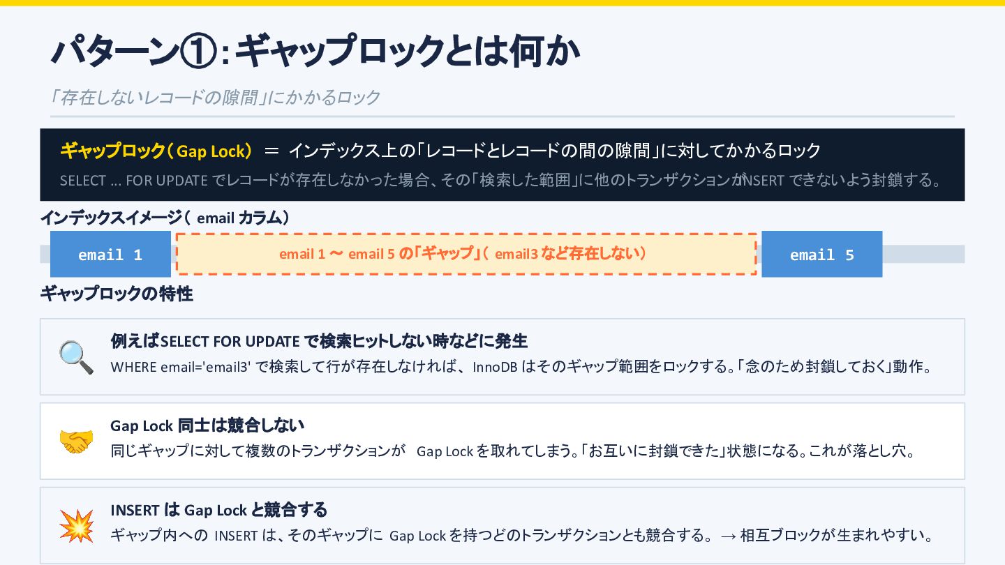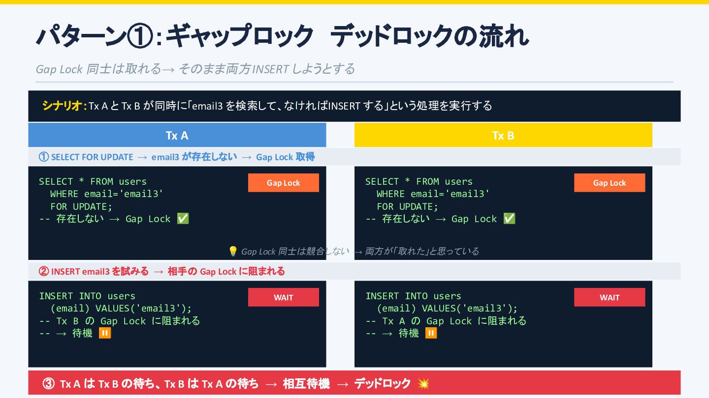 [email protected]','Bob') ← クエリB *** (2) HOLDS THE LOCK(S): index idx_email of table 'app'.'users' trx id 422 lock_mode X locks gap before rec ← B も同じギャップロックを保持 *** (2) WAITING FOR THIS LOCK TO BE GRANTED: index idx_email of table 'app'.'users' trx id 422 lock_mode X locks gap before rec insert intention waiting ← A のギャップロックに阻まれている *** WE ROLL BACK TRANSACTION (2) ← ⑤ TX(2)=クエリBがロールバック対象 読み方まとめ : ① どのクエリか → ② 何を持っているか → ③ 何を待っているか → ④ 相手も同じ構造か(=相互待機) → ⑤ どちらが ロールバックされたか