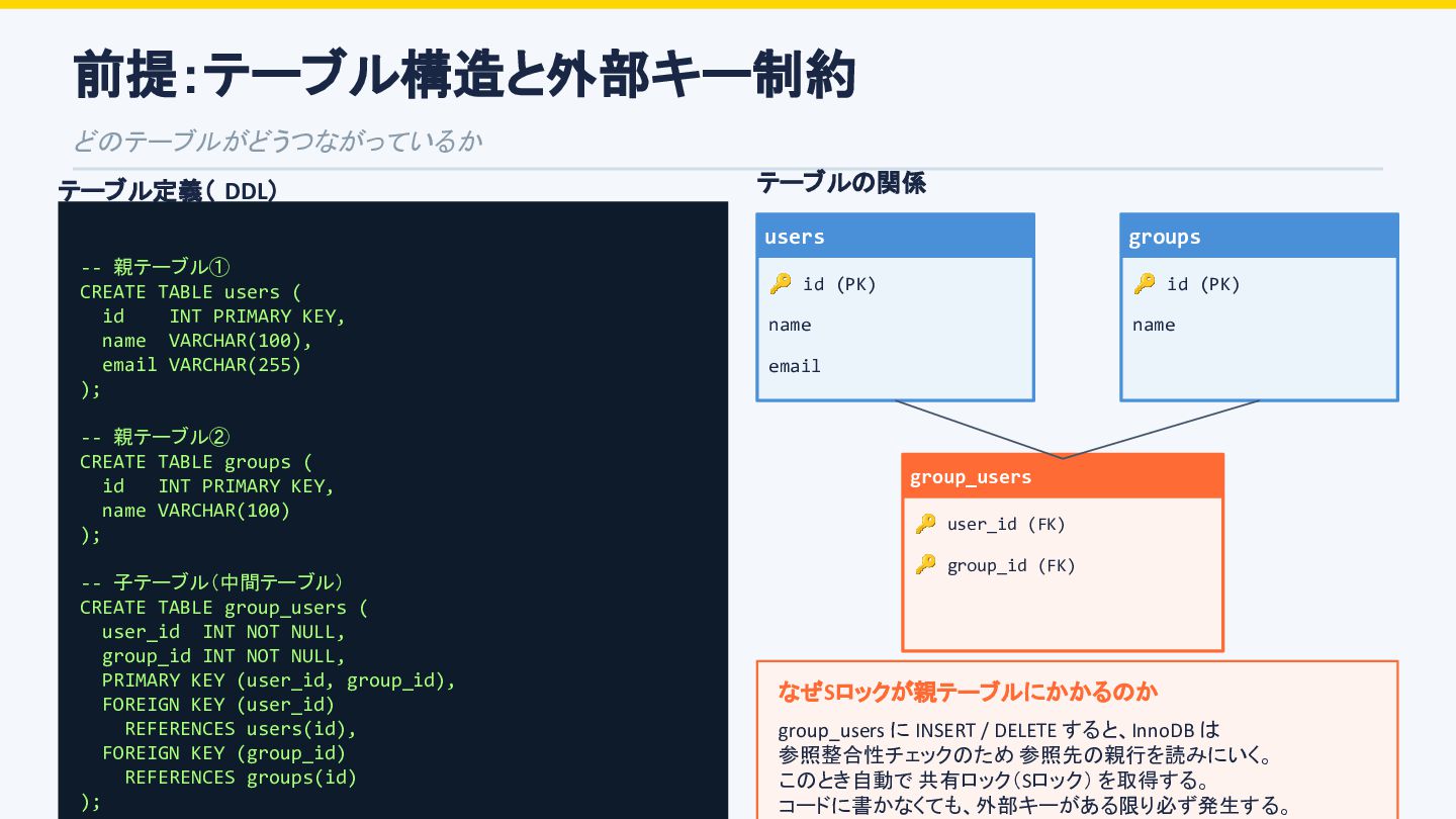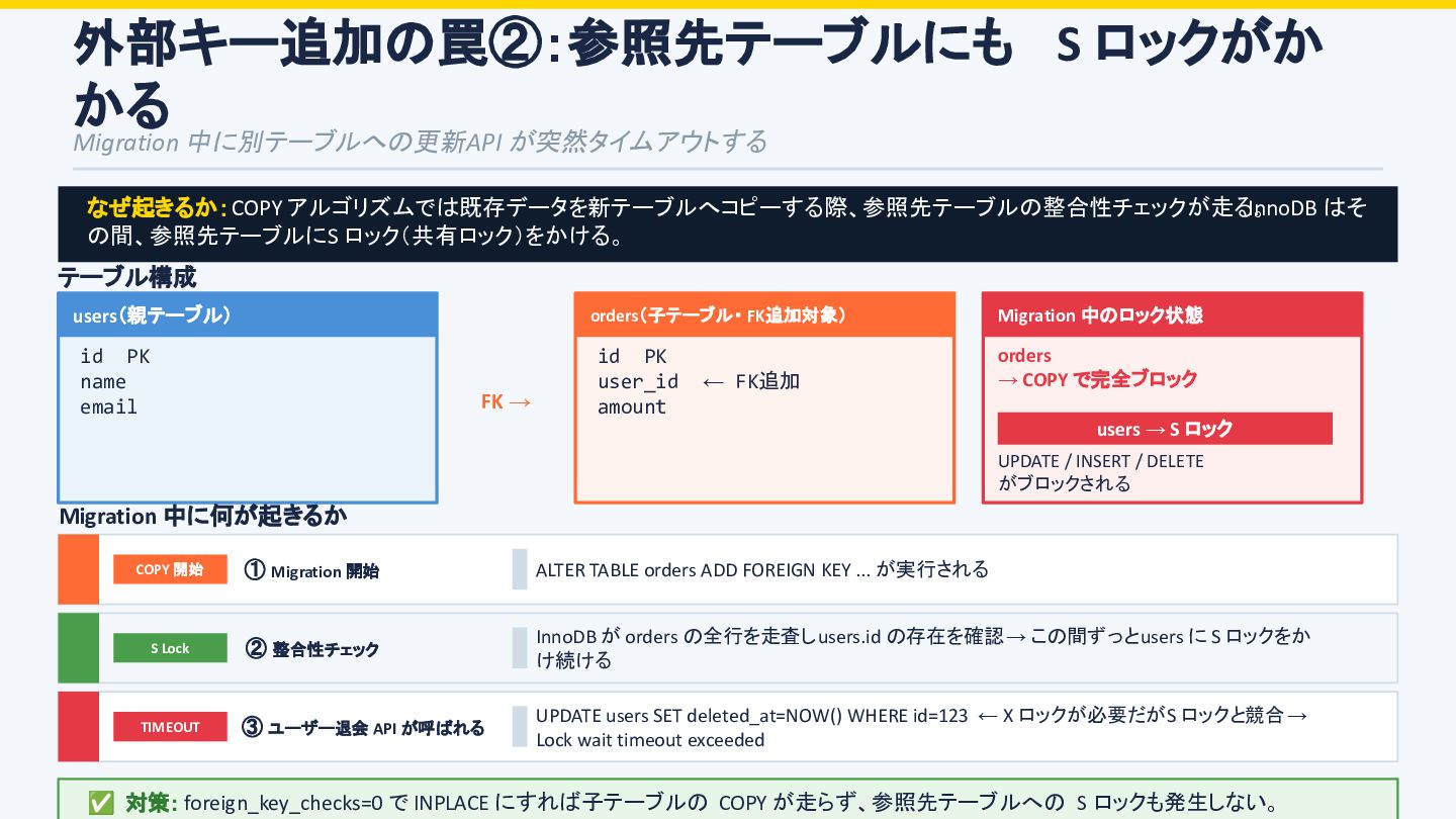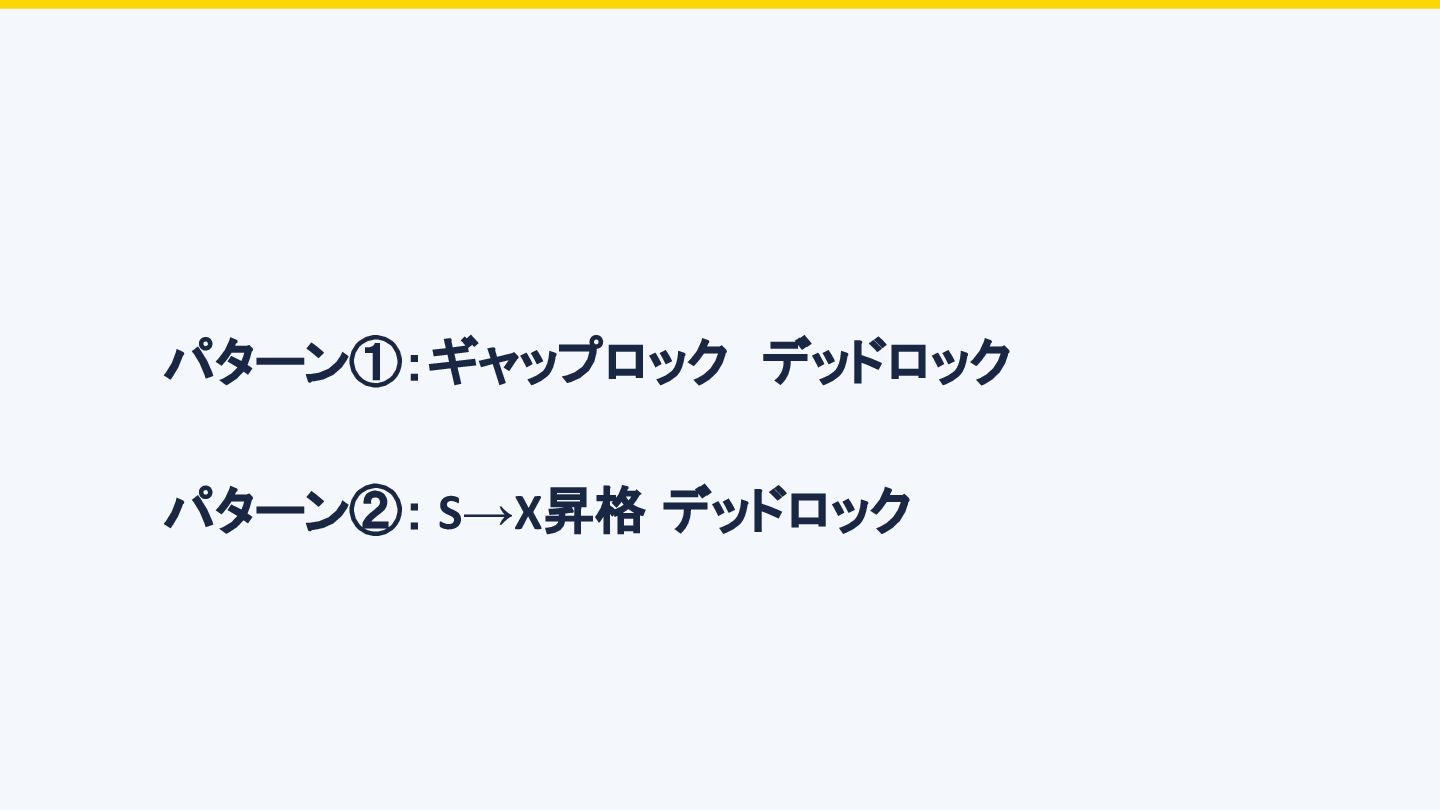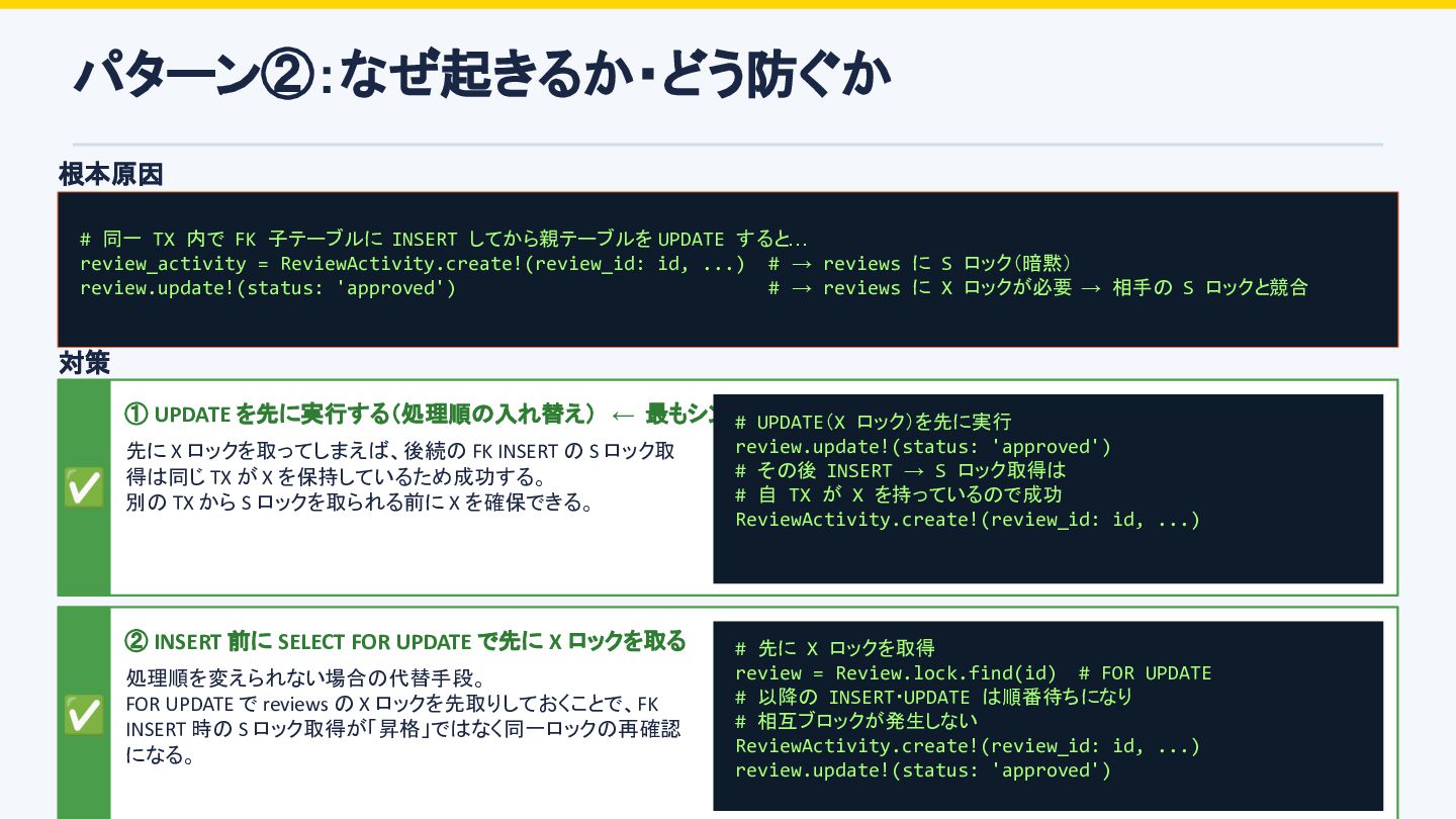 [email protected]','Bob') ← クエリB *** (2) HOLDS THE LOCK(S): index idx_email of table 'app'.'users' trx id 422 lock_mode X locks gap before rec ← B も同じギャップロックを保持 *** (2) WAITING FOR THIS LOCK TO BE GRANTED: index idx_email of table 'app'.'users' trx id 422 lock_mode X locks gap before rec insert intention waiting ← A のギャップロックに阻まれている *** WE ROLL BACK TRANSACTION (2) ← ⑤ TX(2)=クエリBがロールバック対象 読み方まとめ : ① どのクエリか → ② 何を持っているか → ③ 何を待っているか → ④ 相手も同じ構造か(=相互待機) → ⑤ どちらが ロールバックされたか