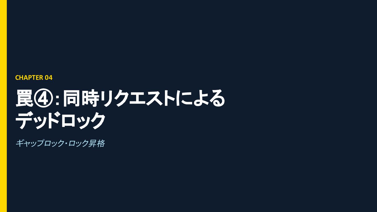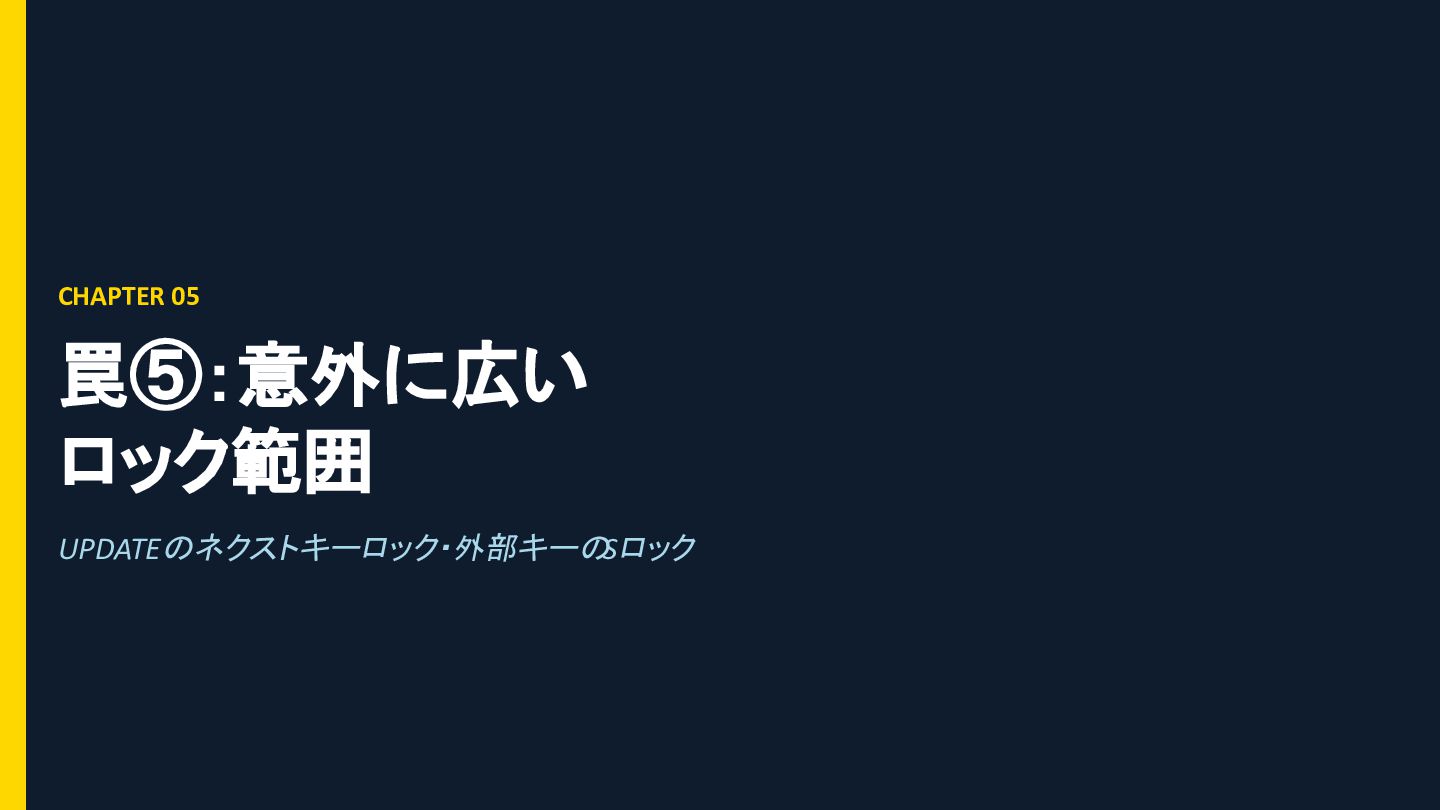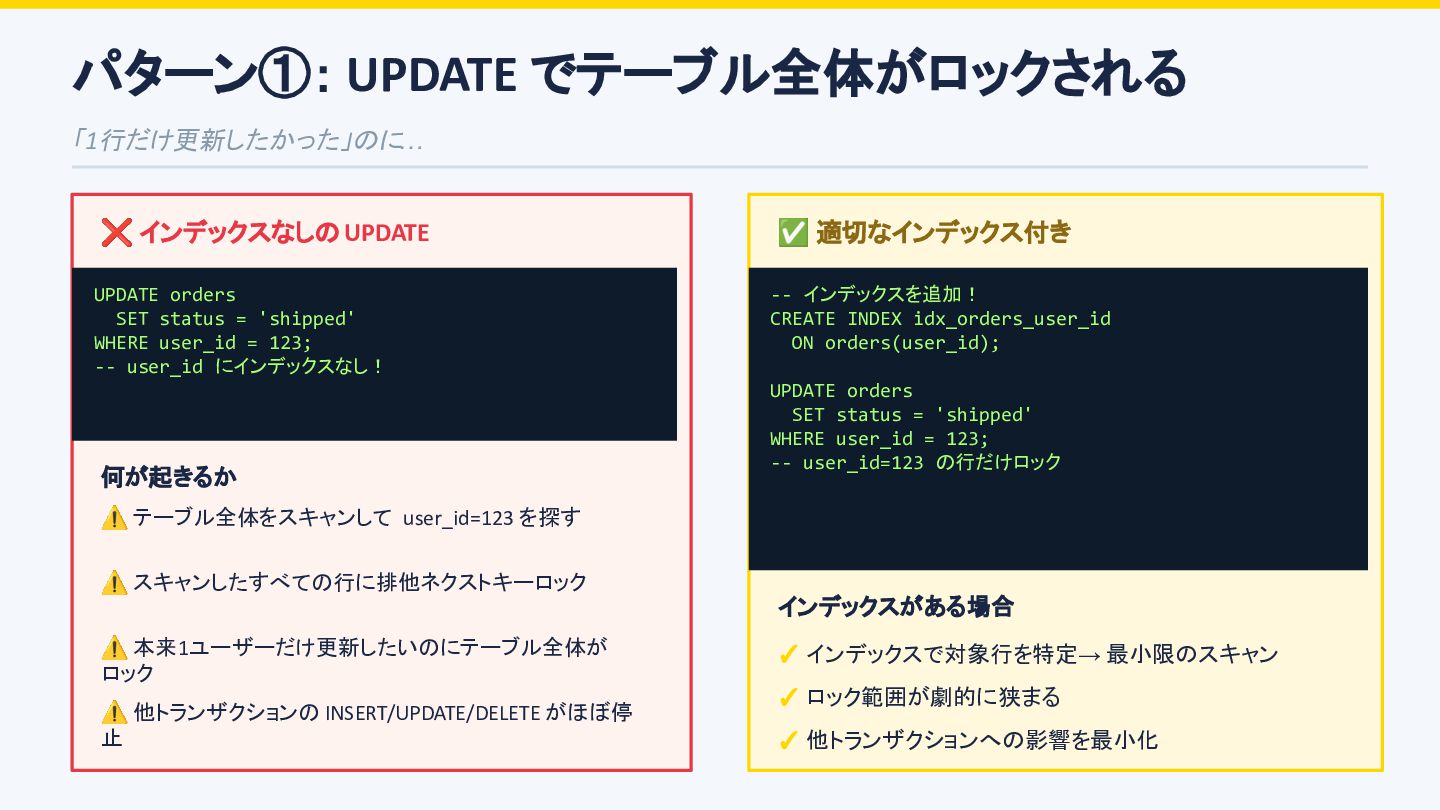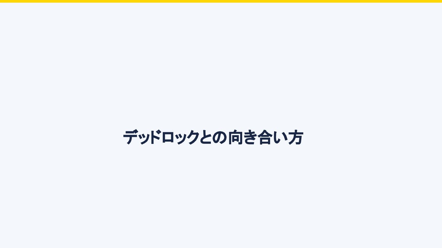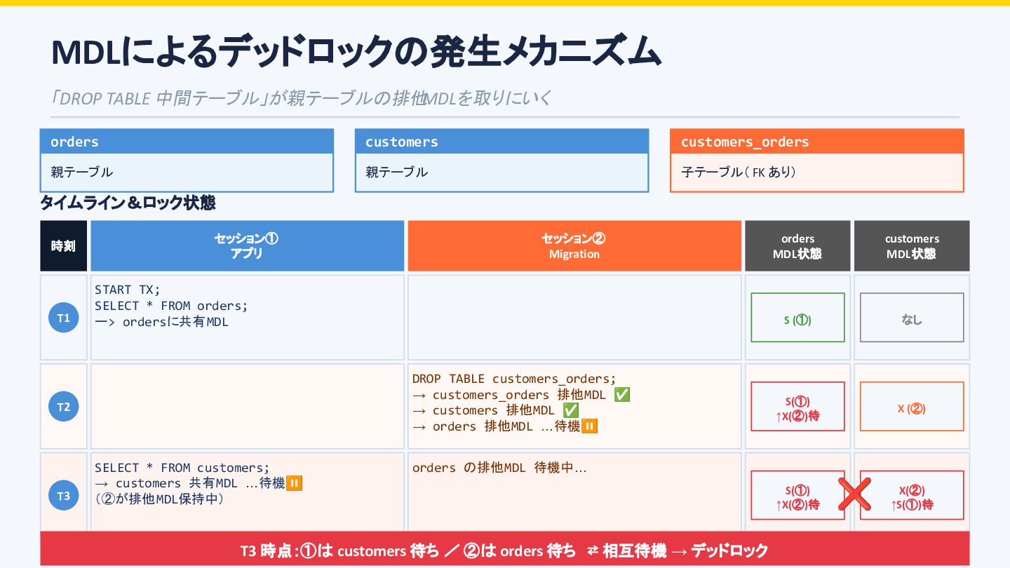 [email protected]','Bob') ← クエリB *** (2) HOLDS THE LOCK(S): index idx_email of table 'app'.'users' trx id 422 lock_mode X locks gap before rec ← B も同じギャップロックを保持 *** (2) WAITING FOR THIS LOCK TO BE GRANTED: index idx_email of table 'app'.'users' trx id 422 lock_mode X locks gap before rec insert intention waiting ← A のギャップロックに阻まれている *** WE ROLL BACK TRANSACTION (2) ← ⑤ TX(2)=クエリBがロールバック対象 読み方まとめ : ① どのクエリか → ② 何を持っているか → ③ 何を待っているか → ④ 相手も同じ構造か(=相互待機) → ⑤ どちらが ロールバックされたか
